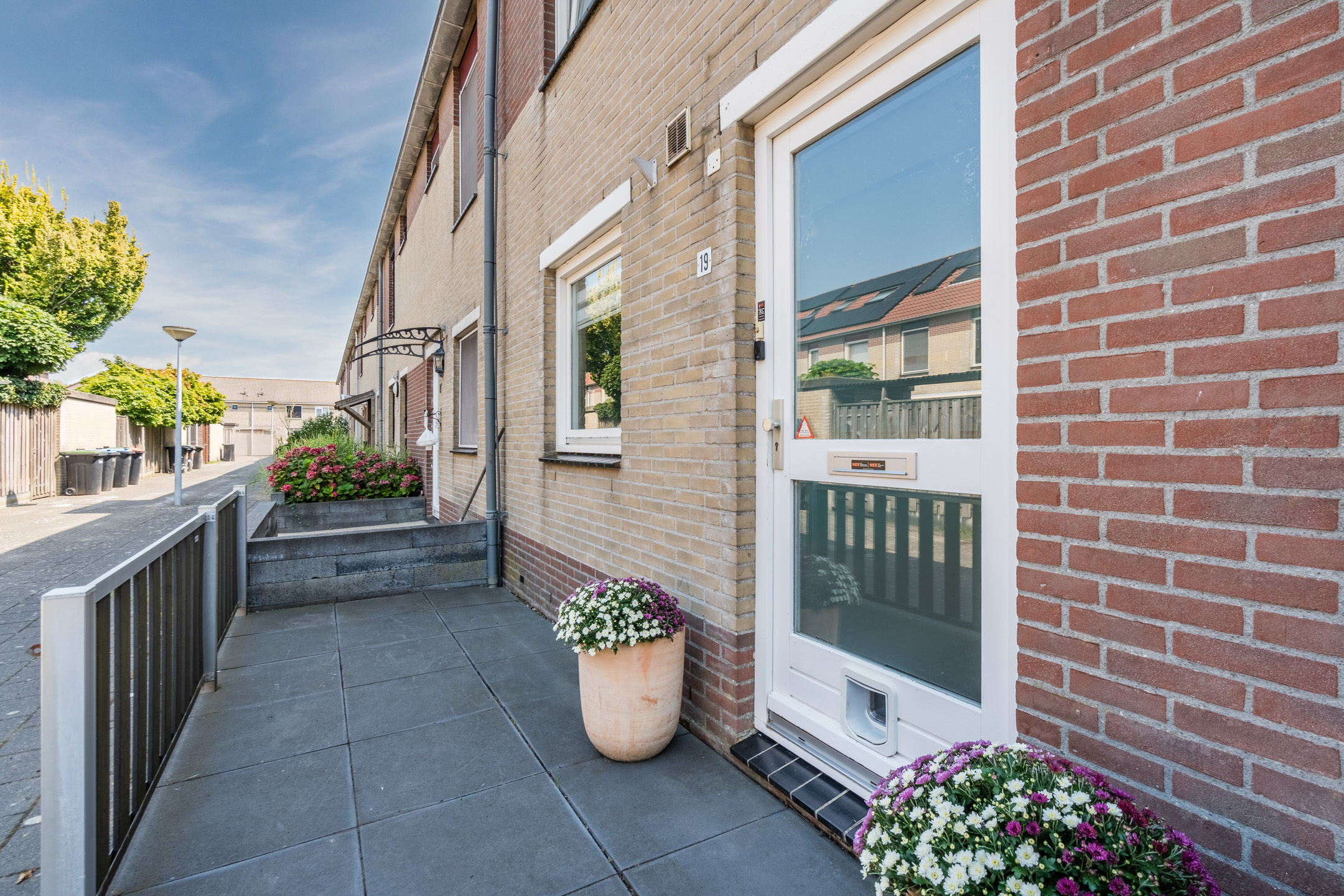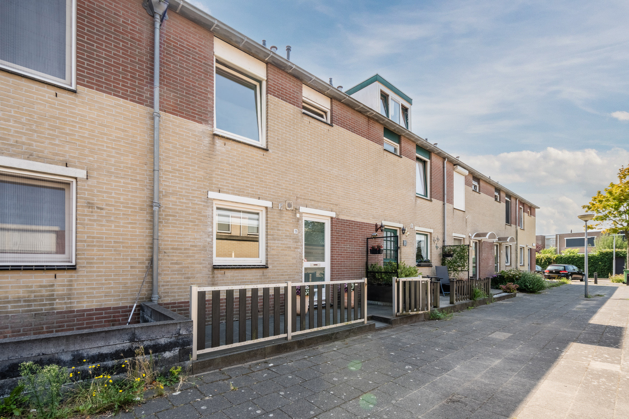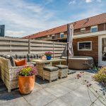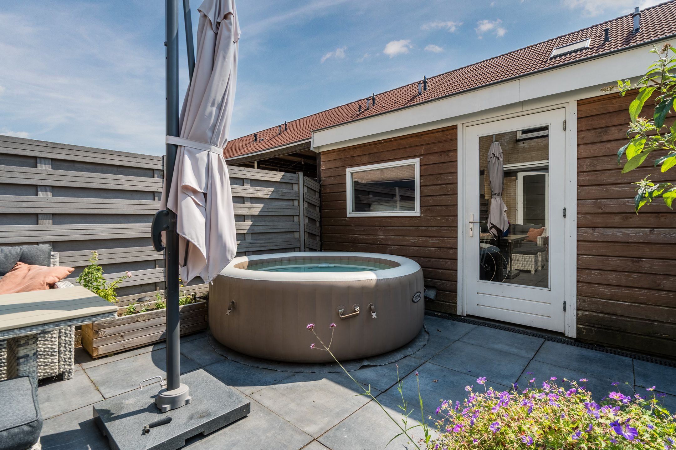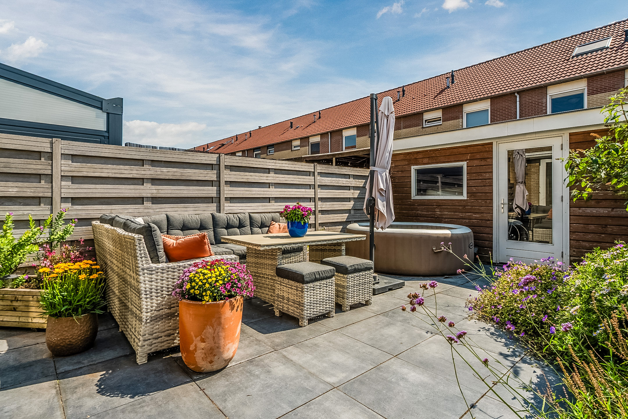Het huis beschikt over een fraai aangelegde en zonnige achtertuin. De tuin is sfeervol ingericht met zowel tegels als groen. Dankzij de ligging op het zuiden geniet je hier de hele dag van de zon. De houten schuttingen zorgen voor veel privacy, waardoor je in alle rust van het lekkere weer kunt genieten. Door de buitenzonwering is het ook mogelijk om schaduwplekken te creëren.
