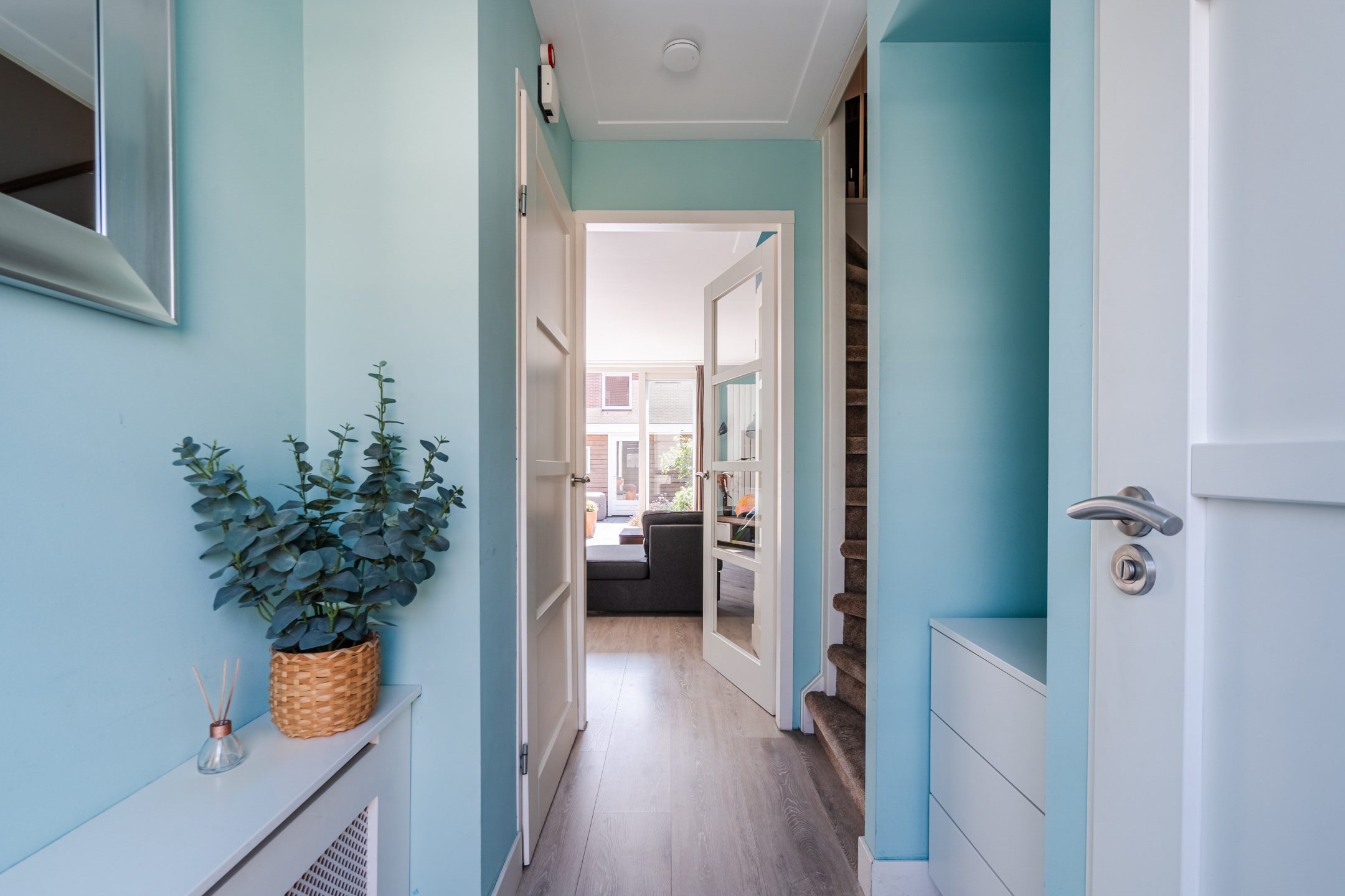 Via de kleine, netjes betegelde voortuin bereik je voordeur van deze charmante tussenwoning. Na binnenkomst word je verwelkomd in een ruime en fraai afgewerkte entreehal. Vanuit hier bereik je een nette toiletruimte met vloerverwarming, zwevend toilet en fonteintje, de meterkast, trap naar de eerste verdieping en de woonkamer.