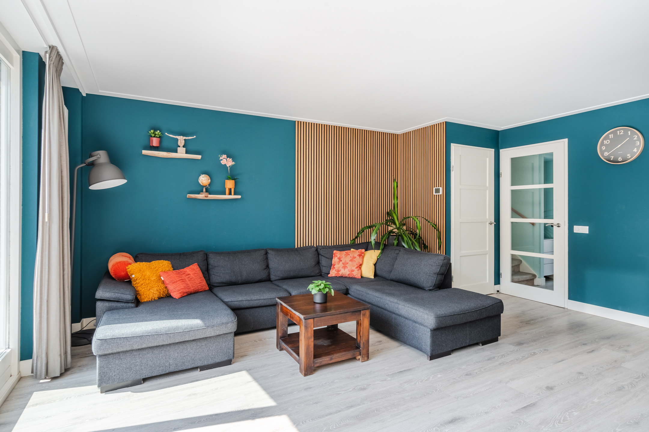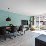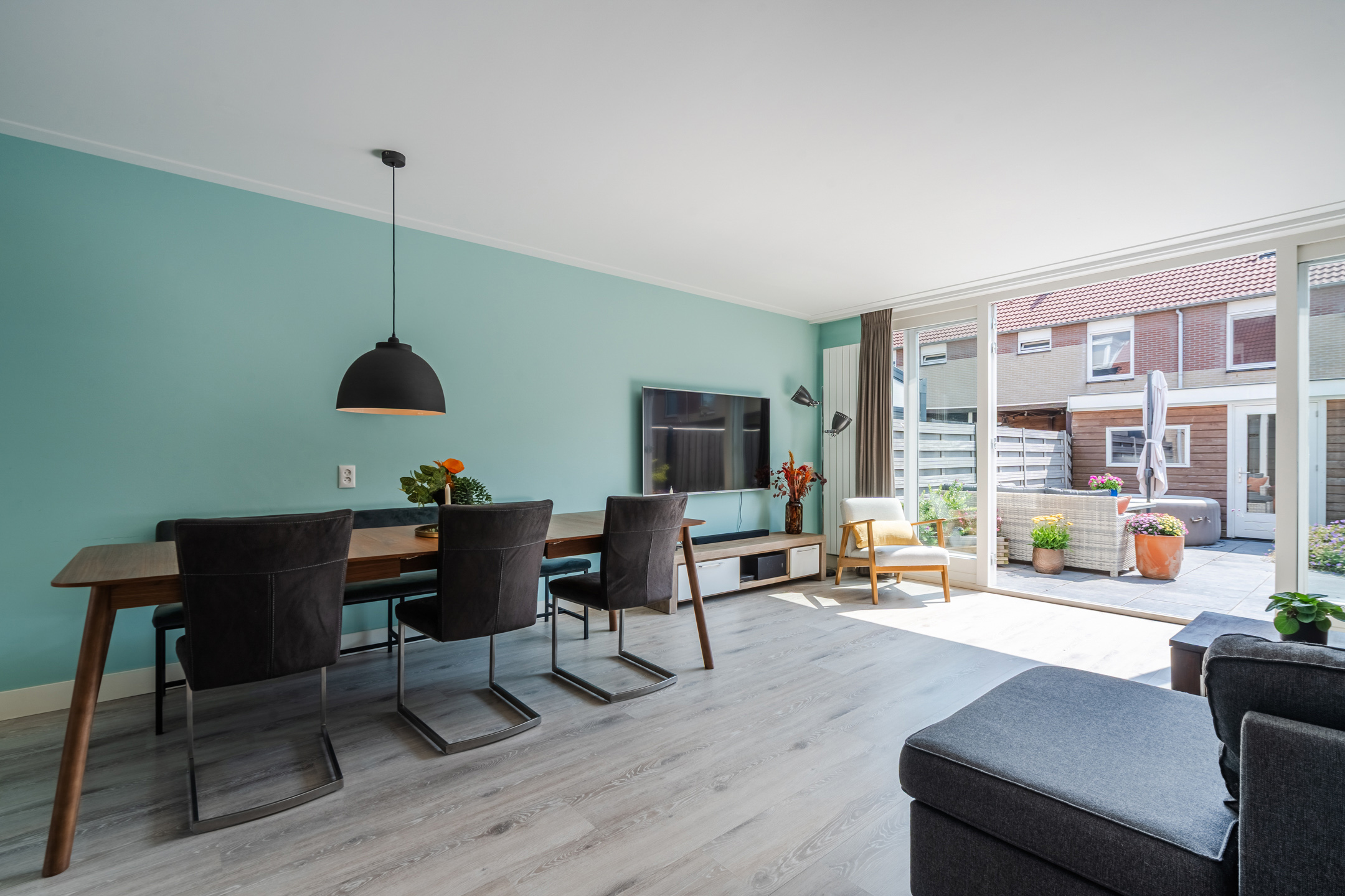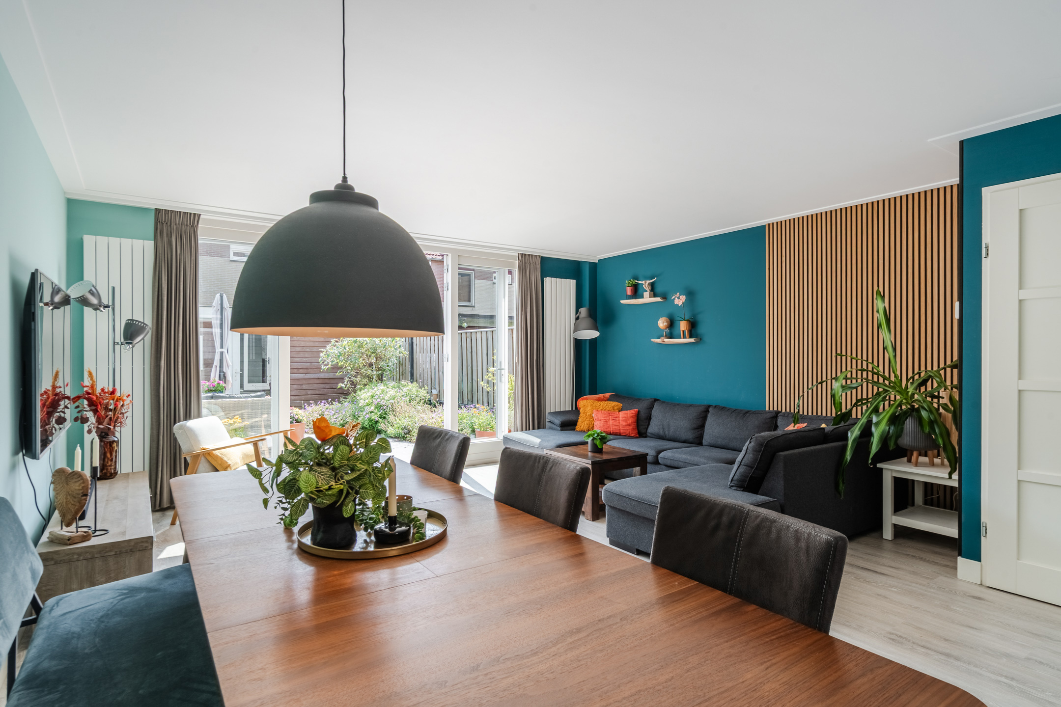 In de ruime en sfeervolle woonkamer ligt een mooie, lichte vloer. De muren zijn kleurrijk afgewerkt en deels voorzien van fraaie wandpanelen. Dankzij het grote raam aan de voorzijde en de openslaande tuindeuren aan de achterzijde valt er veel natuurlijk licht naar binnen.