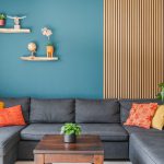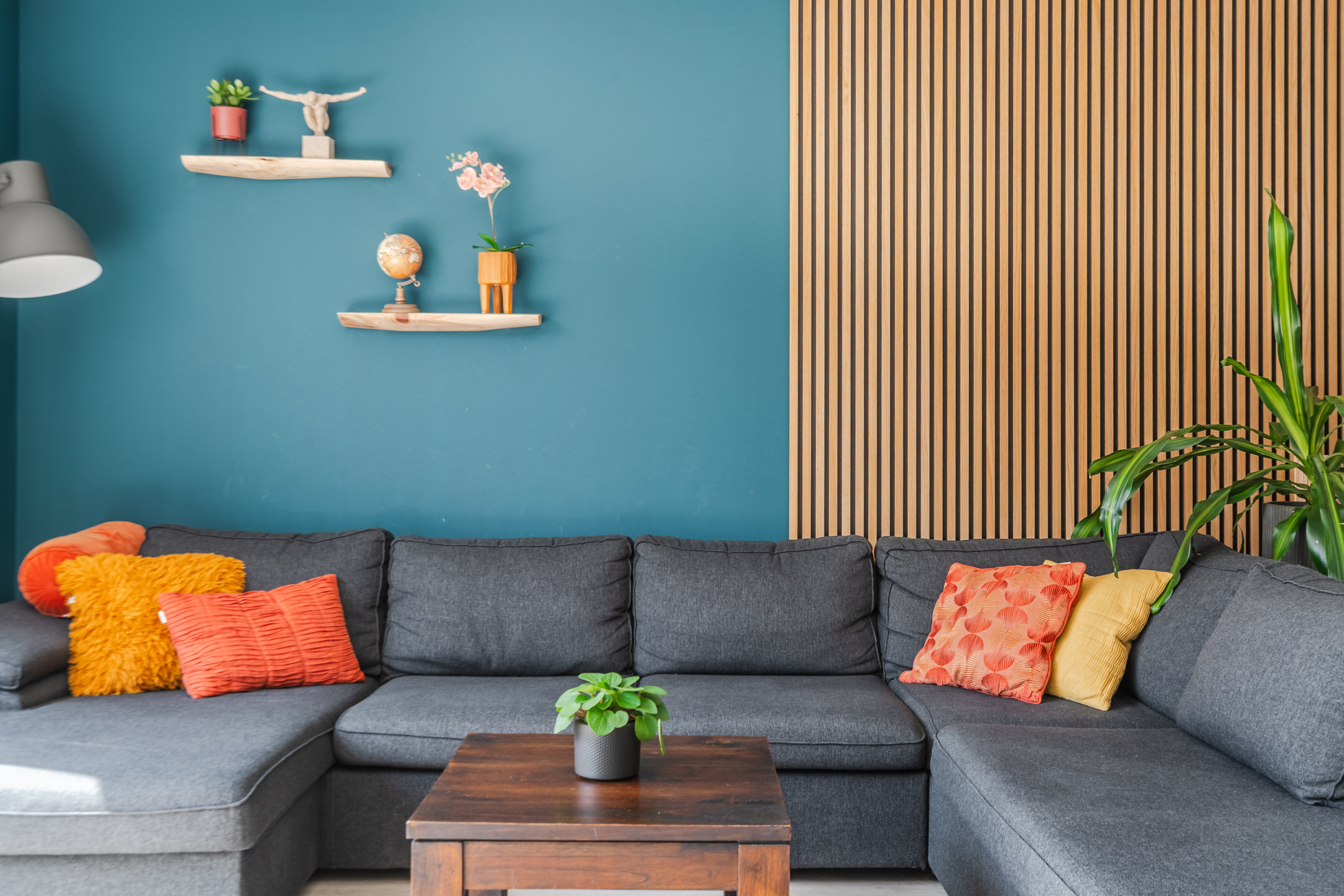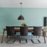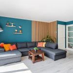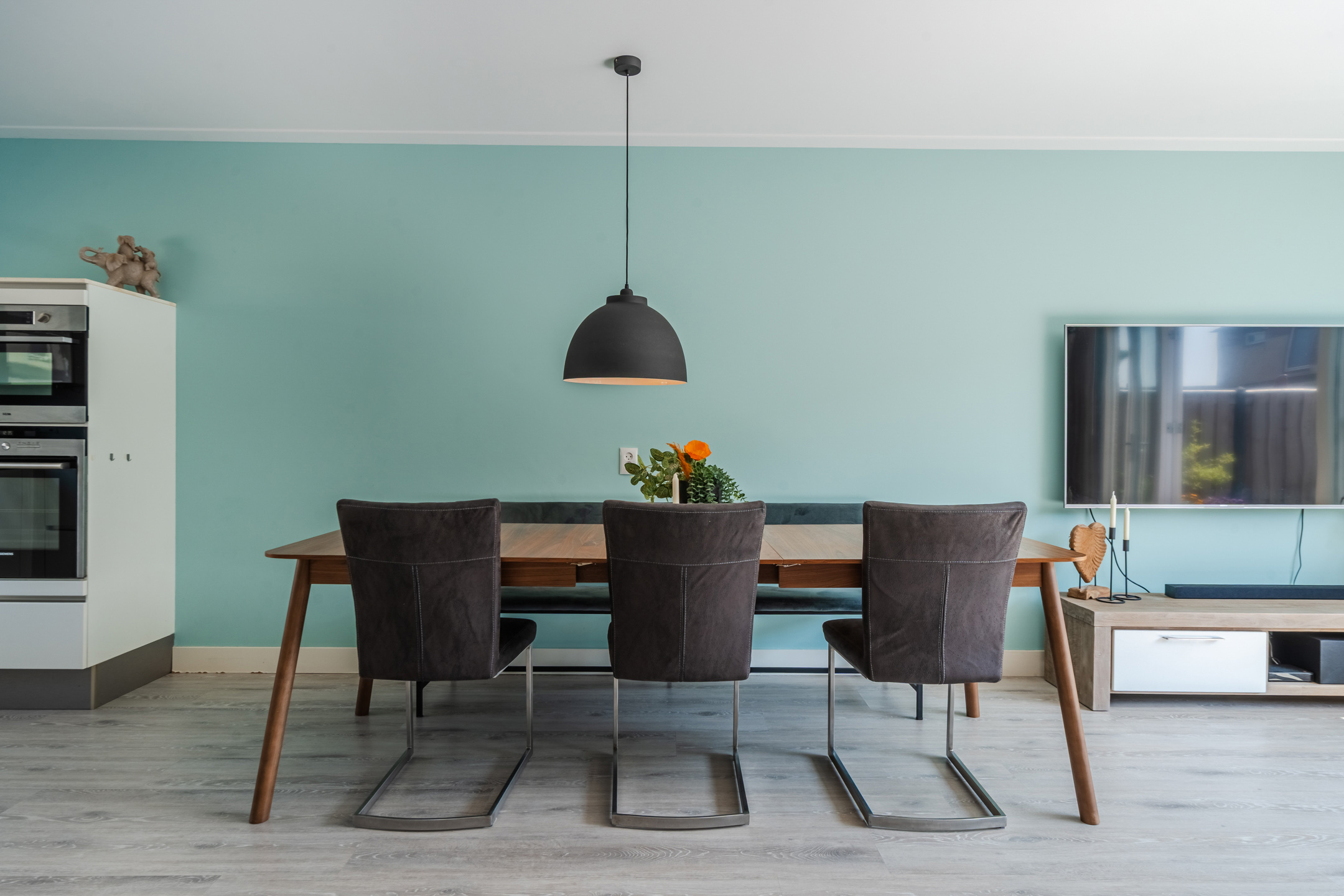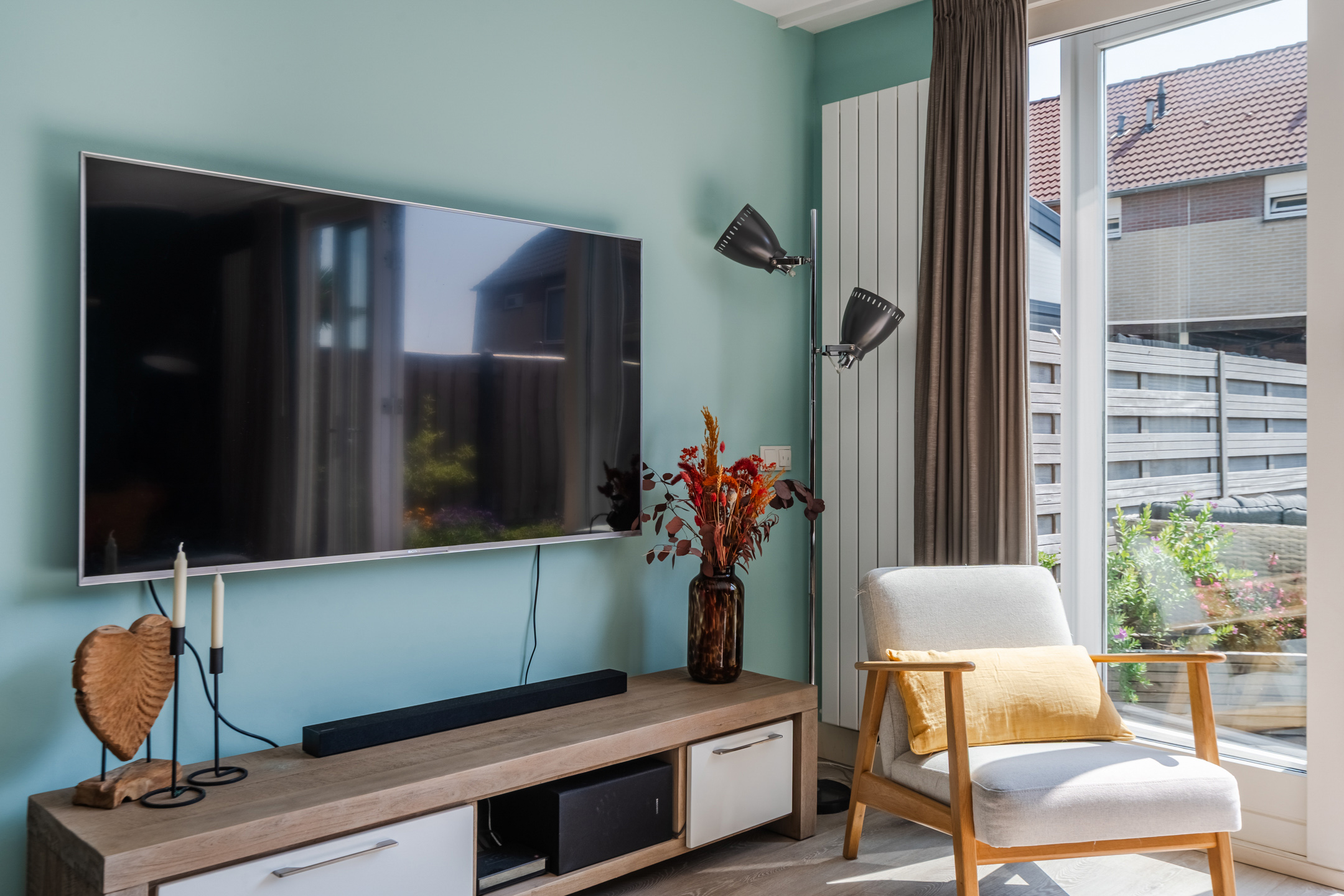 In de ruime en sfeervolle woonkamer ligt een mooie, lichte vloer. De muren zijn kleurrijk afgewerkt en deels voorzien van fraaie wandpanelen. Dankzij het grote raam aan de voorzijde en de openslaande tuindeuren aan de achterzijde valt er veel natuurlijk licht naar binnen.