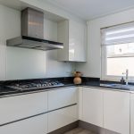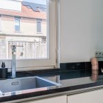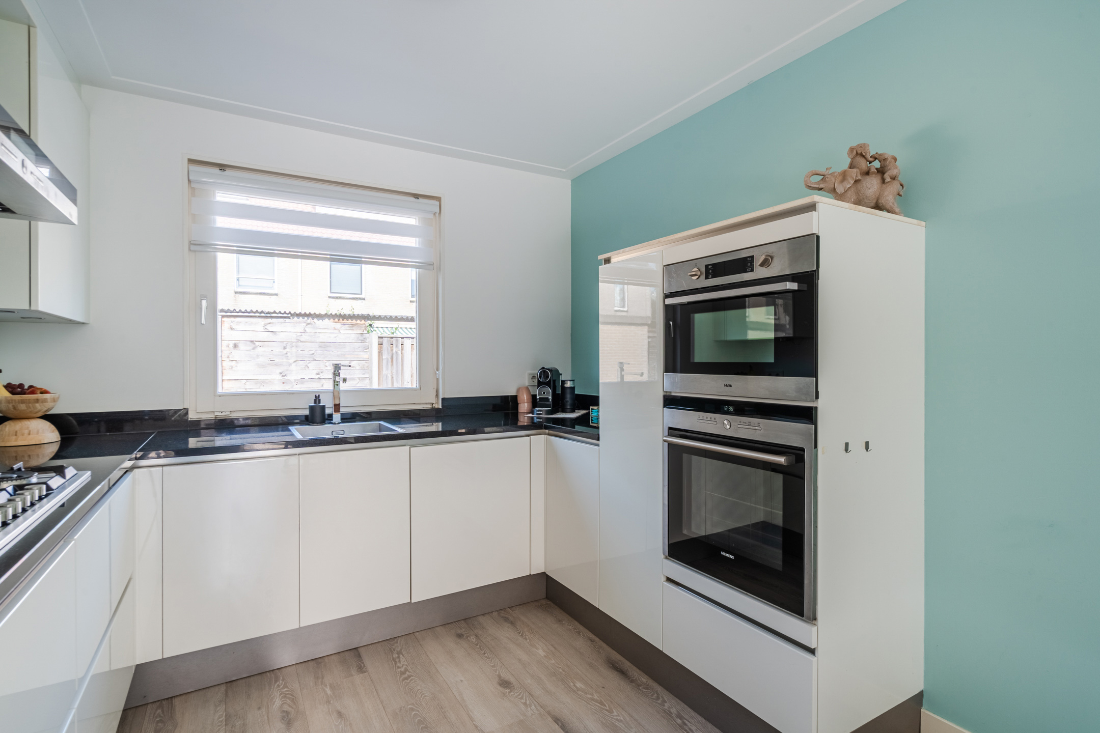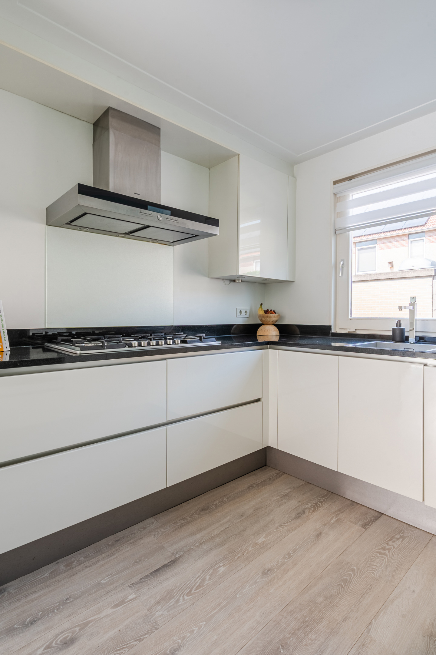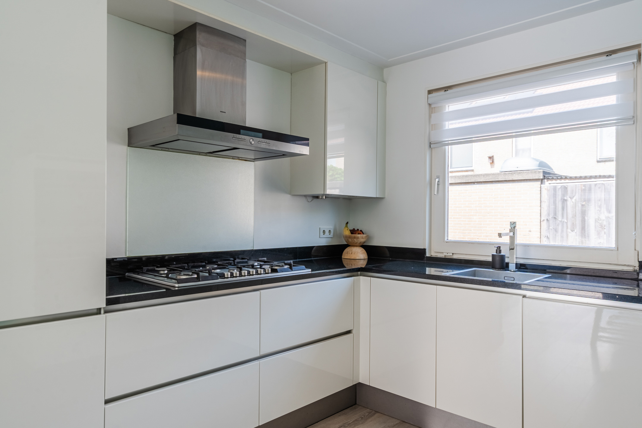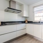 De open keuken bevindt zich aan de voorzijde van huis en is uitgevoerd in een U-vorm. Deze keuken is ongeveer 12 jaar oud en heeft een strak design met witte keukenkastjes en een donker werkblad. Hier tref je de volgende apparatuur aan: vaatwasser (2020), gasfornuis (2013), afzuigkap, oven (2013), combimagnetron (2019), koelkast (2013) en vriezer (2013).