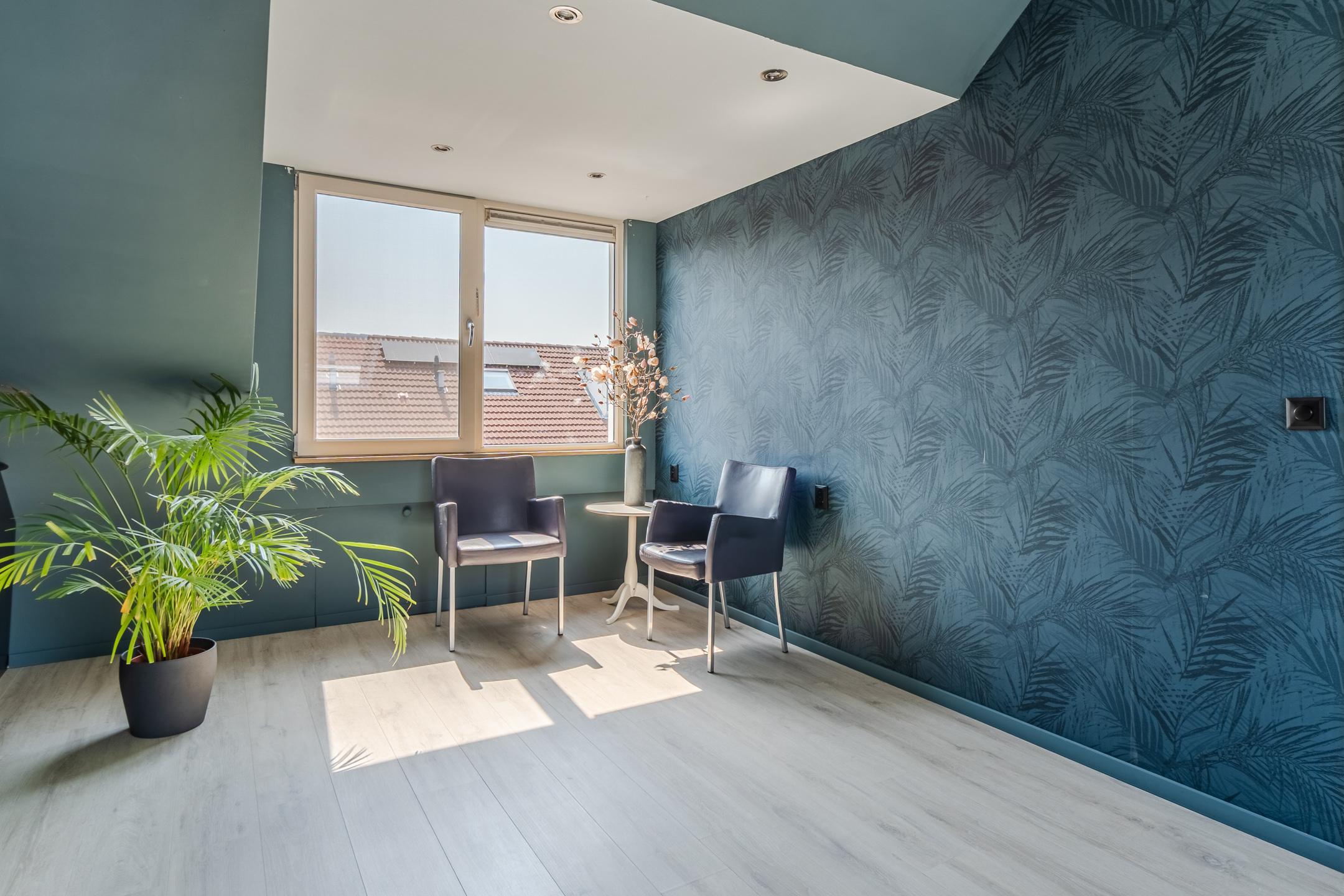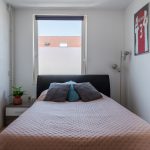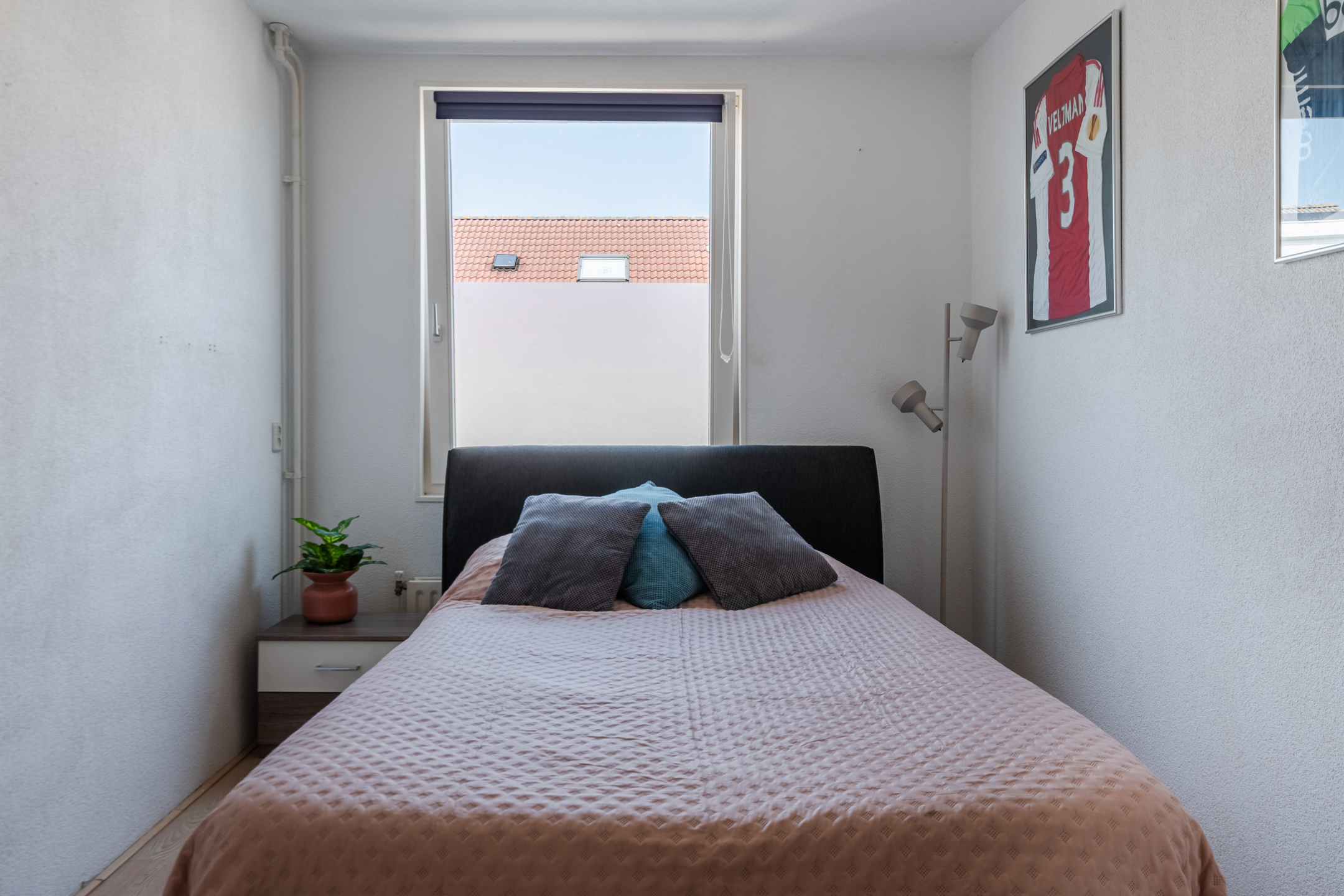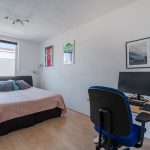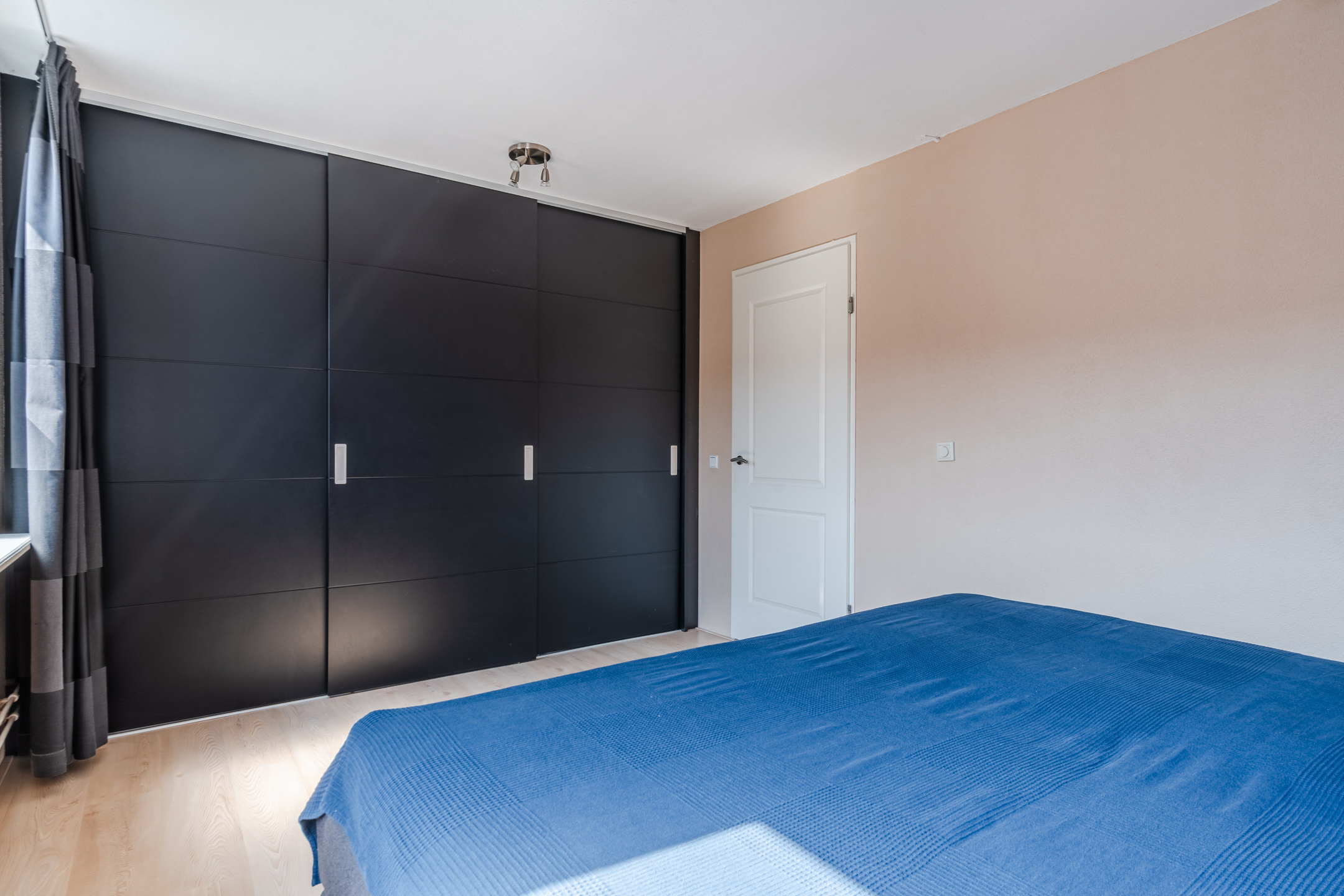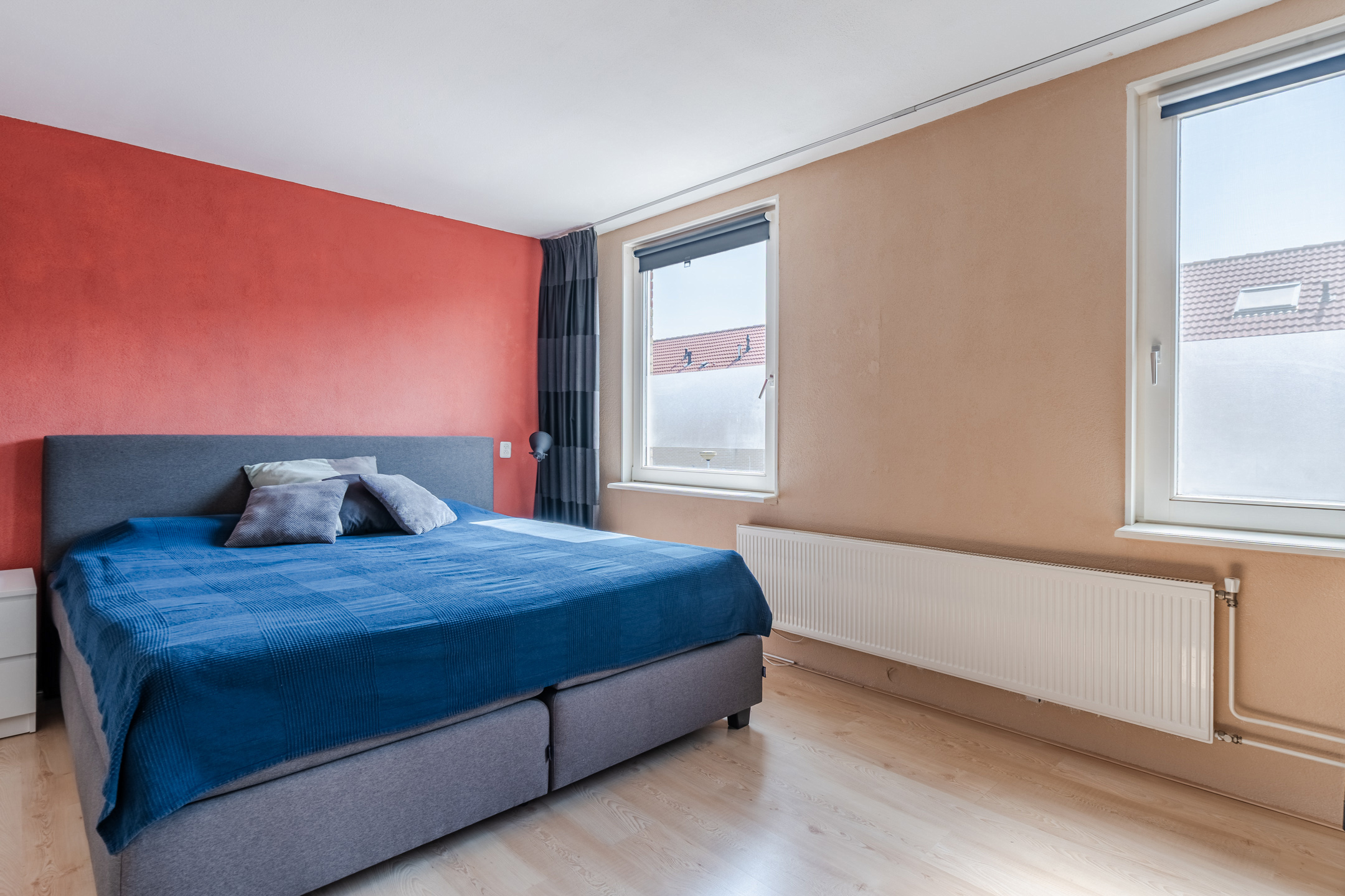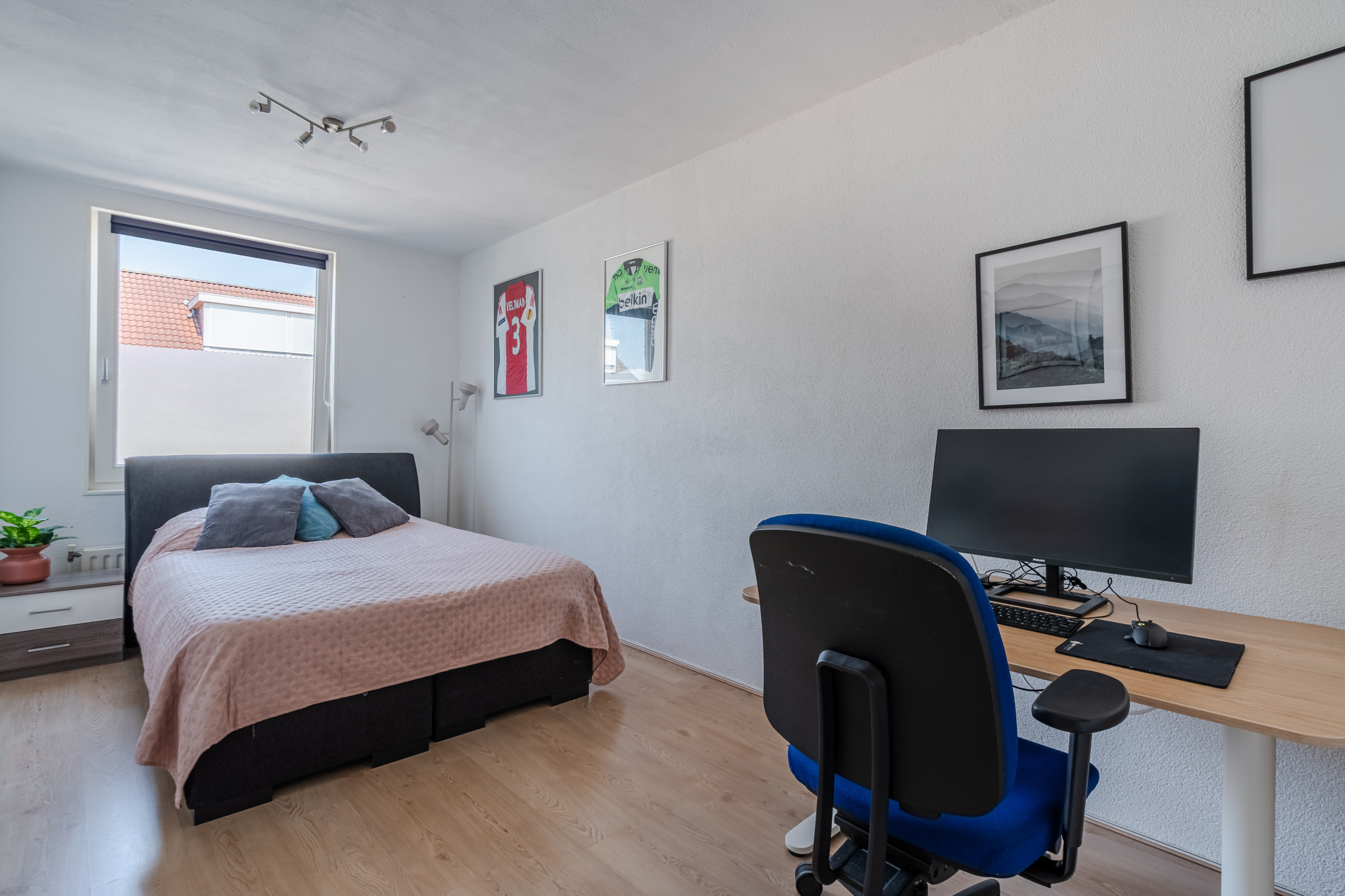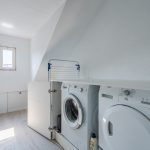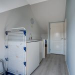 A fixed staircase provides access to the spacious landing on the second floor. Here you will find the washing machine and dryer connections and you have space to store things. This landing provides access to the third bedroom of the house. Thanks to the dormer window at the back, this bedroom is wonderfully spacious and light. The room is nicely finished and is lit with recessed spotlights.
