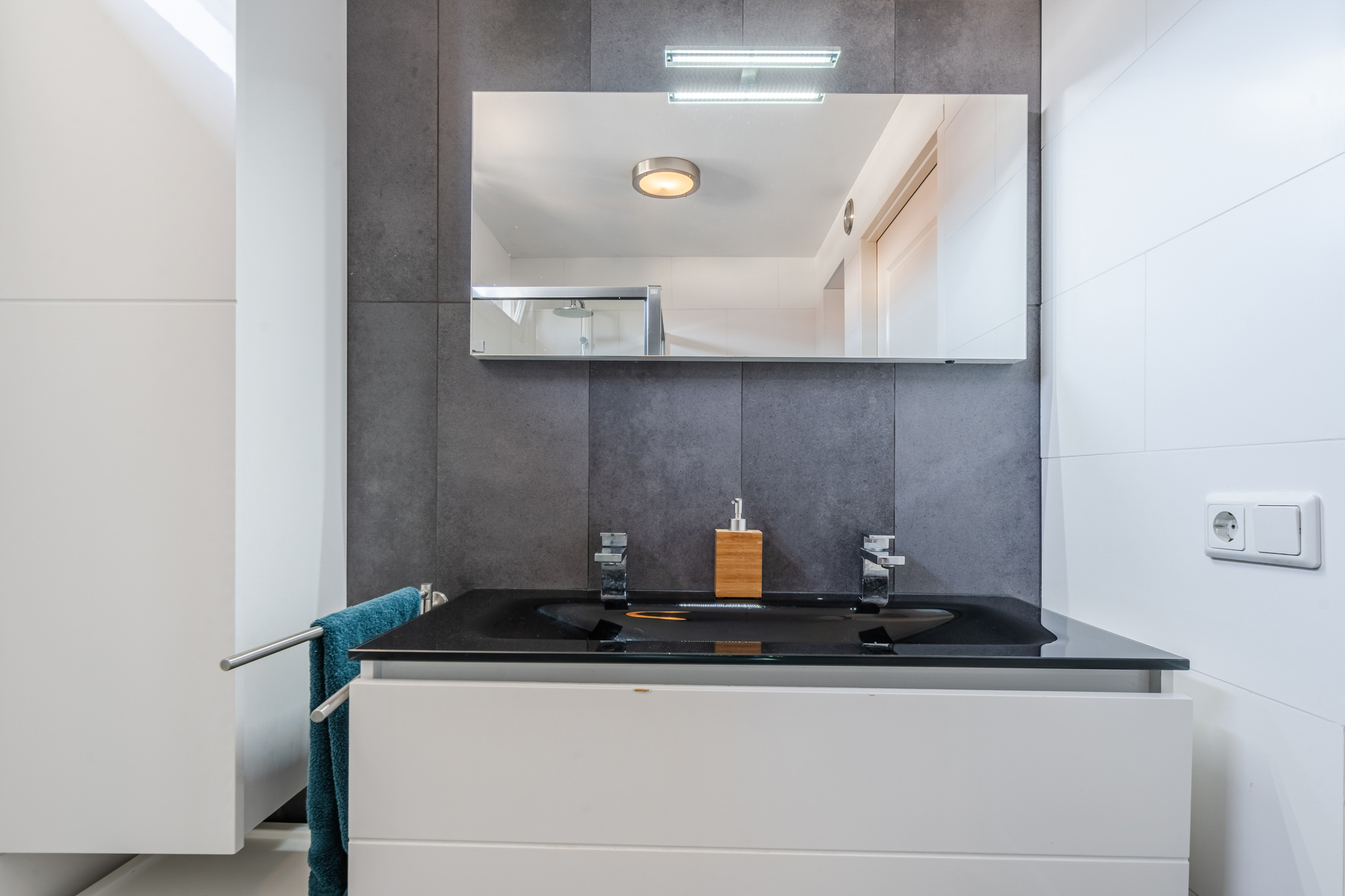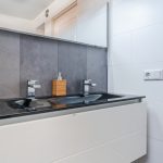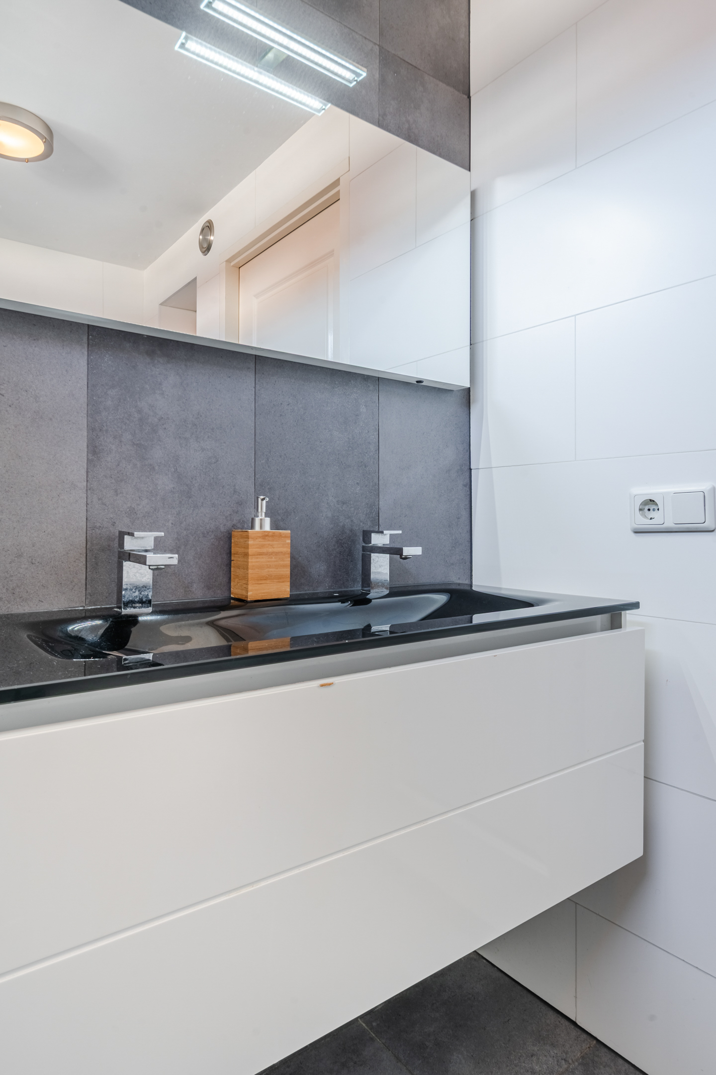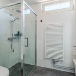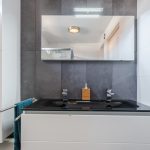 The bathroom was renovated 12 years ago and neatly finished with both light and dark tiles. This room is equipped with a floating toilet, vanity unit with sink and shower cabin.