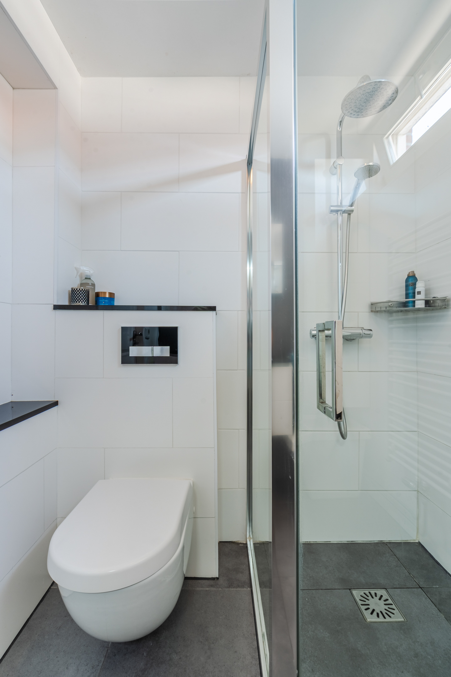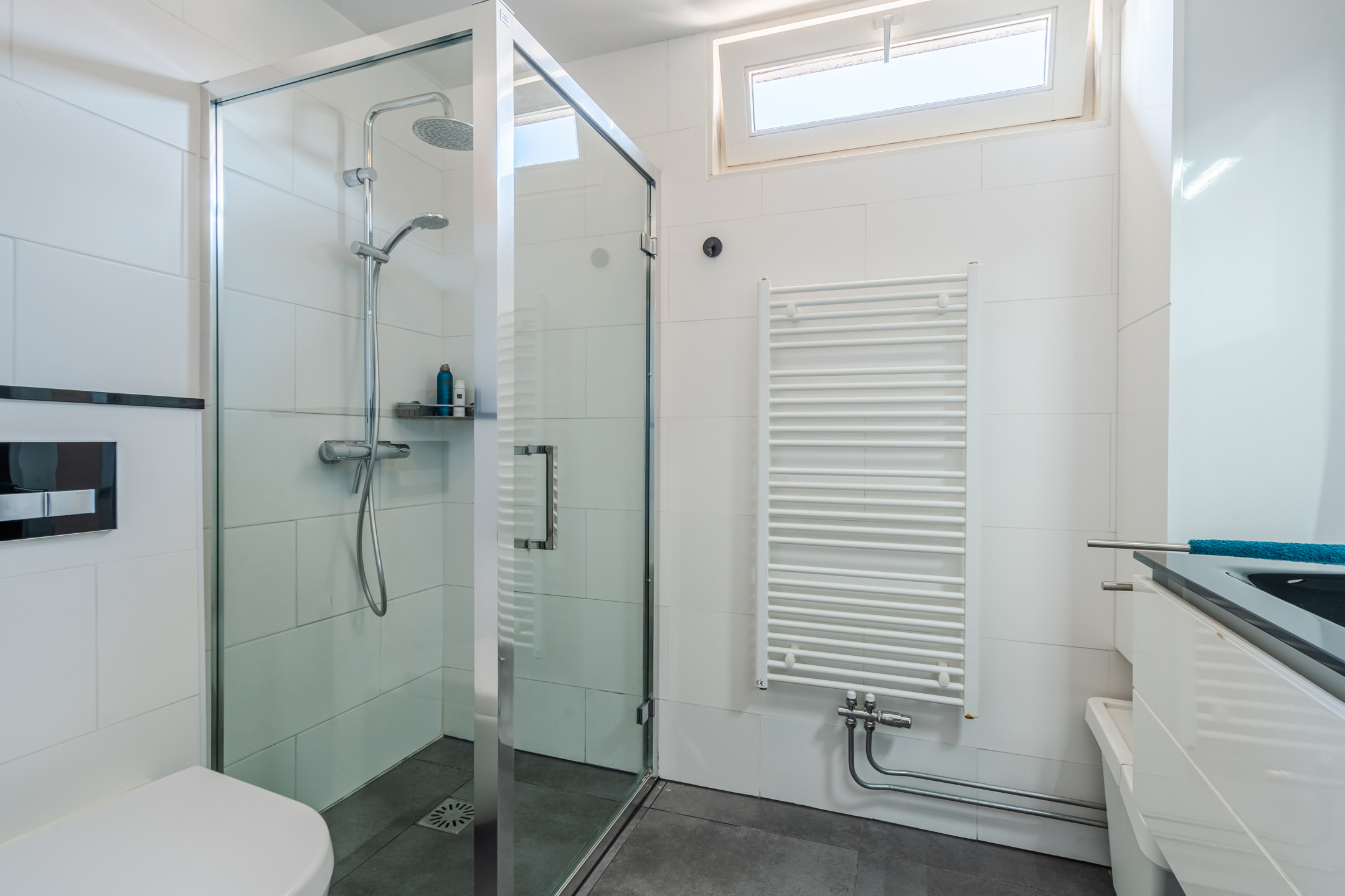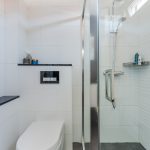 • Mooie badkamer met toilet, wastafel en douchecabine