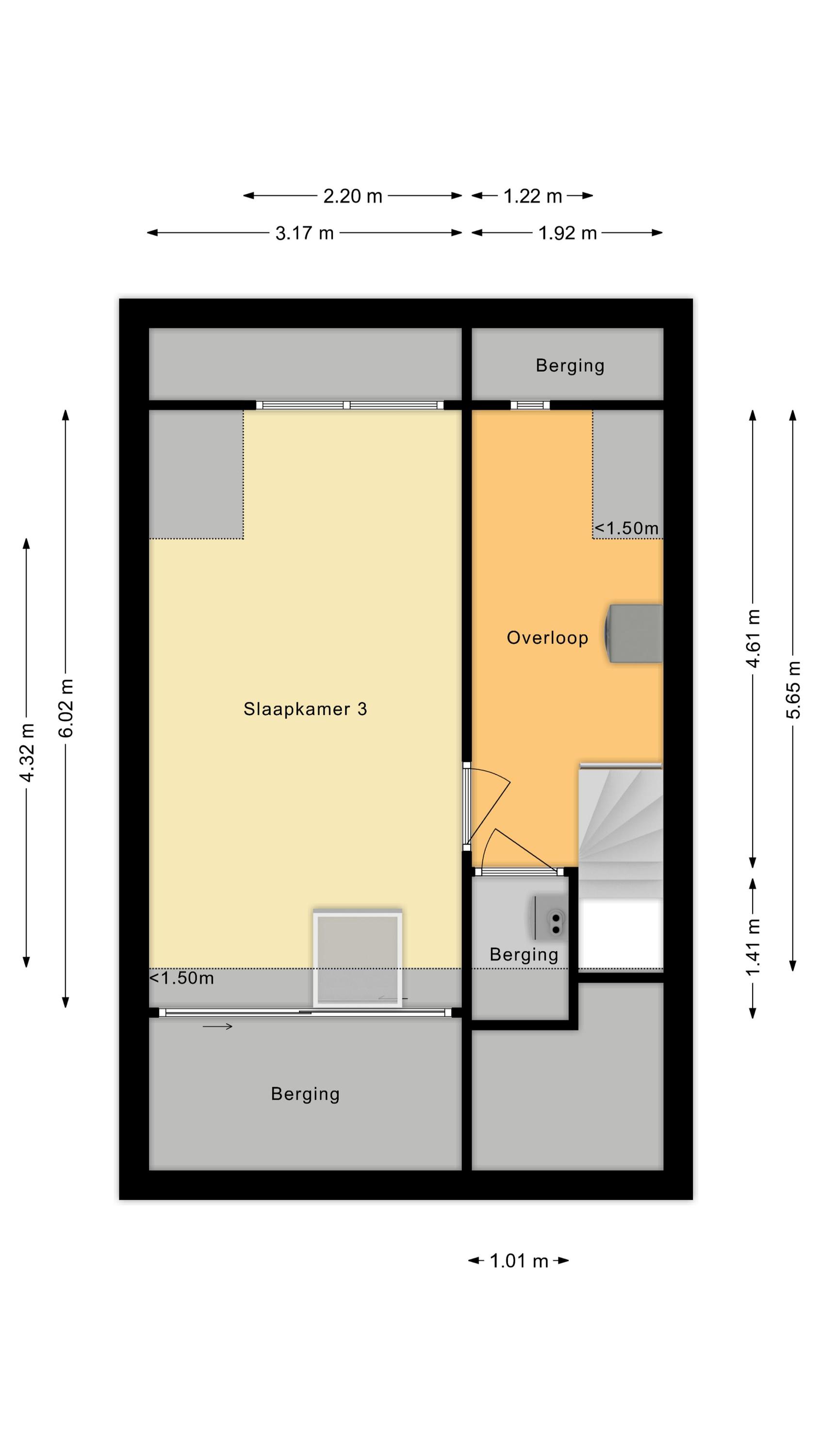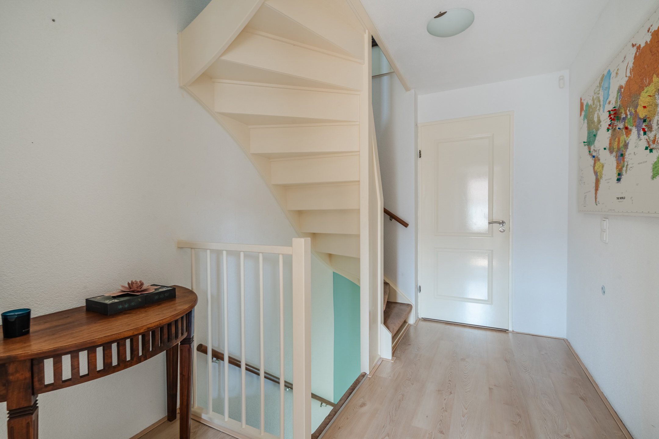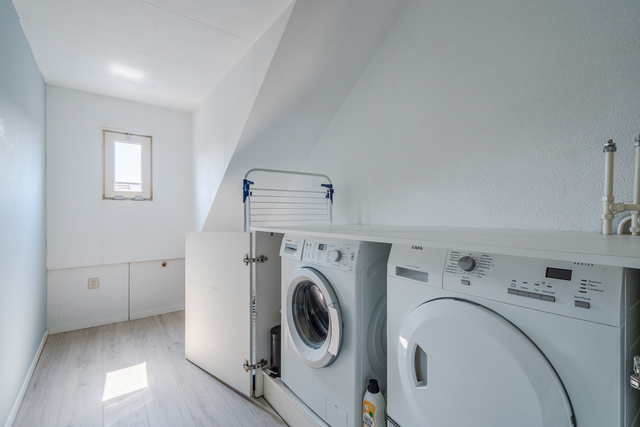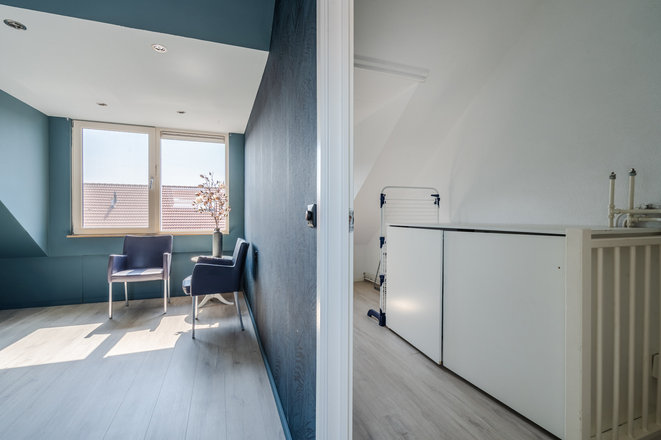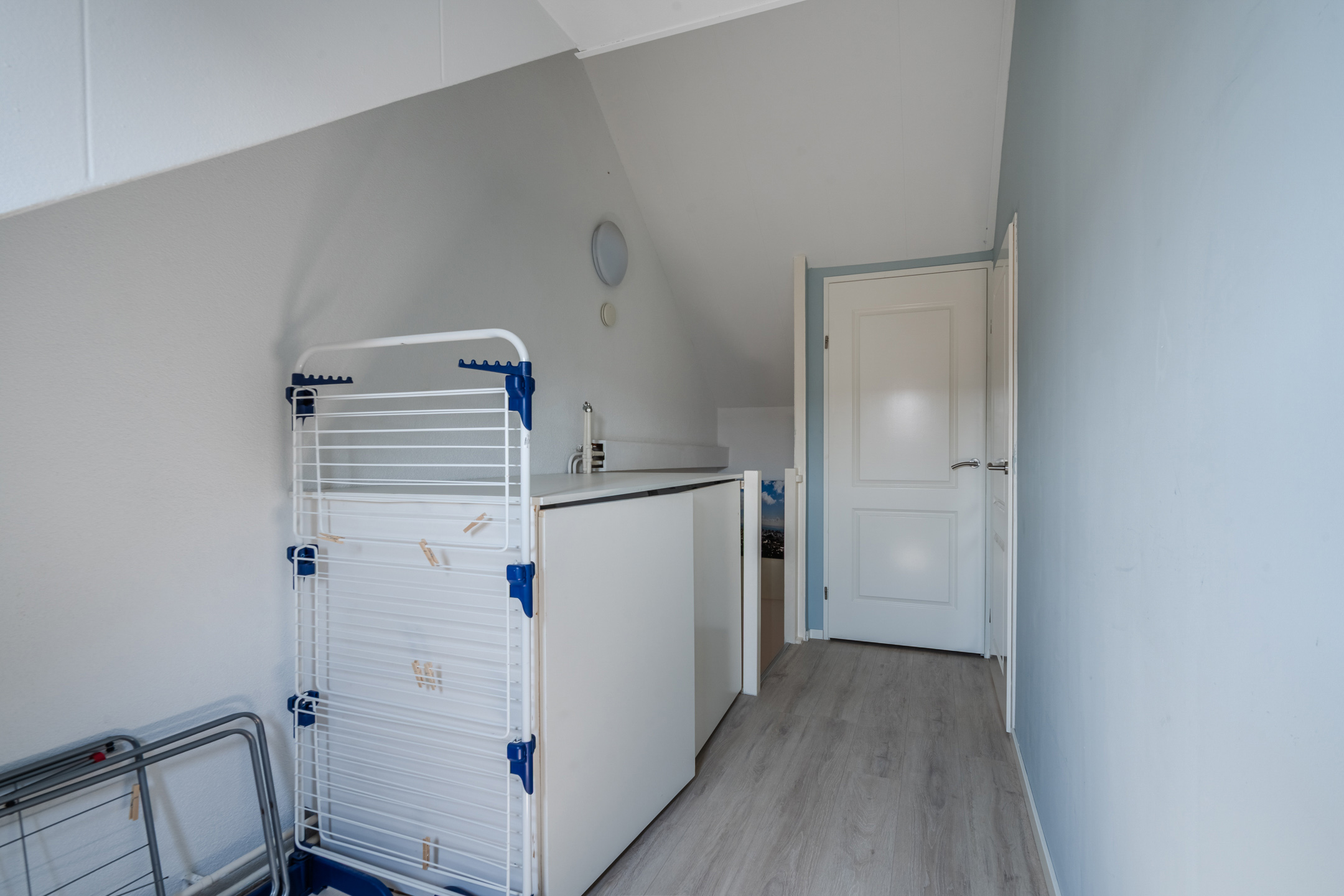Een vaste trap geeft toegang tot de ruime overloop van de tweede verdieping. Hier vind je de wasmachine- en drogeraansluitingen en heb je ruimte om spullen op te bergen. Deze overloop biedt toegang tot de derde slaapkamer van het huis. Dankzij de dakkapel aan de achterzijde is deze slaapkamer heerlijk ruim en licht. De kamer is keurig afgewerkt en wordt verlicht met inbouwspots.