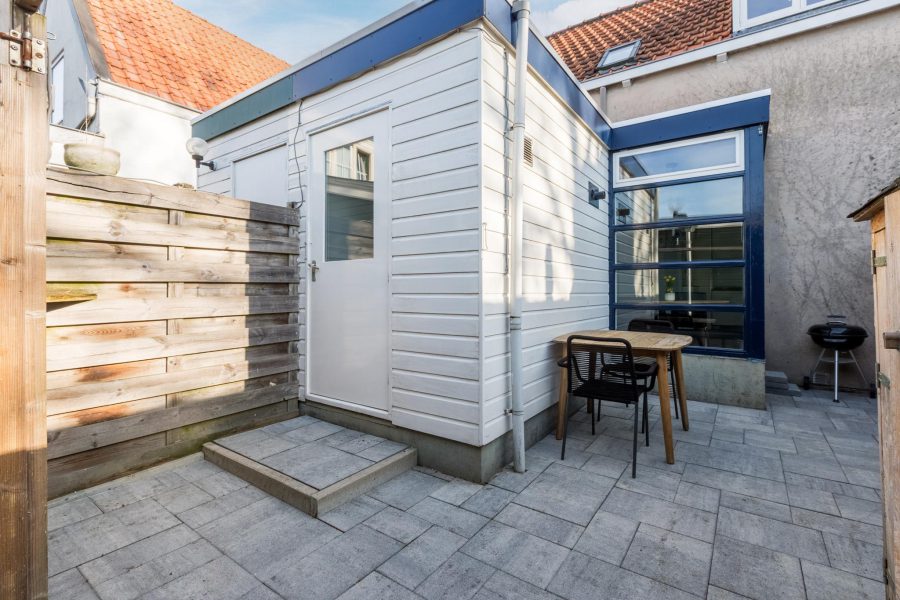 The property has a tiled front and back garden. In both gardens it is possible to create a lounge area and/or place a dining table outside for cosy outdoor dining in the summer months. The back garden has a wooden bicycle shed and a back entrance.