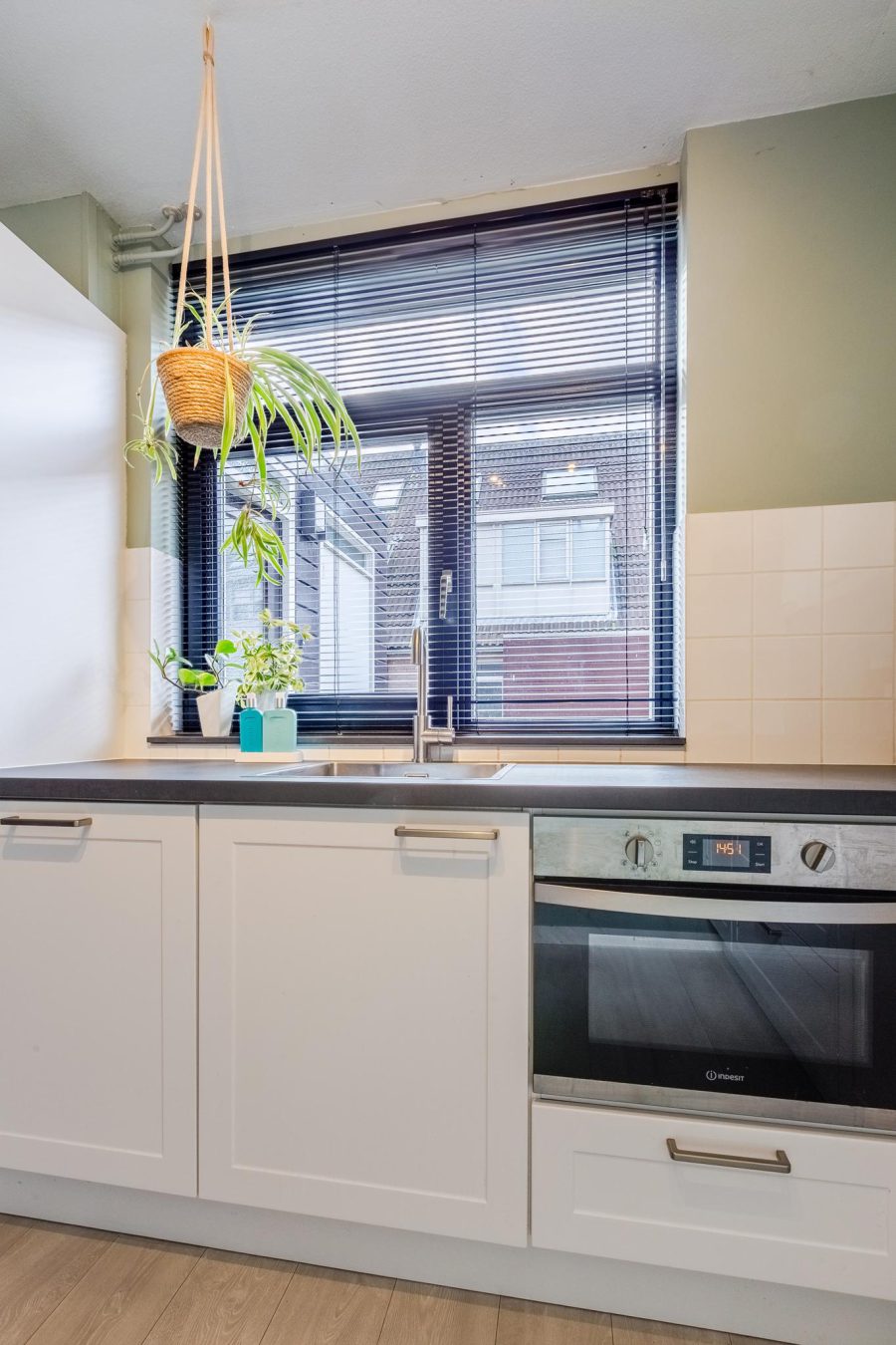 We arrive at the property via the car-free street. Front garden with bicycle shed. Next to the shed is the front door. Entrance with wardrobe and meter closet, access to the living room with open kitchen. The garden-oriented living room has French doors to the garden at the back. Here is room for a seating area. The L-shaped kitchen is located at the front. The kitchen has white fronts and is equipped with various built-in appliances. In the living room is the door to a small hallway with a toilet with hand basin and the staircase to the first floor. The ground floor has laminate flooring and the walls and ceilings have a neat finish.