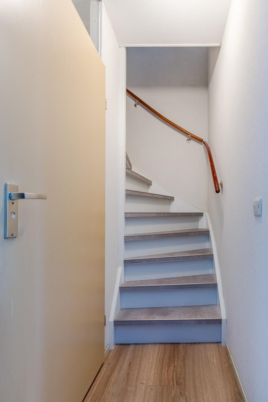 Via een open trap bereik je de tweede verdieping. Hier bestaat de mogelijkheid om een vierde slaapkamer te realiseren. Nu bevindt zich hier de technische installatie en de aansluiting voor de wasmachine en bergruimte. In deze ruimte staat een trap met toegang tot de bergvliering.