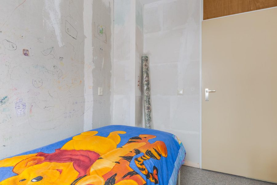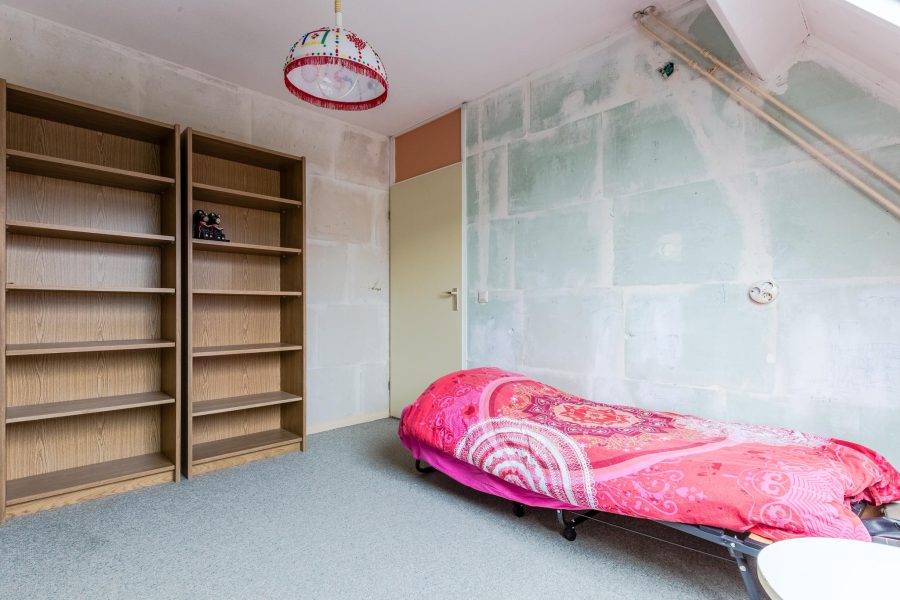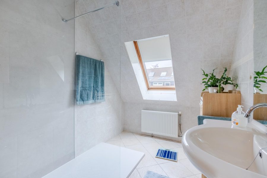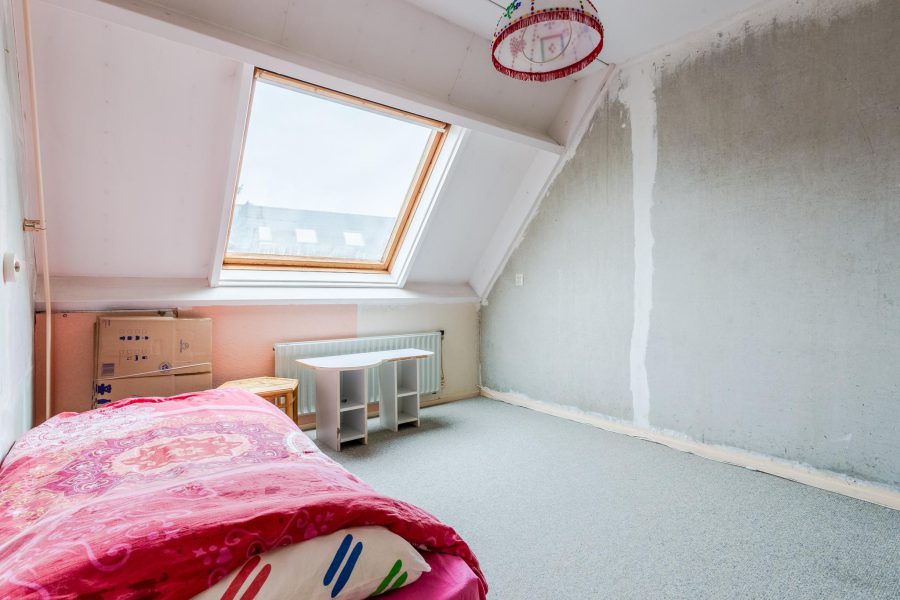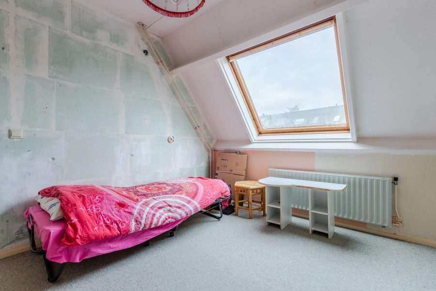 Via de trap bereiken we de overloop van de eerste verdieping. hier treffen we drie fijne slaapkamers en de badkamer aan. Twee slaapkamers liggen aan de voorzijde en de derde slaapkamer ligt aan de achterzijde, naast de badkamer. Deze verdieping moet nog worden afgewerkt. De slaapkamer aan de achterzijde heeft een groot Velux dakraam. Ook de slaapkamers aan de voorzijde hebben een fijne lichtinval. De badkamer is voorzien van een badmeubel met wastafel en spiegel en een inloopdouche. Ook de badkamer heeft een Velux dakraam.