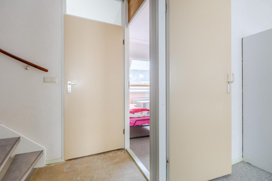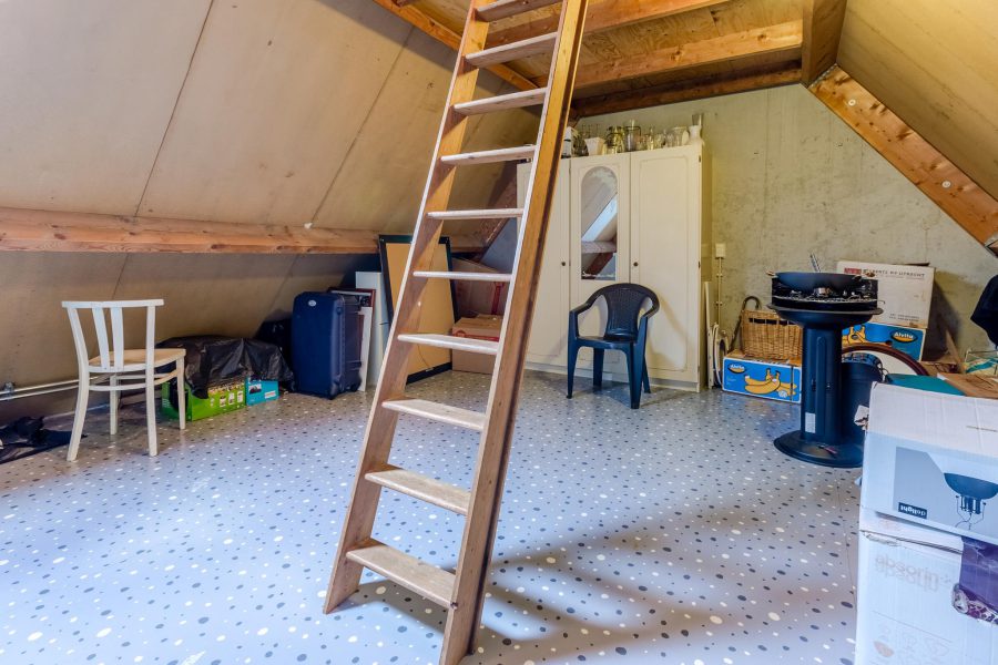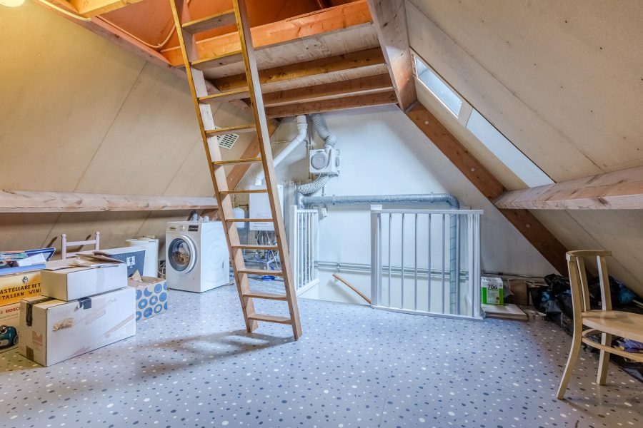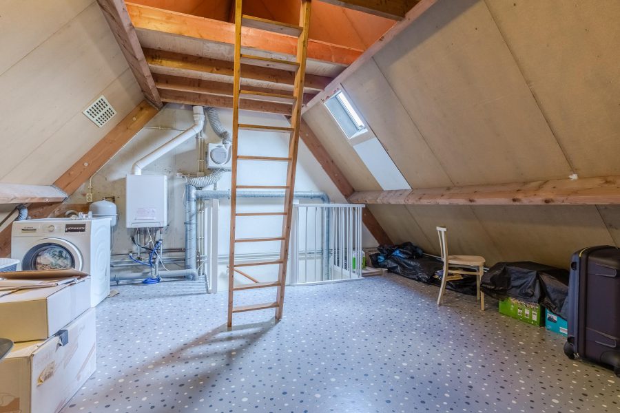 Via an open staircase, you reach the second floor. Here there is the possibility of creating a fourth bedroom. Currently, the technical installation and connection for the washing machine and storage space are located here. In this room is a staircase with access to the storage attic.