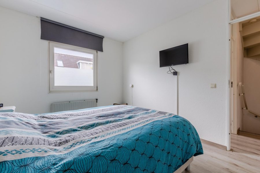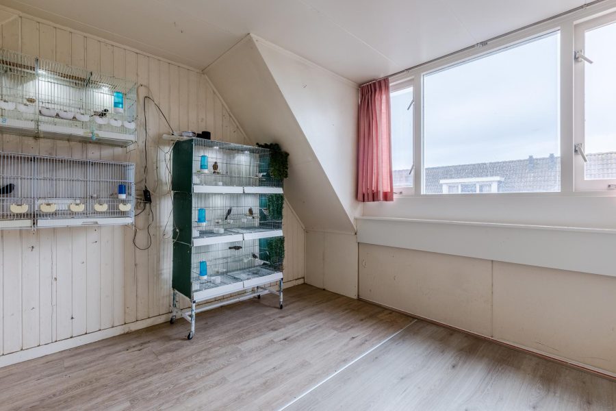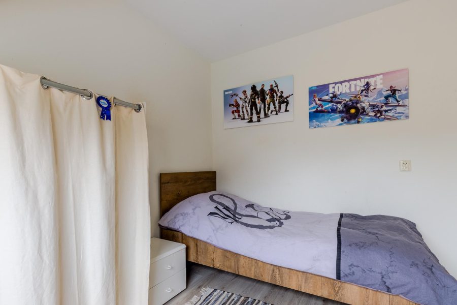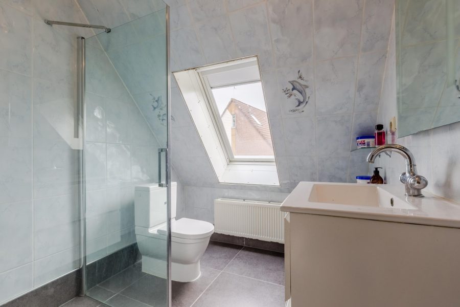 Via de met halvemaantjes beklede trap bereiken we de overloop van deze verdieping. Hier zijn drie slaapkamers en de badkamer te vinden. Twee slaapkamers liggen aan de voorzijde en de derde slaapkamer ligt aan de achterzijde, naast de badkamer. Deze twee ruimtes krijgen via een Velux dakraam daglicht binnen. In de badkamer tref je een badmeubel met wastafel en spiegel aan, een staand toilet en een inloopdouche. Op deze verdieping ligt laminaat op de vloer.