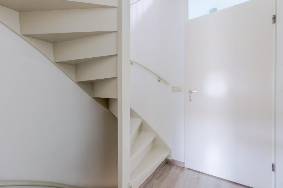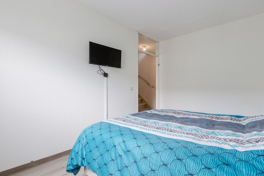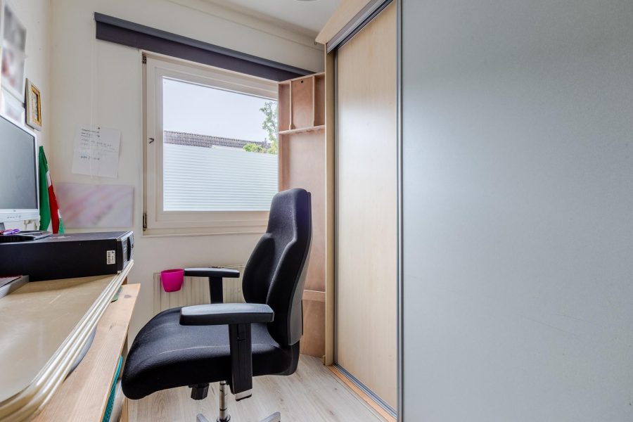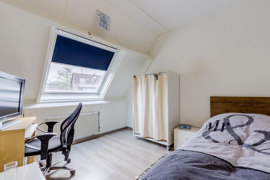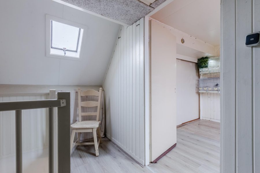 Via the crescent-lined staircase, we reach the landing of this floor. Here you will find three bedrooms and the bathroom. Two bedrooms are at the front and the third bedroom is at the back, next to the bathroom. These two rooms receive daylight through a Velux skylight. In the bathroom, you will find a vanity unit with sink and mirror, a standing toilet and a walk-in shower. This floor has laminate flooring.