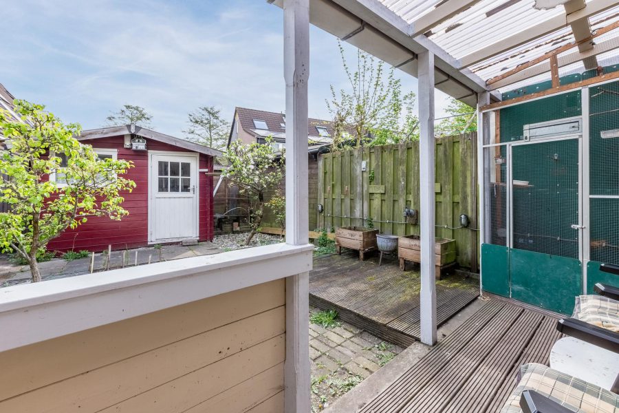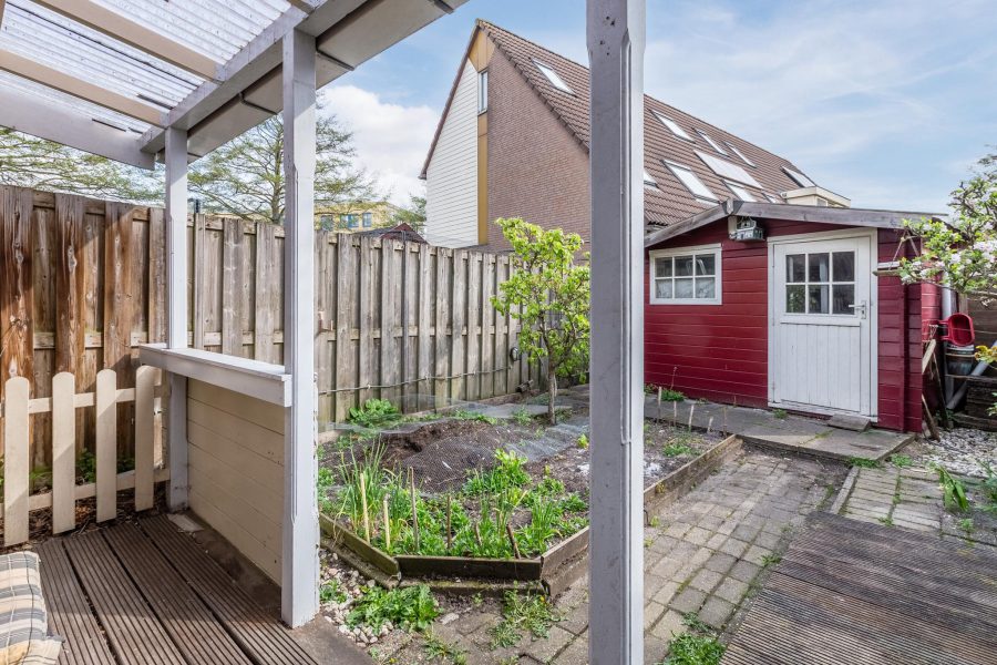 De woning heeft een deels groene, deels met vlonders bedekte, beschutte achtertuin. Aan de woning vast vind je een overkapping en achter in de tuin staat een houten (fietsen)berging. Er is een achterom.