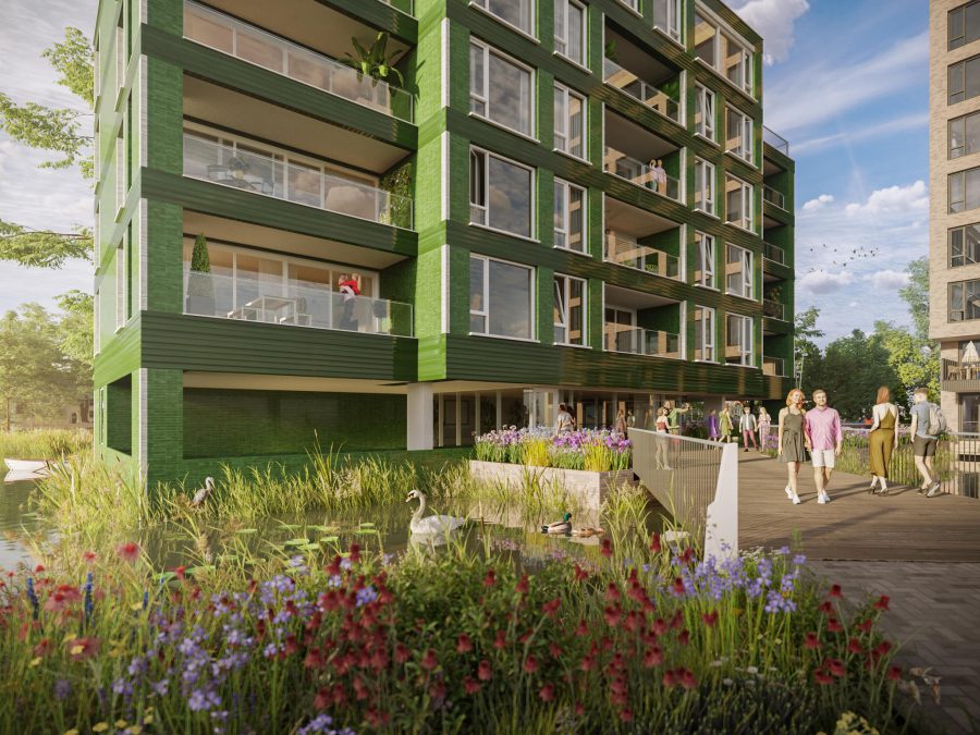 De Groene Jager springt direct in het oog. De gevel van groene glazuur glimt in de zon. De Groene Jager onderscheidt zich niet alleen door de kleur, maar ook door de ligging. Het bouwblok staat vrij op de kop van De Zaanse Helden, aan het water, met buitenruimten op het zuiden en uitzicht op de historische molen De Held Jozua. Mooier kan niet!