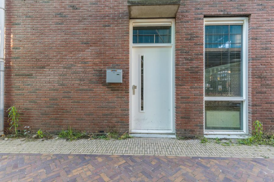 Via de steeg bereiken we de voordeur van de woning. Voordeur met overkapping, gemeenschappelijke hal met trappenhuis.