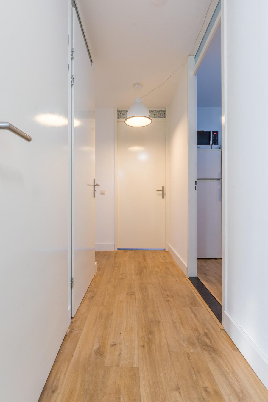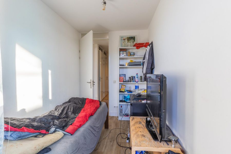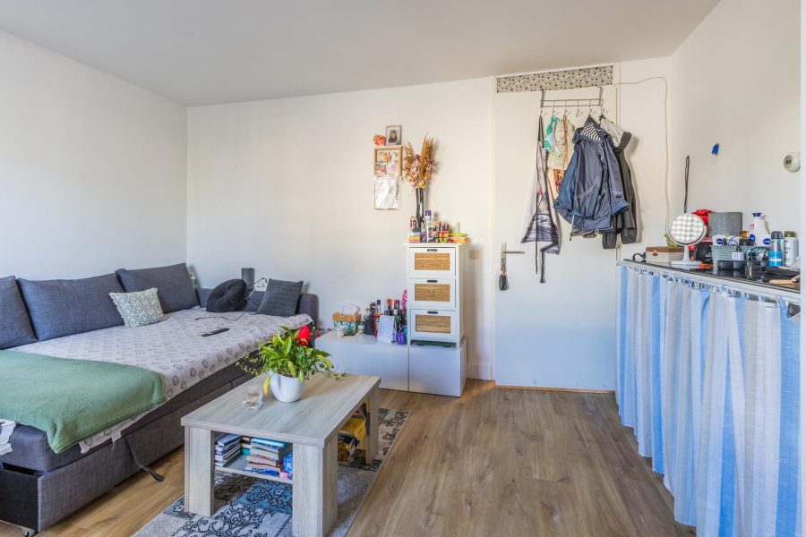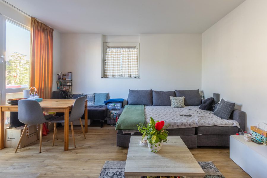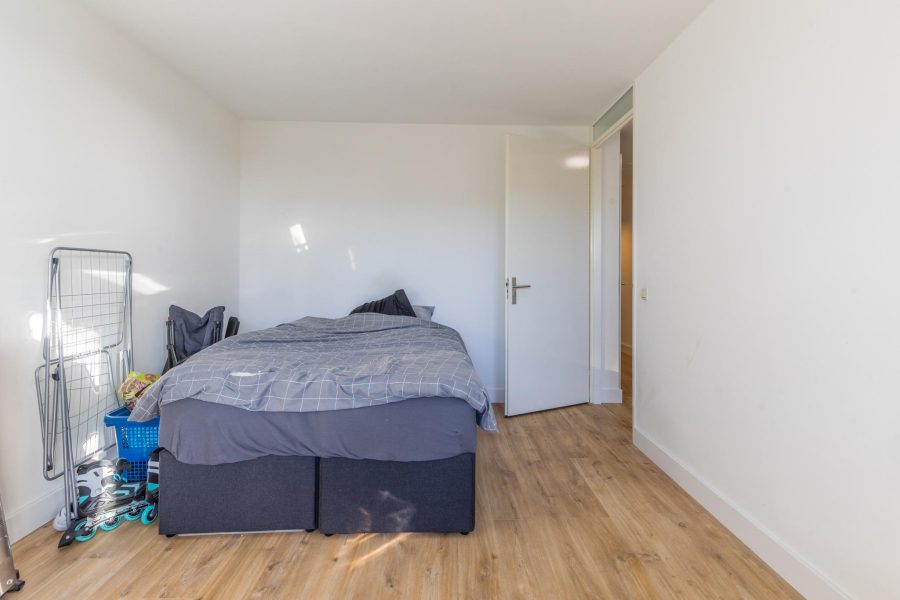 Aan de voorzijde van de woning tref je nog een slaapkamer en de woonkamer aan. De woonkamer heeft twee ramen aan de voorzijde en een zijraam. Je hebt hier een mooie lichtinval. Het gehele appartement is voorzien van een mooie houten vloer en de muren en plafonds zijn licht, strak en neutraal afgewerkt.