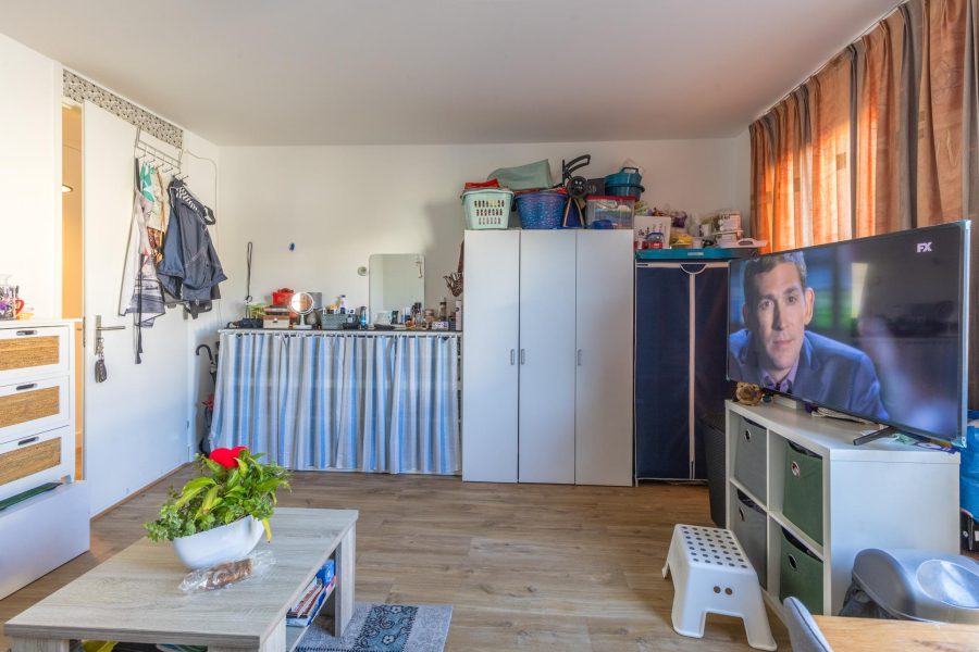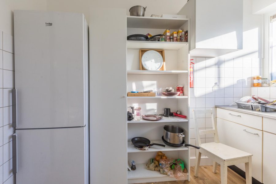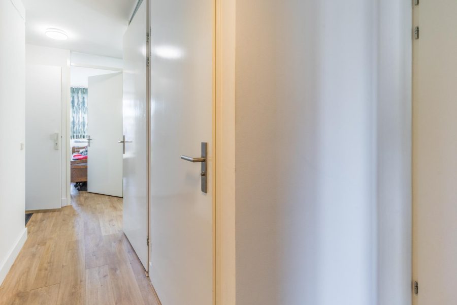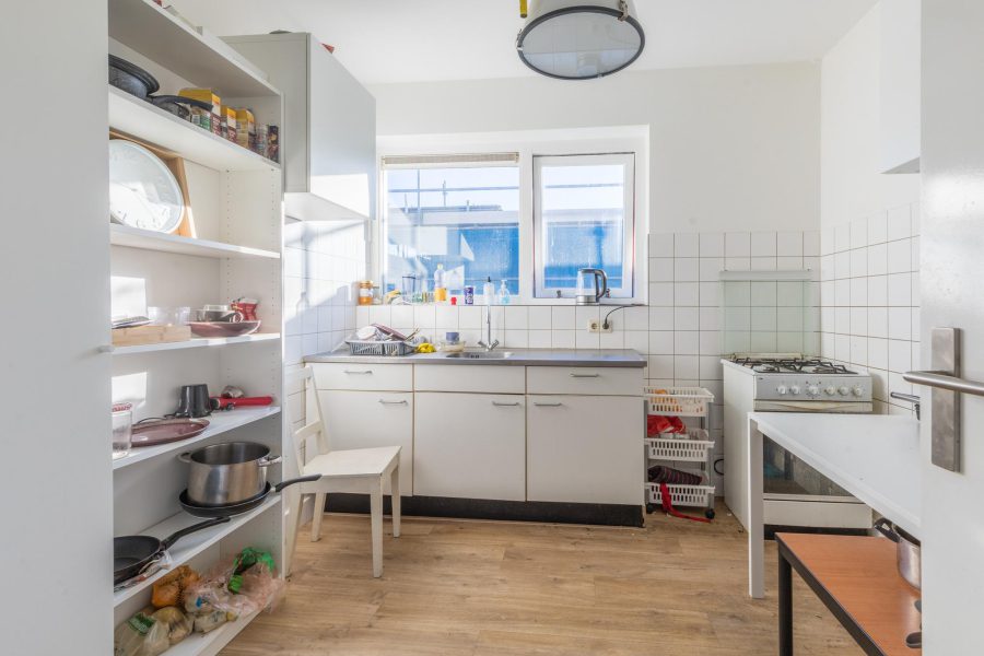 Via het trappenhuis bereiken we de voordeur van de woning. Entree met meterkast en direct aan je linkerhand bevinden zich twee slaapkamers met beide toegang tot een ruim balkon met de mogelijkheid voor een loungeplek. Het balkon is overkapt en gedeeltelijk beschut. Je hebt hier een vrij uitzicht. Loop je verder in de gang, dan tref je een afgesloten berging aan, het separate zwevende toilet met fonteintje en de badkamer. De badkamer is voorzien van een zwevend toilet, een badmeubel, een wastafel met spiegel en een inloopdouche. Tegenover de badkamer is de keuken gelegen. In de eenvoudige keuken tref je een keukenblok en diverse losse apparatuur aan. De foto’s van de keuken zijn van een vergelijkbaar appartement.