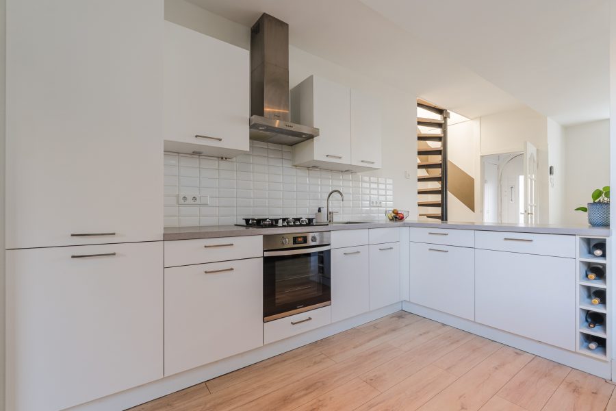 De keuken is uitgevoerd in een hoekopstelling en heeft een strak design met witte keukenkastjes en een grijs werkblad. De volgende apparatuur is hier aanwezig: vaatwasser, oven/magnetron, gasfornuis, afzuigkap, koelkast en vriezer. Er is volop kastruimte, waaronder diverse lades.