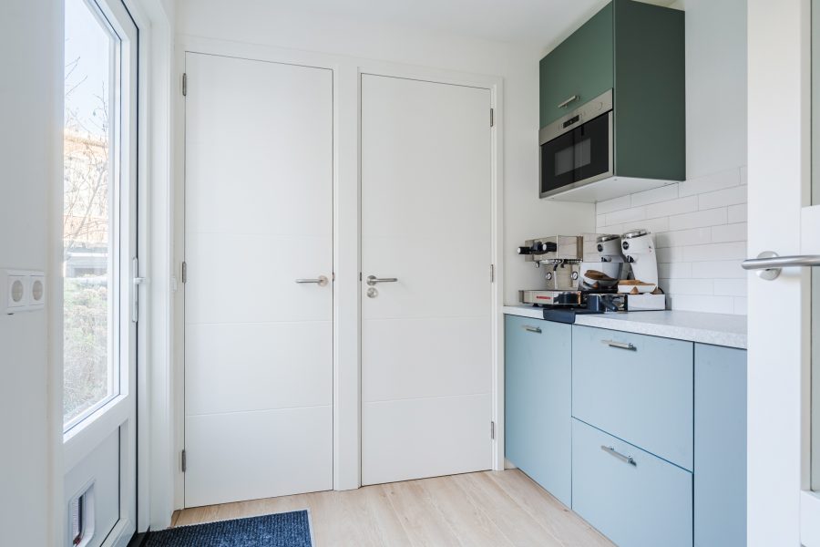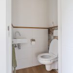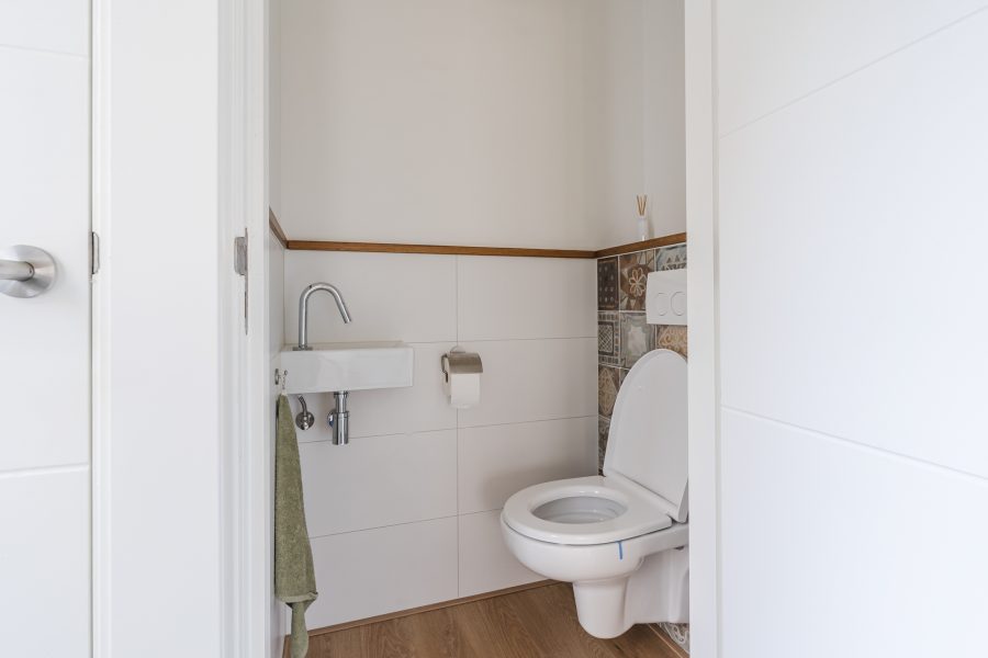 Via de keuken loop je zo de bijkeuken binnen. Hier vind je een extra keukenblok met wasbak en heb je ruimte om spullen op te bergen. De bijkeuken biedt verder toegang tot de achtertuin, een toiletruimte met zwevend toilet en fonteintje, en een kleine berging met daarin de aansluiting voor de wasmachine.