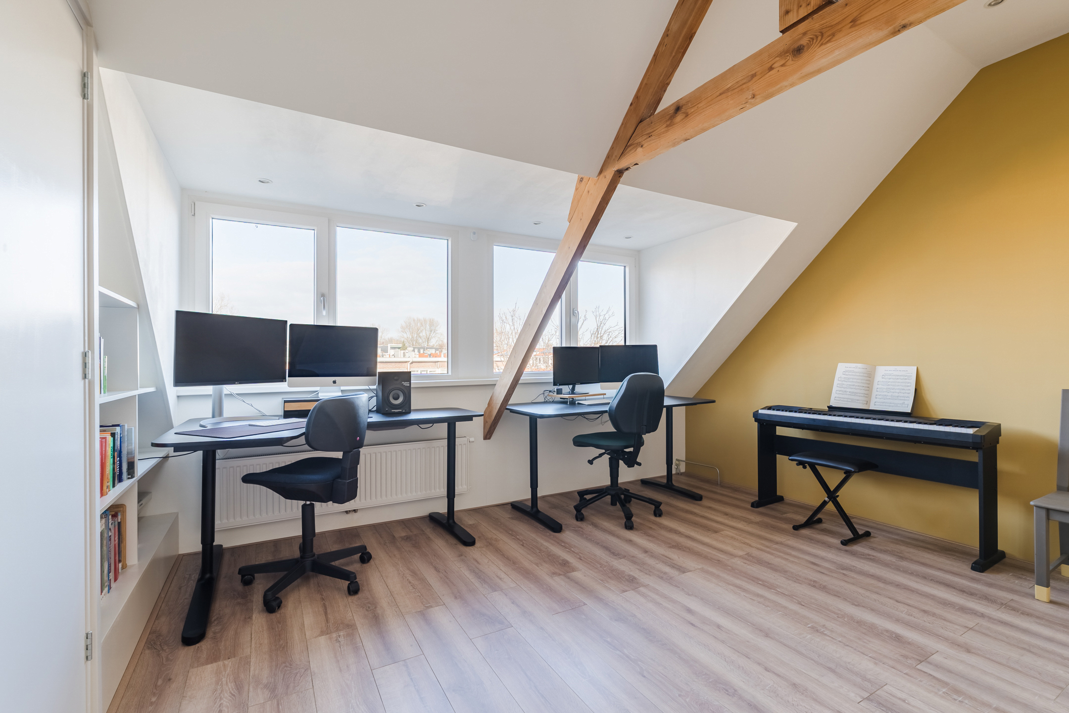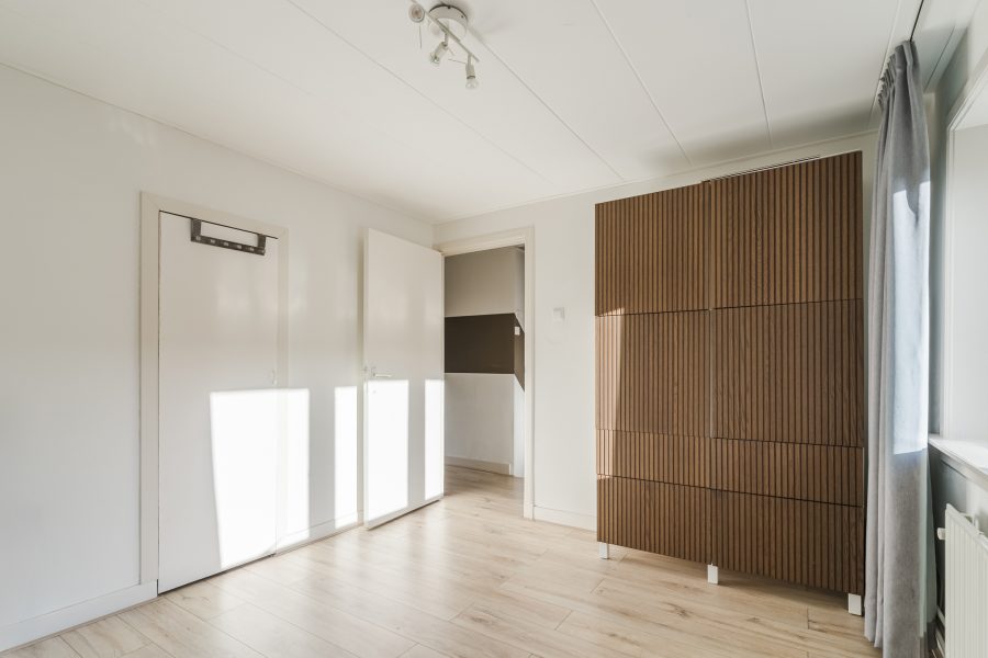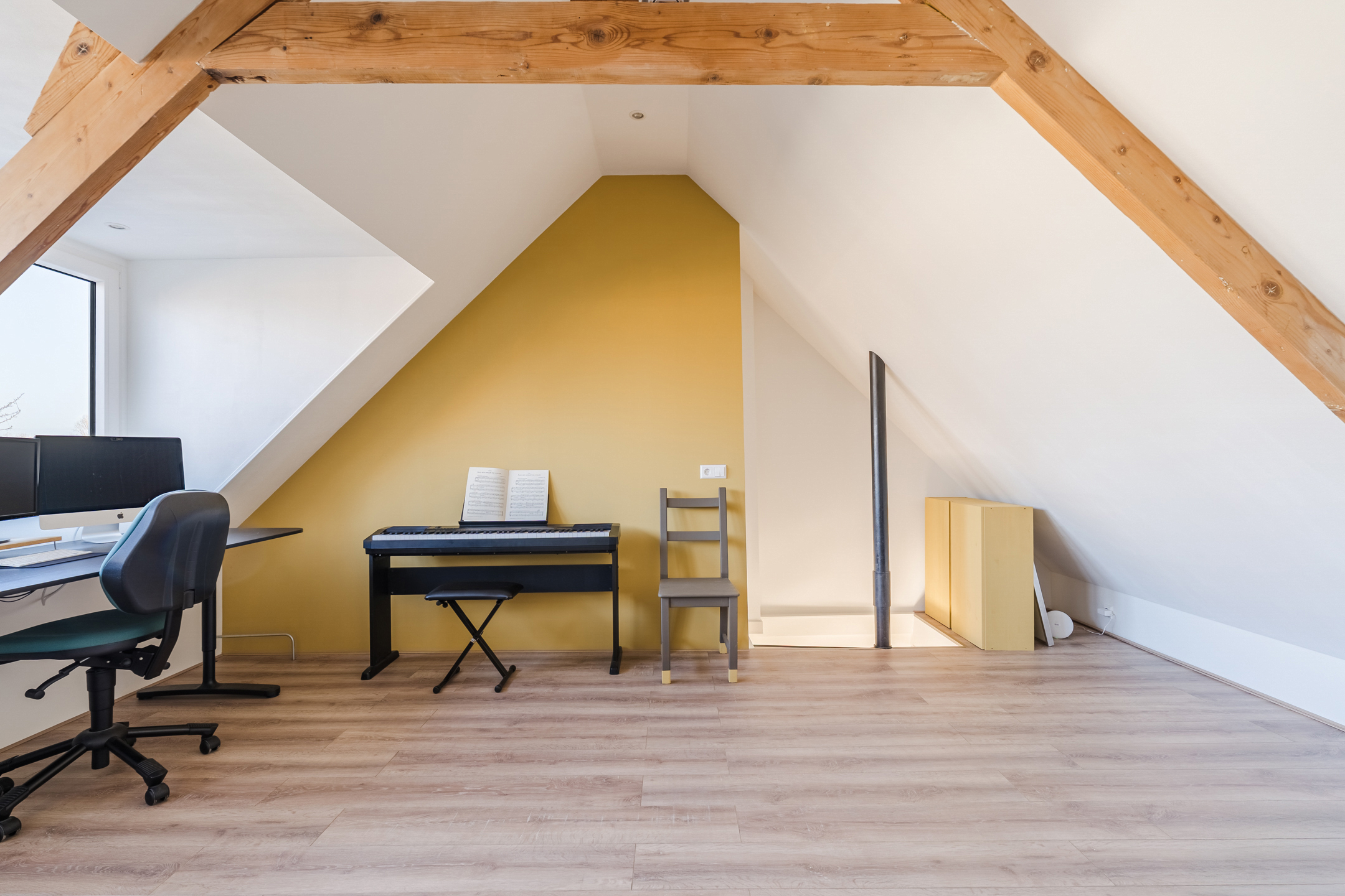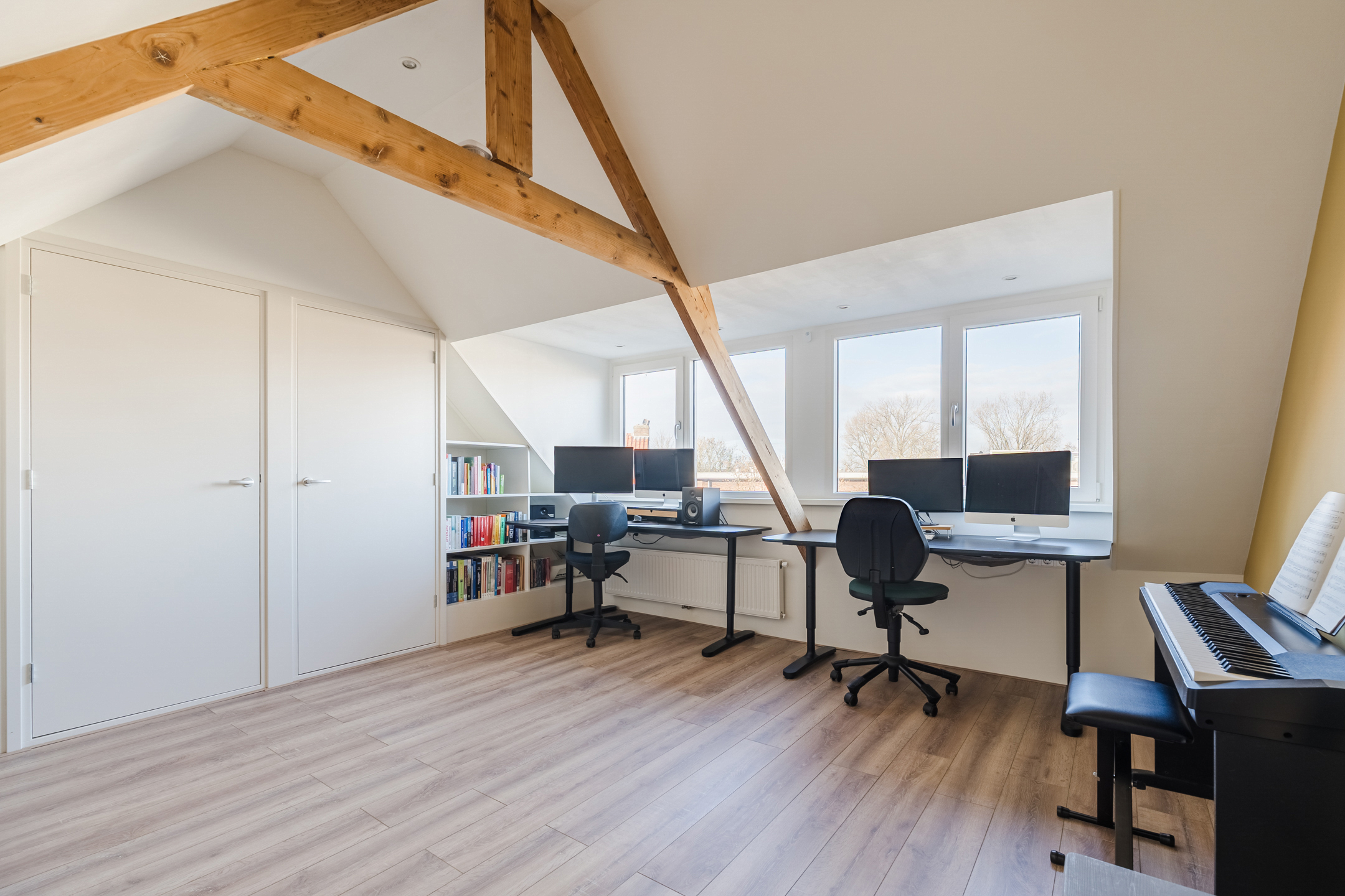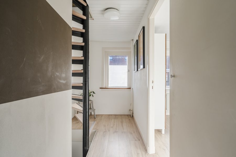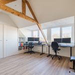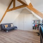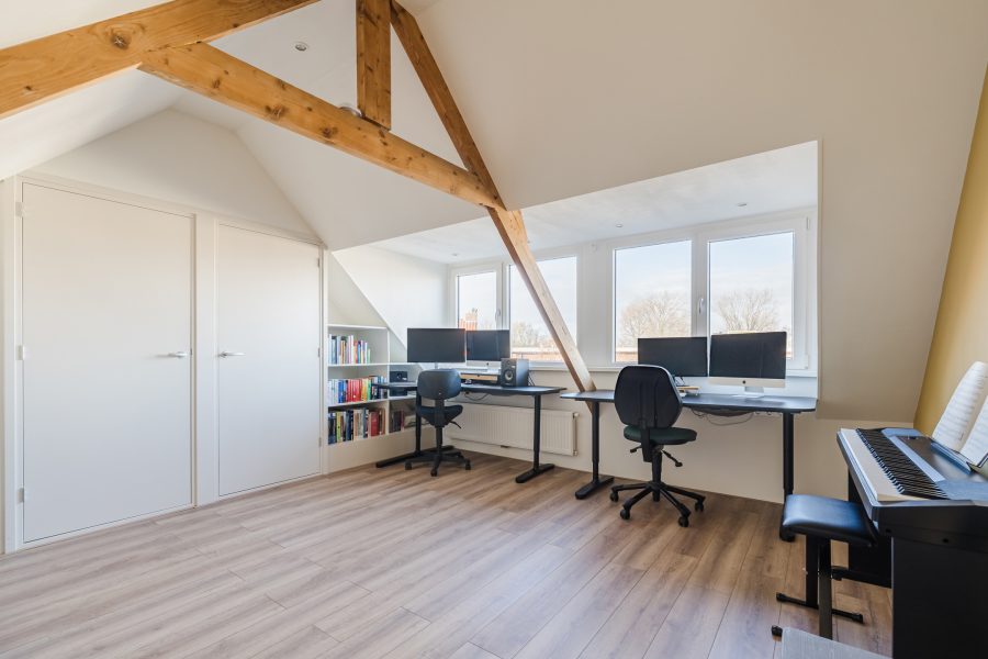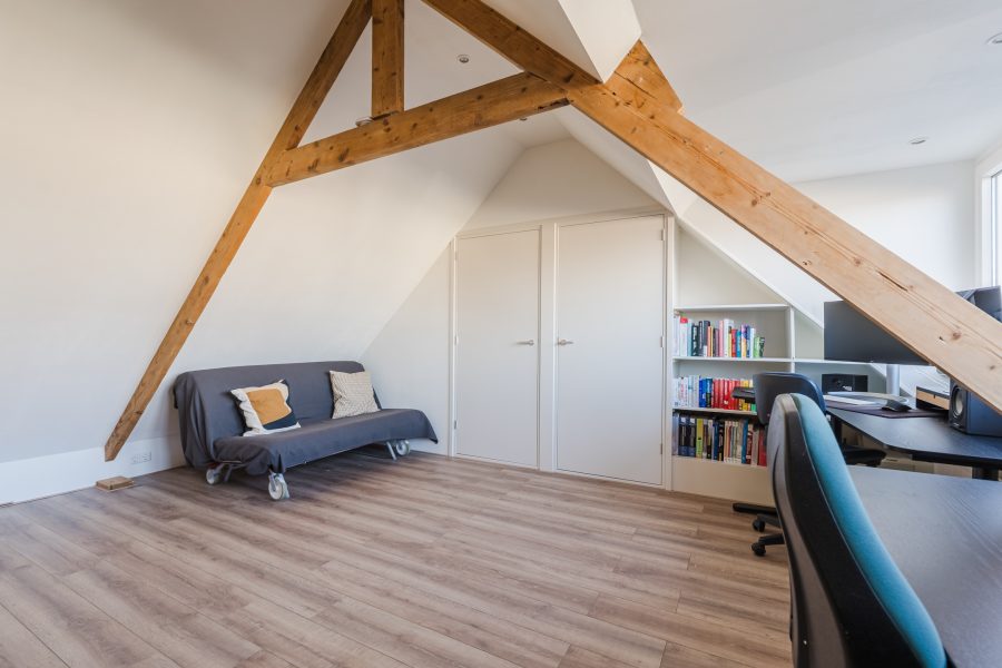 A fixed staircase provides access to the attic. This floor is very spacious and light thanks to the dormer window at the back and is further illuminated with recessed spotlights. Thanks to the available space, there are plenty of possibilities. This floor is ideal as a workplace or hobby room, but can also be used as an extra bedroom. Storage space has been created at the back.