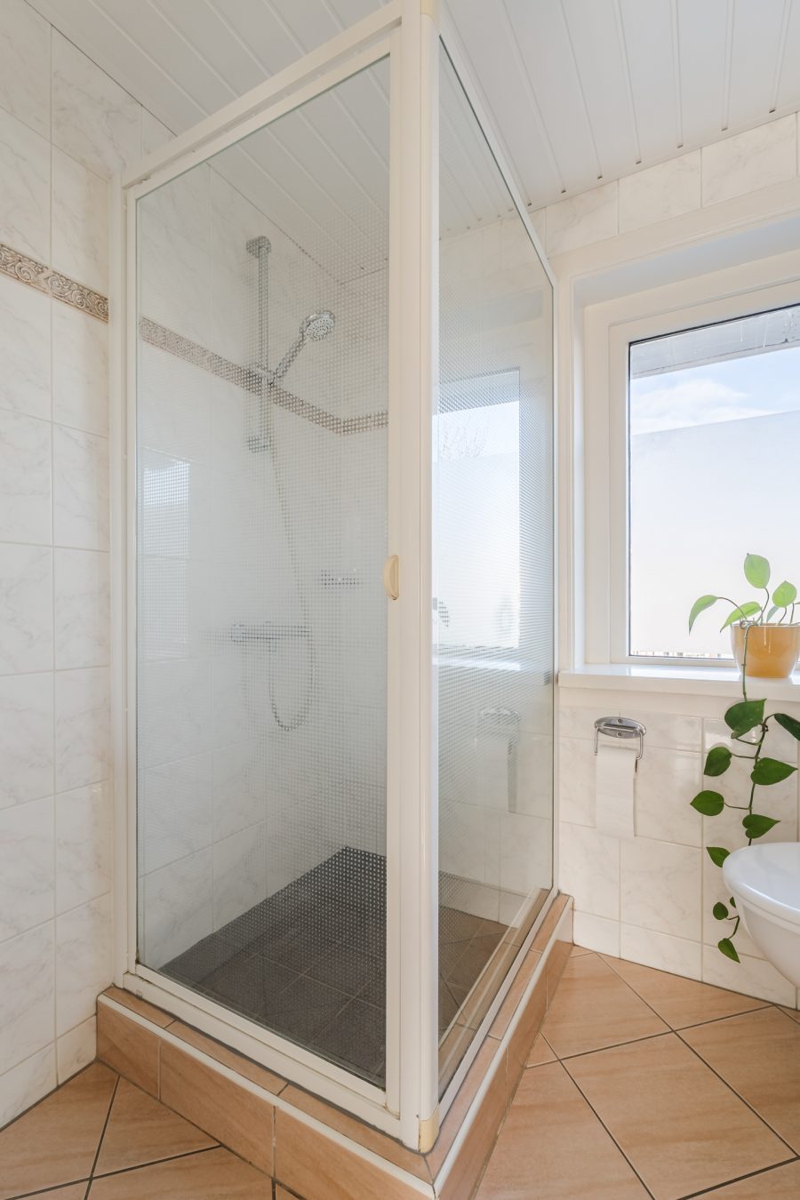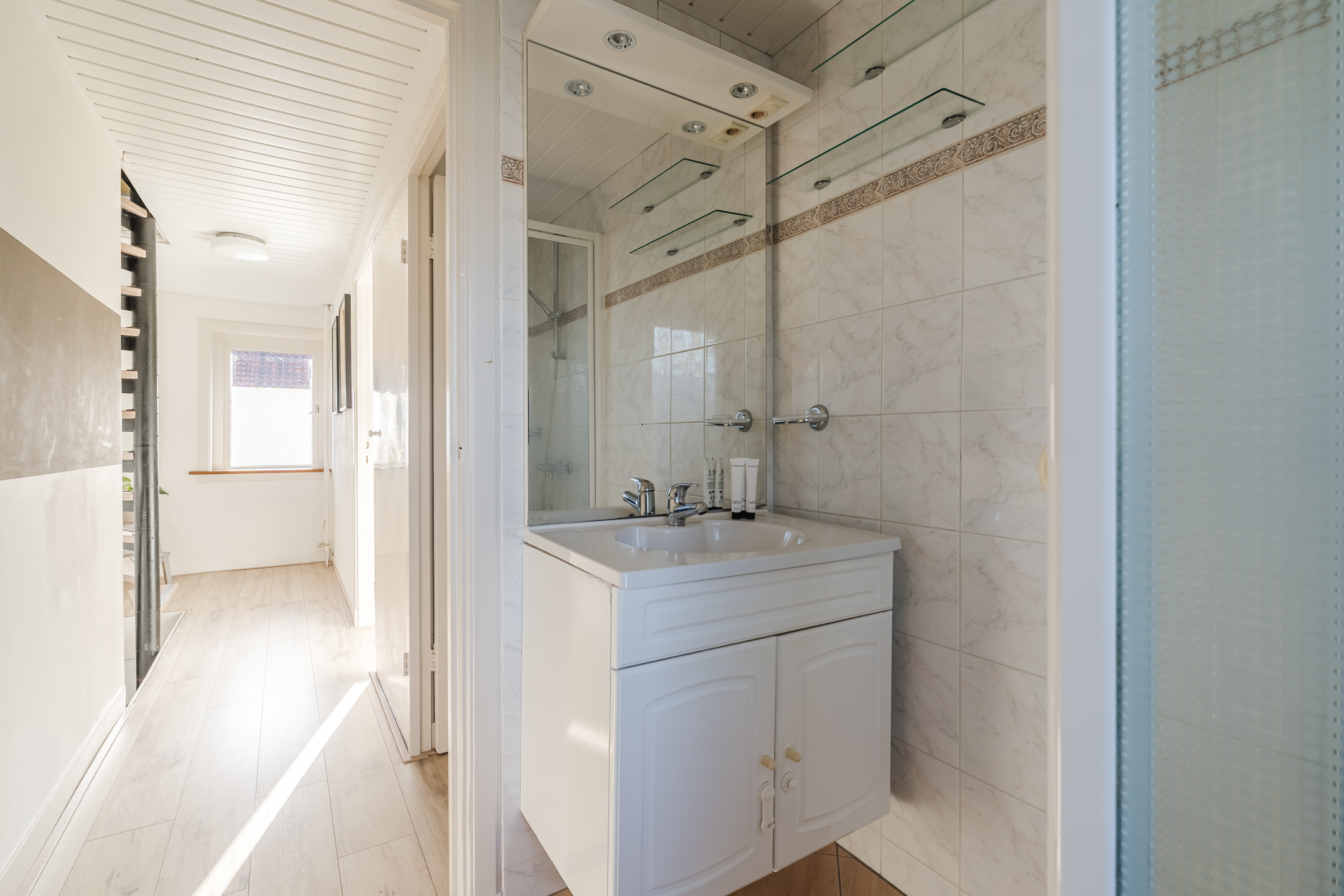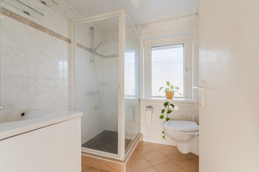 De badkamer bevindt zich aan de achterzijde op deze verdieping. Deze ruimte is netjes betegeld en uitgerust met een zwevend toilet, badmeubel met wastafel en douchecabine.