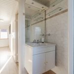The bathroom is located at the back of this floor. This room is nicely tiled and equipped with a floating toilet, vanity unit with sink and shower cabin.