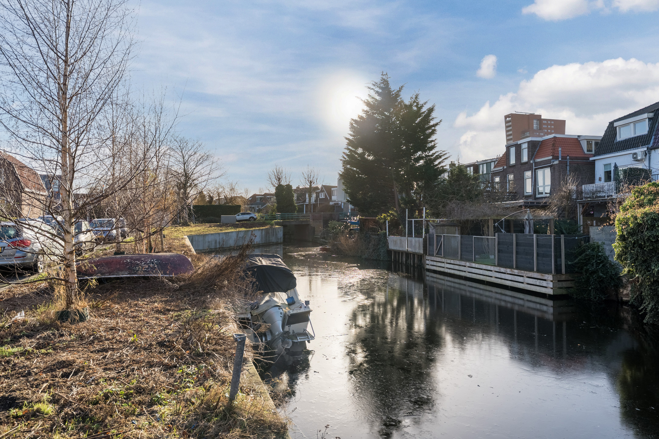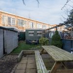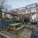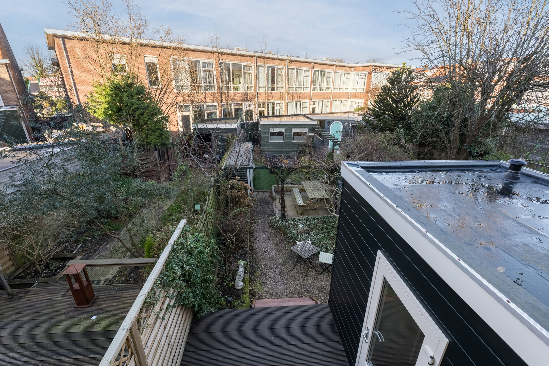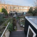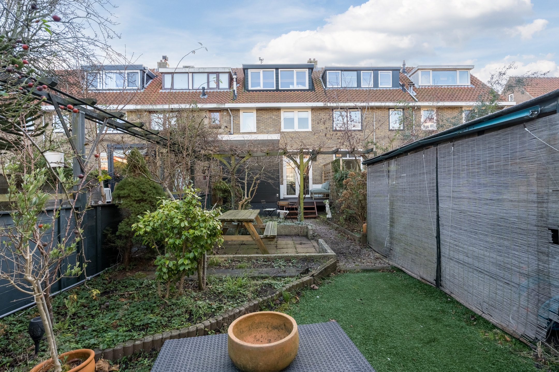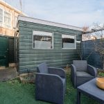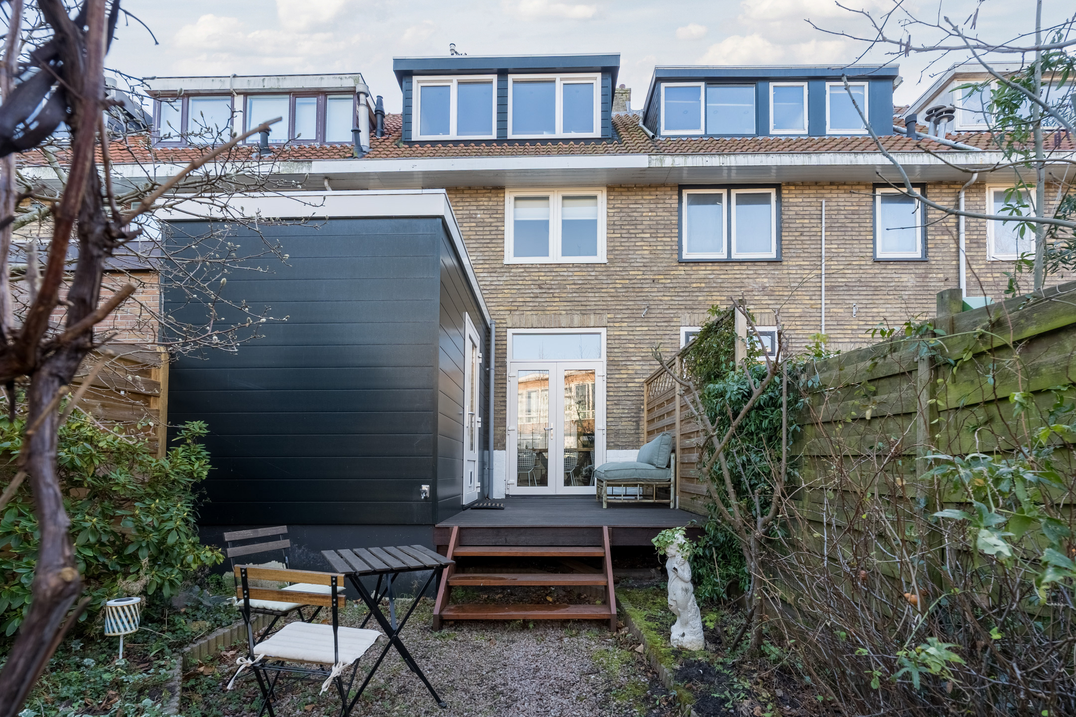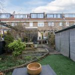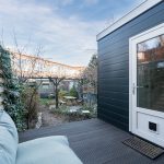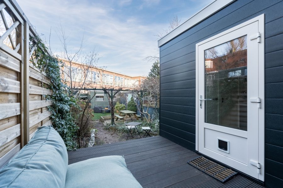 The house has a deep backyard, which is decorated with wooden decking, tiles and greenery. There is enough space for several cozy seating areas. It is a wonderful place to relax when the sun is shining! The garden is well sheltered, giving you plenty of privacy. At the back is a storage shed with enough space for your garden tools and bicycles. The garden is accessible via a back entrance.