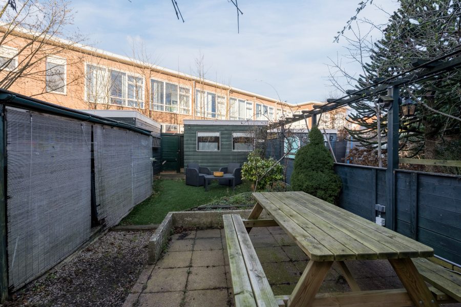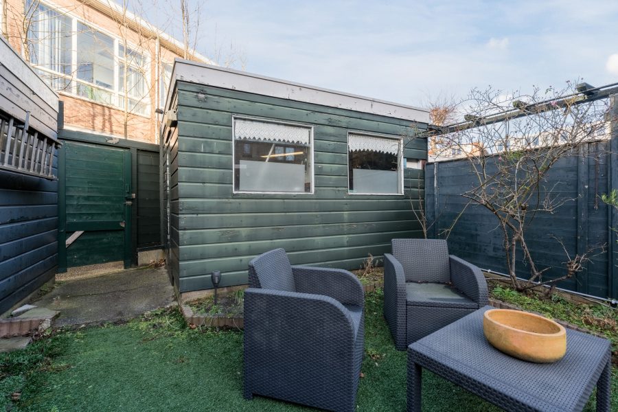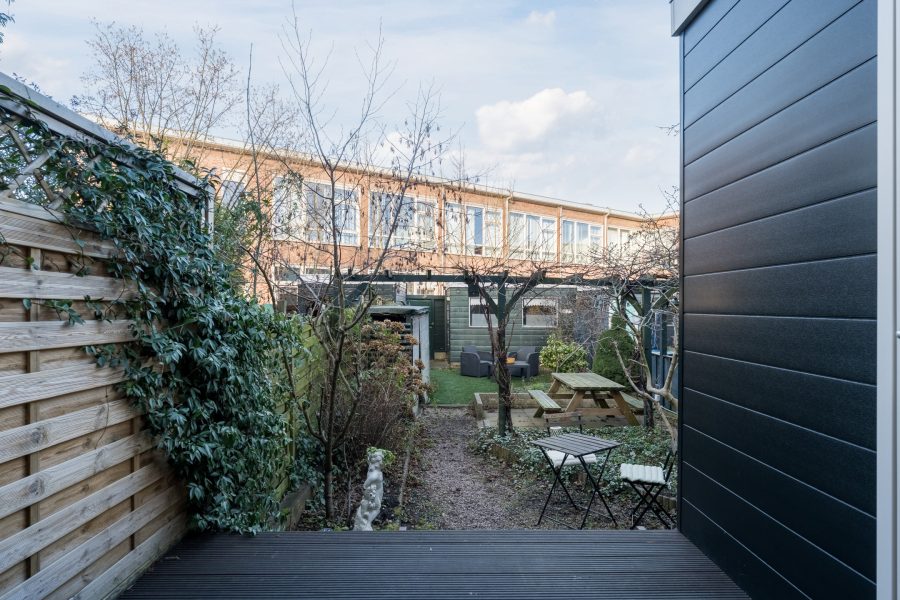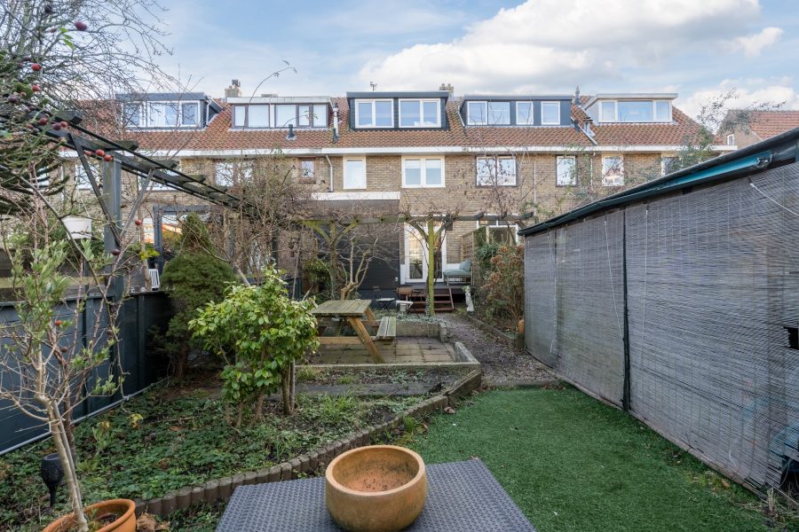 Het huis beschikt over een diepe achtertuin, die is ingericht met houten vlonderplanken, tegels en groen. Er is voldoende ruimte voor meerdere gezellige zitjes. Het is hier dan ook heerlijk toeven als het zonnetje schijnt! De tuin is goed beschut, waardoor je veel privacy ervaart. Achterin staat een berging met genoeg plek voor je tuinspullen en fietsen. De tuin is bereikbaar via een achterom.