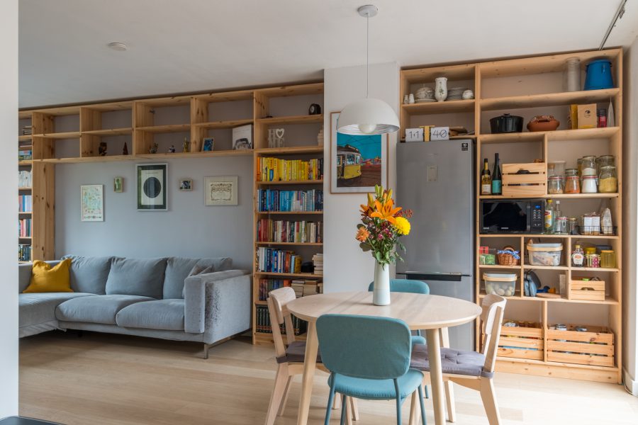 Via de buitentrap bereiken we de eerste verdieping en de voordeur van de woning. Entree met garderobe en zwevend toilet met fonteintje, trapopgang naar de eerste verdieping, trapkast en open toegang tot de woonkamer met open keuken. De lichte woonkamer heeft een mooie natuurlijke lichtinval. Aan de voorzijde bevindt zich een grote raampartij en aan de achterzijde een raam ter hoogte van de keuken en een schuifpui naar het dakterras. Aan de voorzijde is plaats voor een zithoek en ter hoogte van de keuken kan een eettafel worden geplaatst. De keuken (Ikea) heeft grijze fronten en de volgende hoogwaardige apparatuur is aanwezig: een vaatwasser, een oven, een stoomoven, een magnetron en een inductiefornuis. De woonkamer is minimalistisch gestyled. De kasten zijn speciaal ontworpen voor de kamer. Op de vloer ligt fraai pvc-laminaat en de muren en plafonds zijn strak afgewerkt.