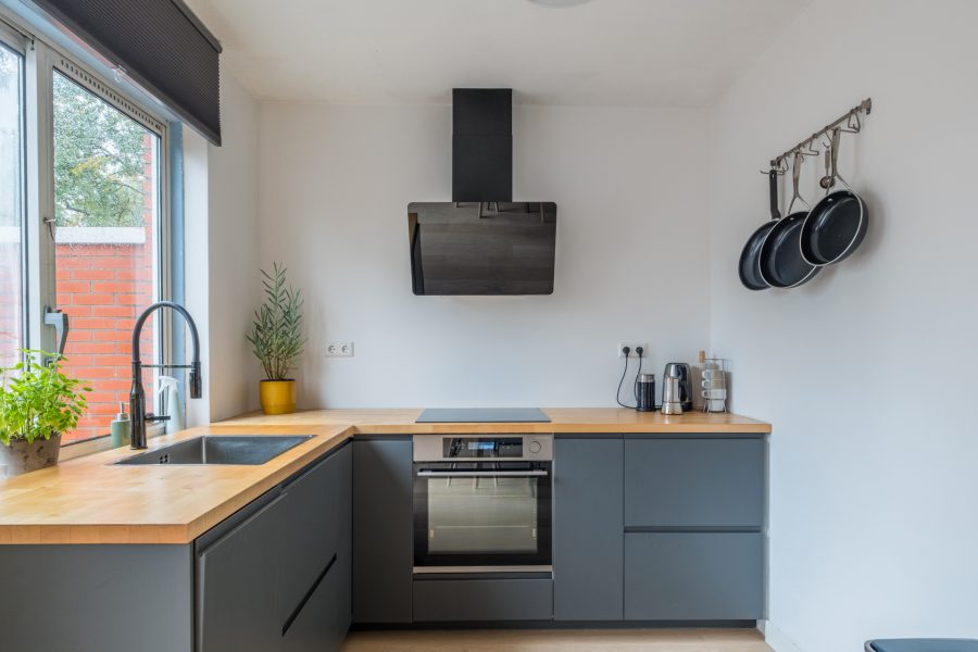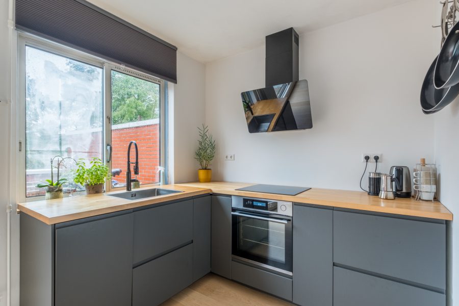 Via the outside stairs we reach the first floor and the front door of the house. Entrance with cloakroom and floating toilet with hand basin, staircase to the first floor, stairs closet and open access to the living room with open kitchen. The bright living room has a nice natural light. At the front there is a large window and at the back a window near the kitchen and sliding doors to the roof terrace. There is room for a seating area at the front and a dining table near the kitchen. The kitchen (Ikea) has grey fronts and the following high-quality appliances are present: a dishwasher, an oven, a steam oven, a microwave oven and an induction cooker. The living room is minimalist styled. The cabinets are specially designed for the room. On the floor is beautiful PVC laminate and the walls and ceilings are finished neatly.