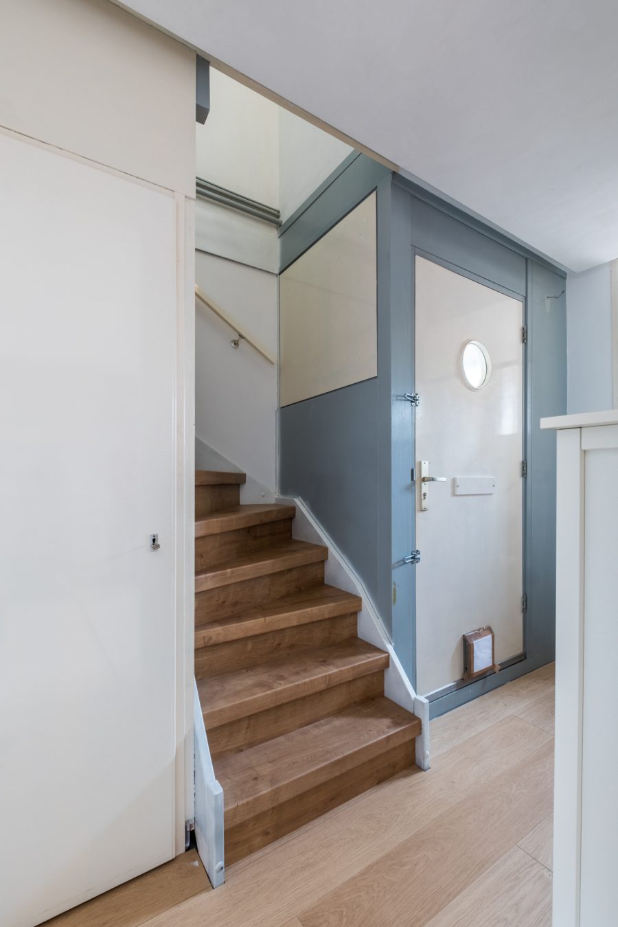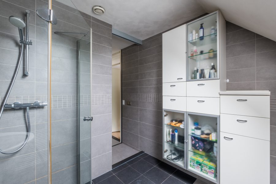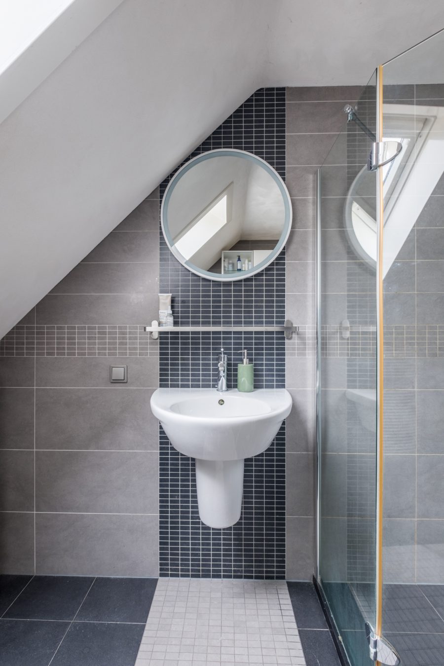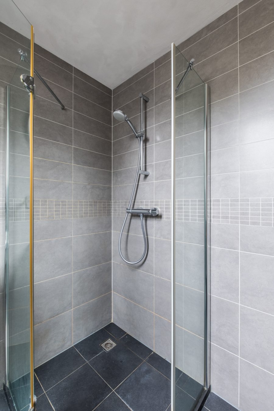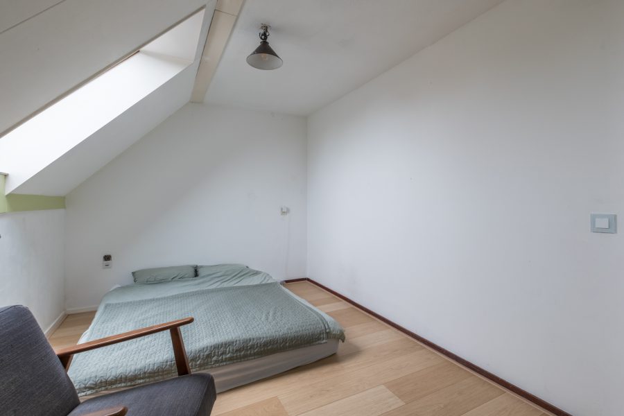 You reach the landing via the beautifully renovated staircase. Here you will find two nicely finished bedrooms, a bathroom and an enclosed room for washer and dryer, equipped with a separate toilet. One bedroom is located at the rear, next to the bathroom, and is fitted with fixed closets. Natural light enters through a window and a Velux skylight. The new contemporary bathroom has a vanity unit, a washbasin with mirror, designer radiators and a walk-in shower. At the front is the second, spacious bedroom. Here too, natural light enters via a window and a Velux skylight. In this room, you will find louvered doors to a closet with the connection for washer and dryer, the central heating system and a separate toilet. This room also has PVC flooring.