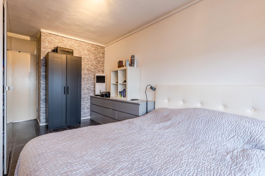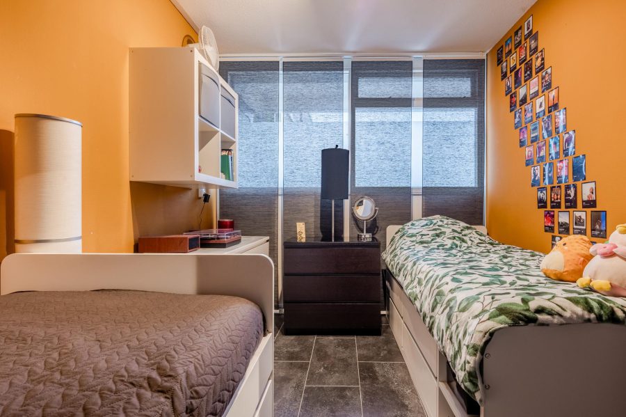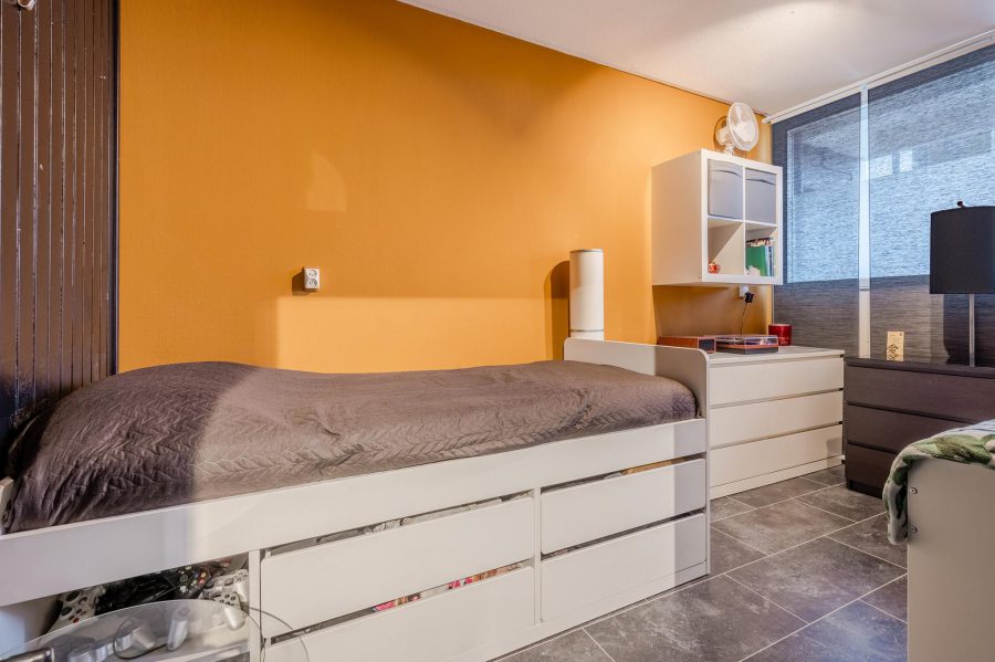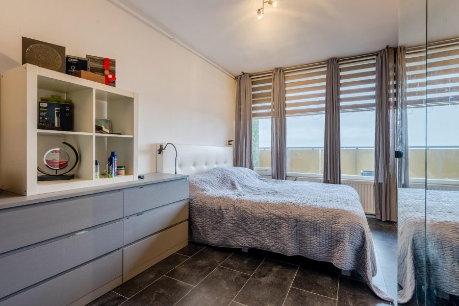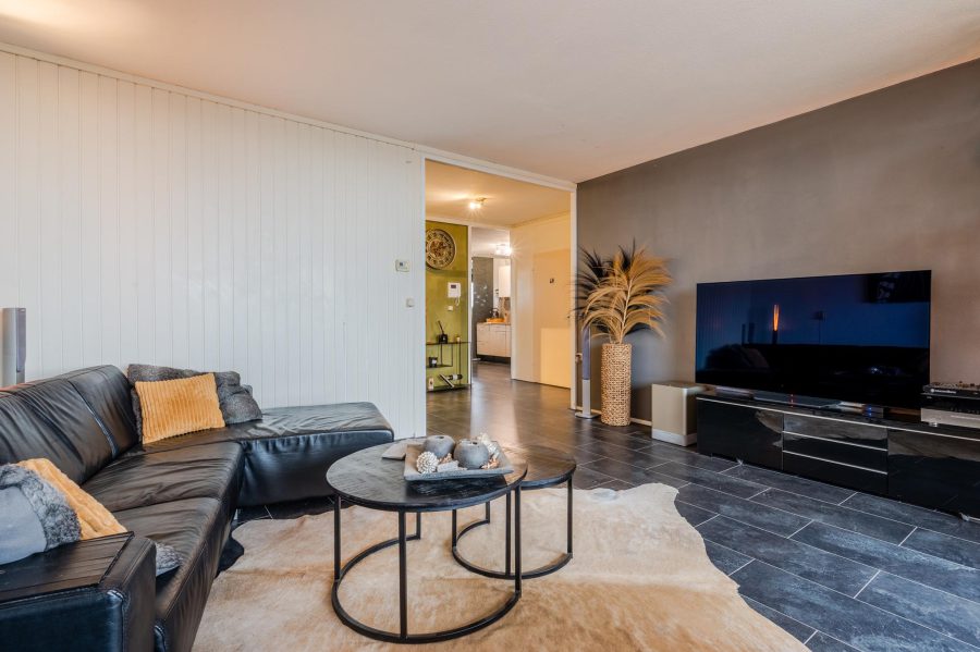 De grootste slaapkamer, aan de voorzijde, heeft een breed raam dat uitkijkt op het balkon en de omgeving. Naast deze slaapkamer ligt de ruime, lichte woonkamer. De woonkamer heeft een brede raampartij en een toegangsdeur tot het balkon (op het oosten). Op de vloer van het gehele appartement ligt tegellaminaat en de muren en plafonds zijn strak afgewerkt. De woonkamer is groot genoeg voor het plaatsen van een tafel en een ruime zithoek.