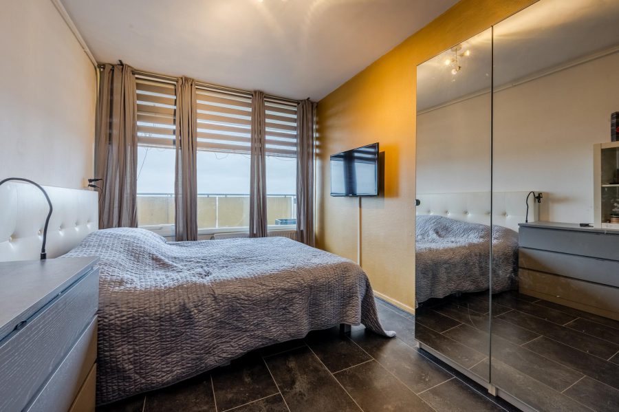 The lift takes you to the 13th floor and to the front door of the apartment. Entrance: you are directly in the spacious kitchen. A wall has been removed here (it used to be a four-room apartment). There is room for a large dining table here. The straight kitchen (2008) has white fronts and is equipped with separate, well-functioning appliances. This room also houses the meter closet. Via an open passage, you enter the living room. Here on your right, next to the kitchen, you will find the first bedroom and a storage room. On your left you will find the standing toilet with hand basin, the bathroom and the second bedroom. The bathroom (2008) has a washbasin with mirror and a walk-in shower with handheld and rain shower. The connection for washer and dryer can also be found here.