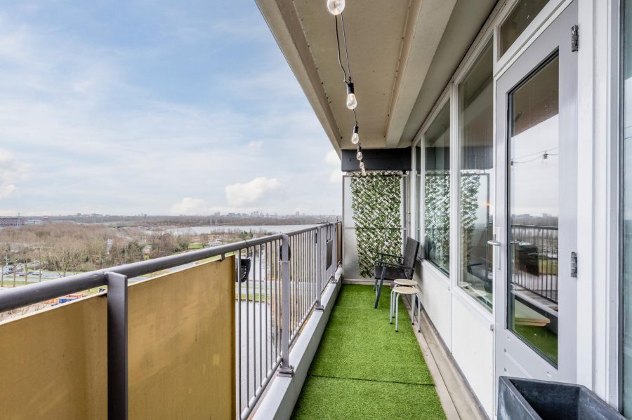 De woning heeft een woningbreed, overkapt balkon op het oosten. Je hebt hier een schitterend uitzicht over het Noorder IJplas. Je hebt hier tot 13.00 uur de zon. Dit zorgt ervoor dat het in de warme zomermaanden heerlijk koel is in het appartement.