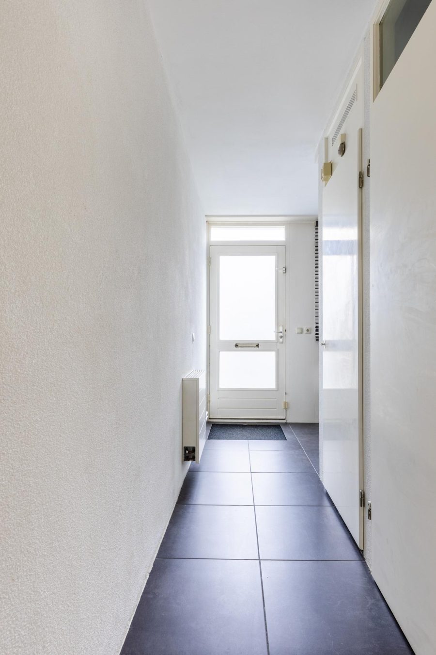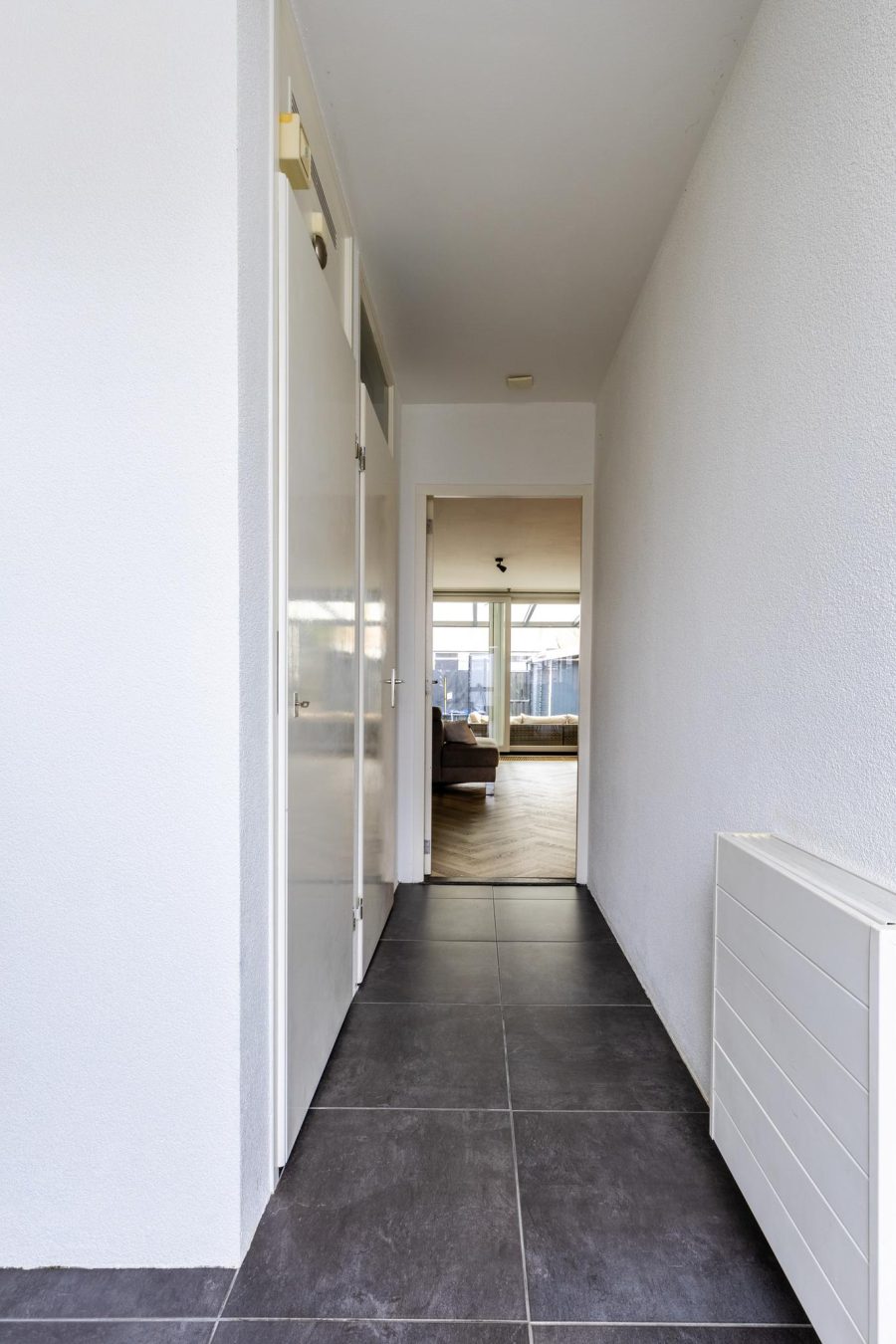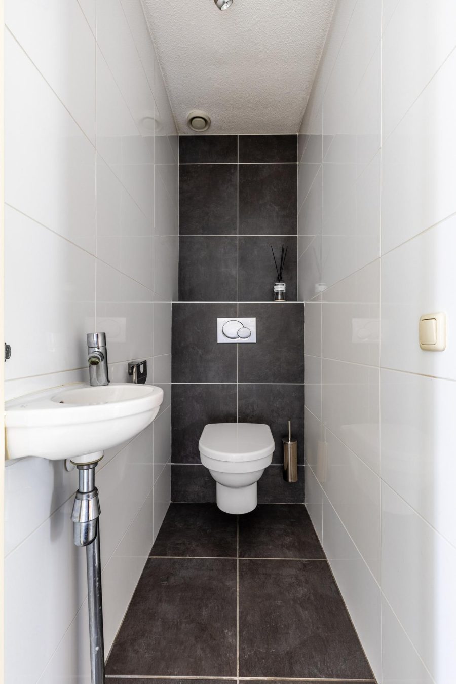 Via de autovrije straat bereik je de voordeur van deze fijne tussenwoning. Achter de voordeur bevindt zich een ruime entreehal, die toegang biedt tot een schuifkast, de meterkast, een fraai betegelde toiletruimte met zwevend toilet en fonteintje, en de woonkamer.
