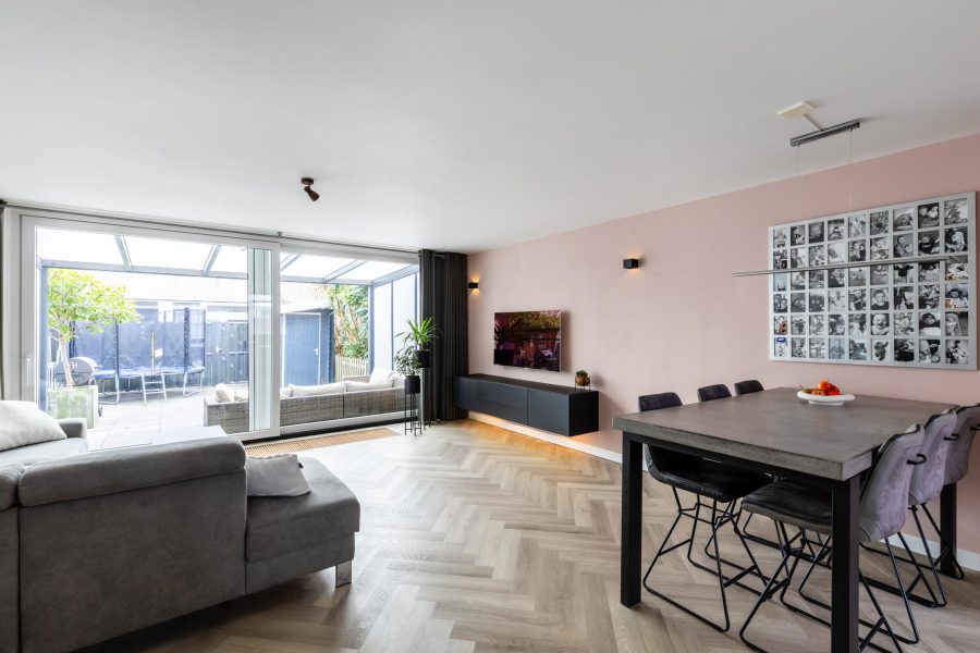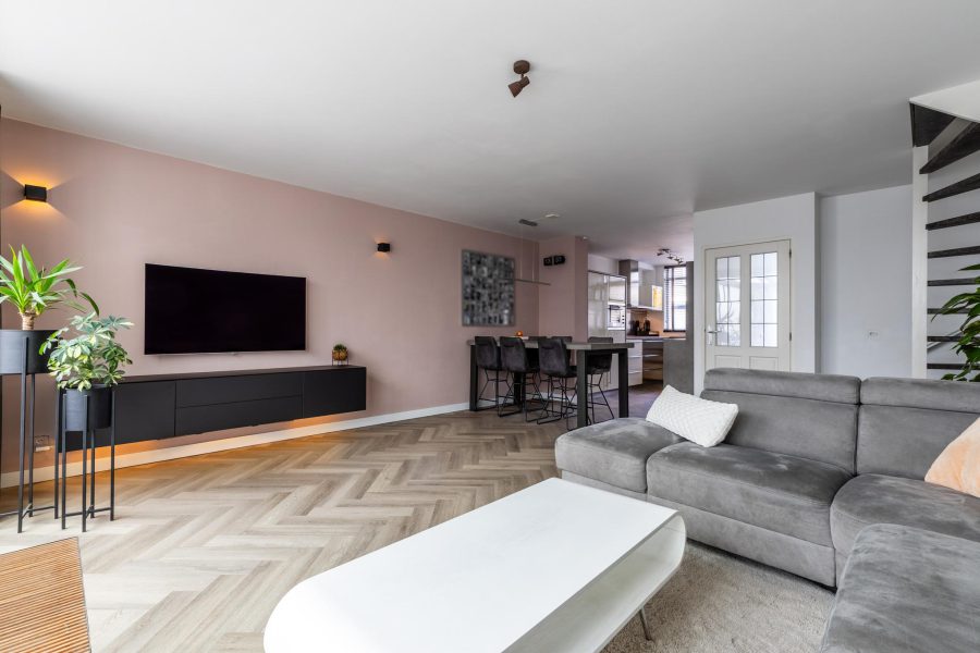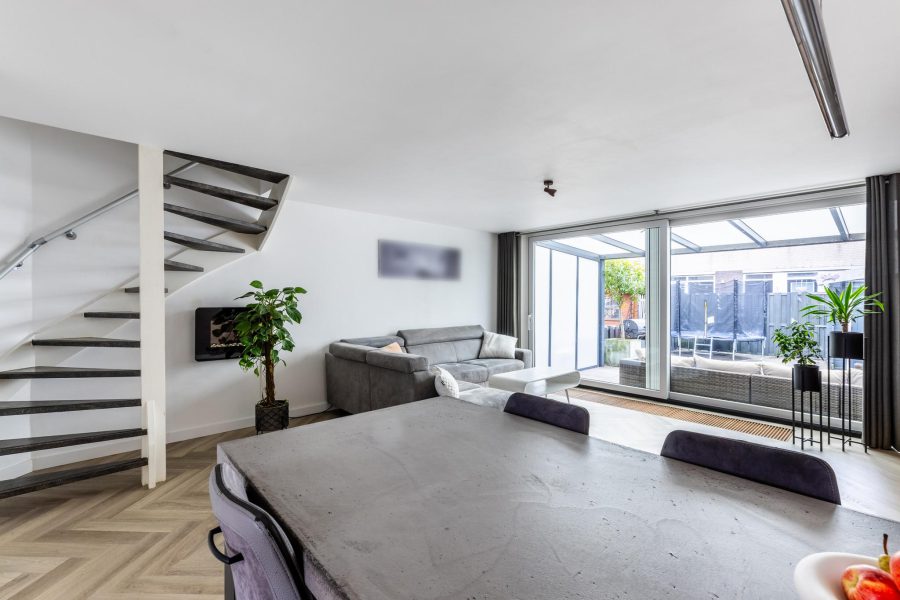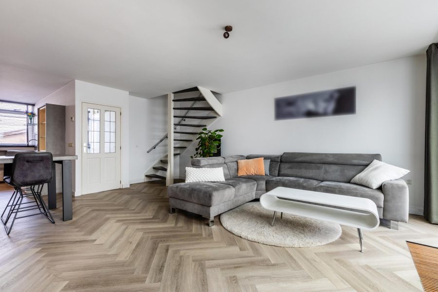 The generous living room features a beautiful herringbone-patterned floor. The walls are neatly finished in calm and soft colors. Thanks to the wide windows at the front and the large sliding doors at the back, there is plenty of natural light. In the living room, you’ll also find the staircase to the first floor.