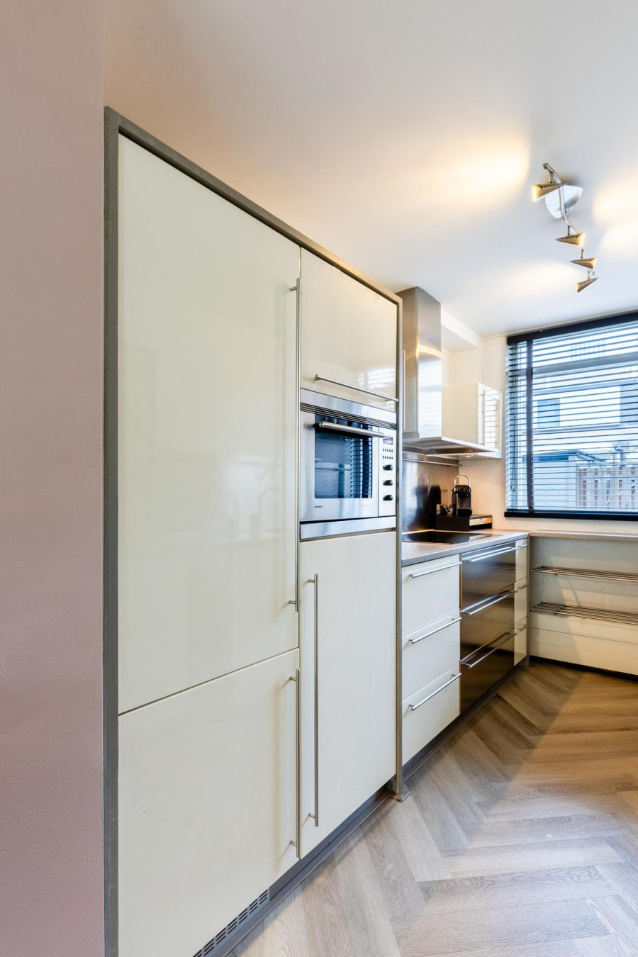 De keuken is aan de voorzijde van het huis te vinden. Deze goed onderhouden keuken bestaat uit twee keukenblokken en is uitgerust met zowel lichte als donkere keukenkastjes. Je treft hier de volgende apparatuur aan: (nieuwe, uit 2024) vaatwasser, kookplaat, magnetron, afzuigkap en koelkast. De inbouwapparatuur is afkomstig uit 2014.