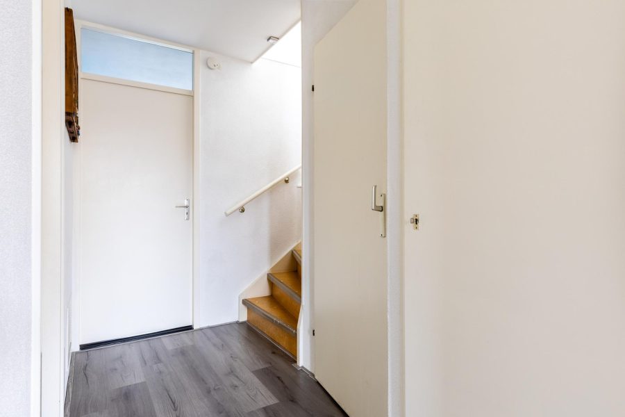 Via the car-free street, you reach the front door of this lovely terraced house. Behind the front door is a spacious entrance hall, which provides access to a sliding closet, the meter cupboard, a beautifully tiled toilet room with a floating toilet and sink, and the living room.