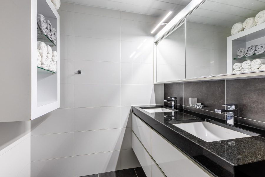 The large, beautifully tiled bathroom is centrally located on this floor. Fully renovated eight years ago, the bathroom features a floating toilet, vanity unit with double sinks, whirlpool bathtub, and a spacious walk-in shower with a rain showerhead. The space is illuminated by recessed spotlights and equipped with underfloor heating.