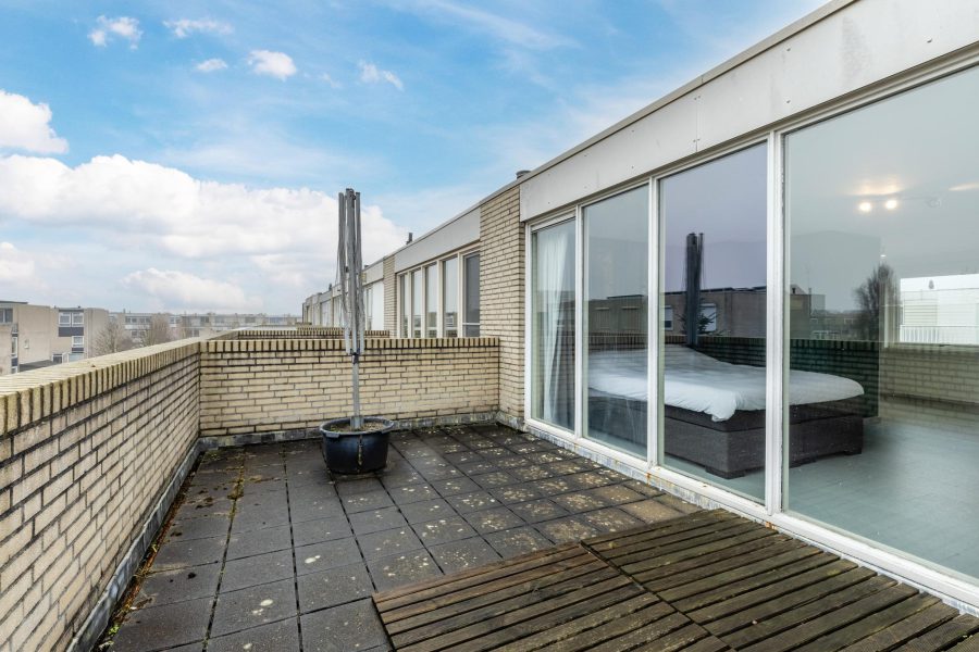 Op zolder zijn ook een grote schuifkast en de wasmachine- en drogeraansluitingen te vinden. Via een openslaande deur heb je toegang tot een royaal dakterras. Dit dakterras is betegeld en biedt ruimte om meubels te plaatsen.