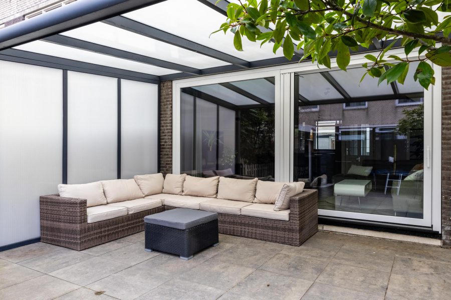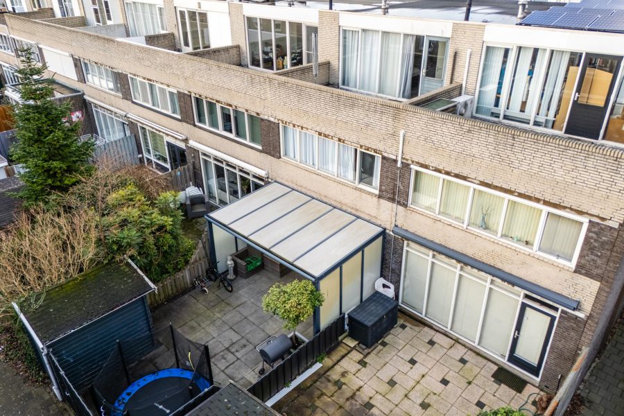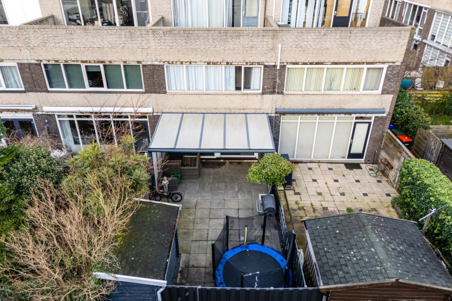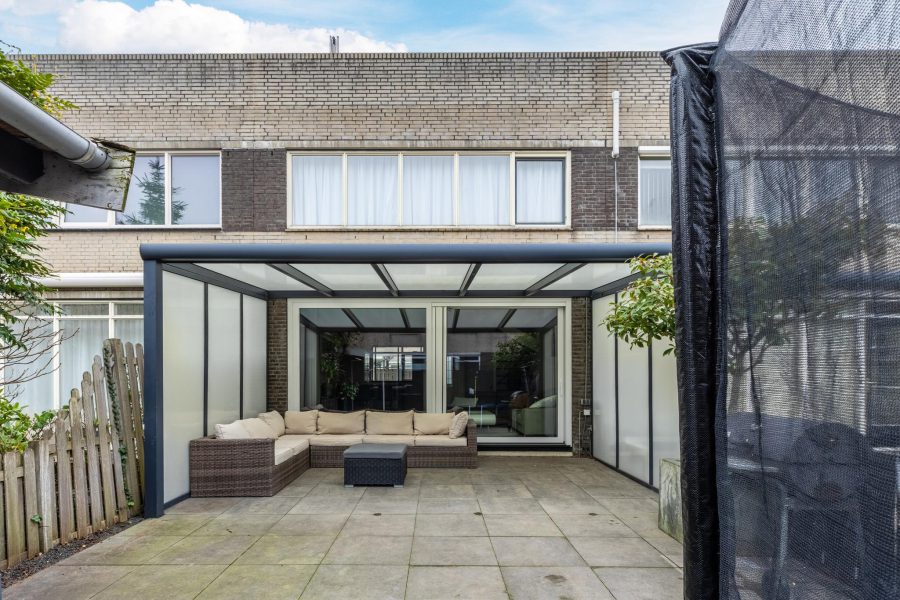 Het huis heeft een ruime en fraai aangelegde achtertuin welke in 2020 volledig is vernieuwd. De tuin is betegeld en biedt voldoende ruimte om een comfortabele loungeplek in richten. Aan het huis grenst een grote overkapping, die het mogelijk maakt om overdekt te loungen.