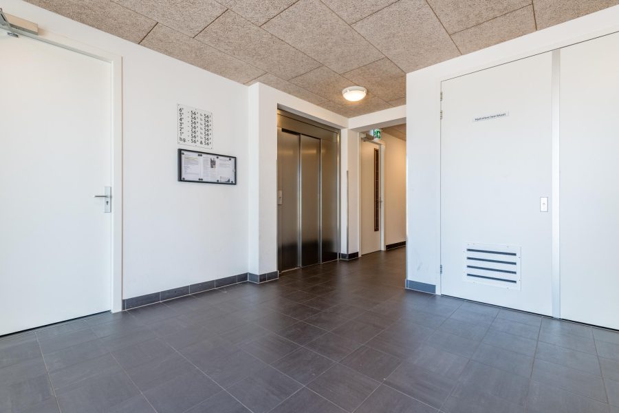 Gesloten entree met bel en intercom. Gemeenschappelijke hal met trappenhuis en lift.
