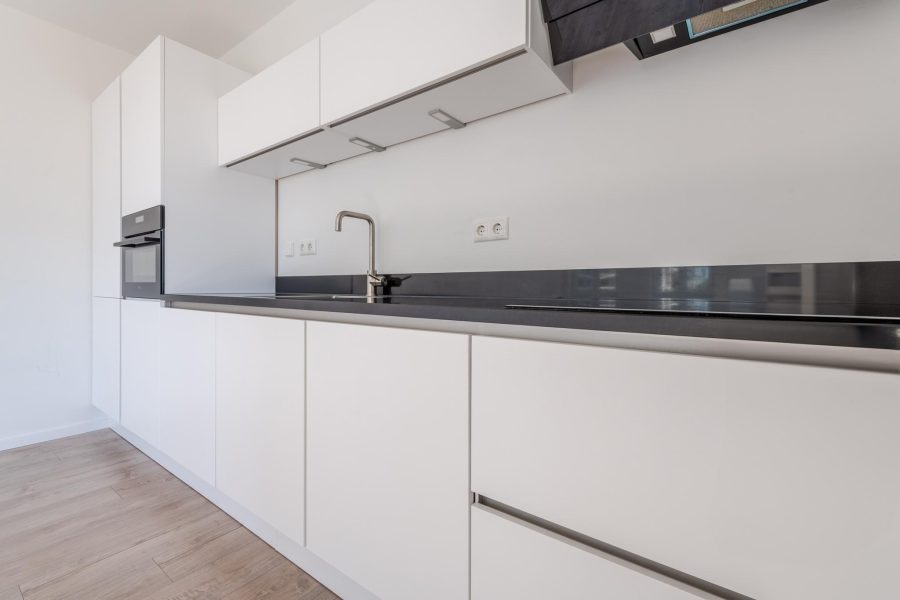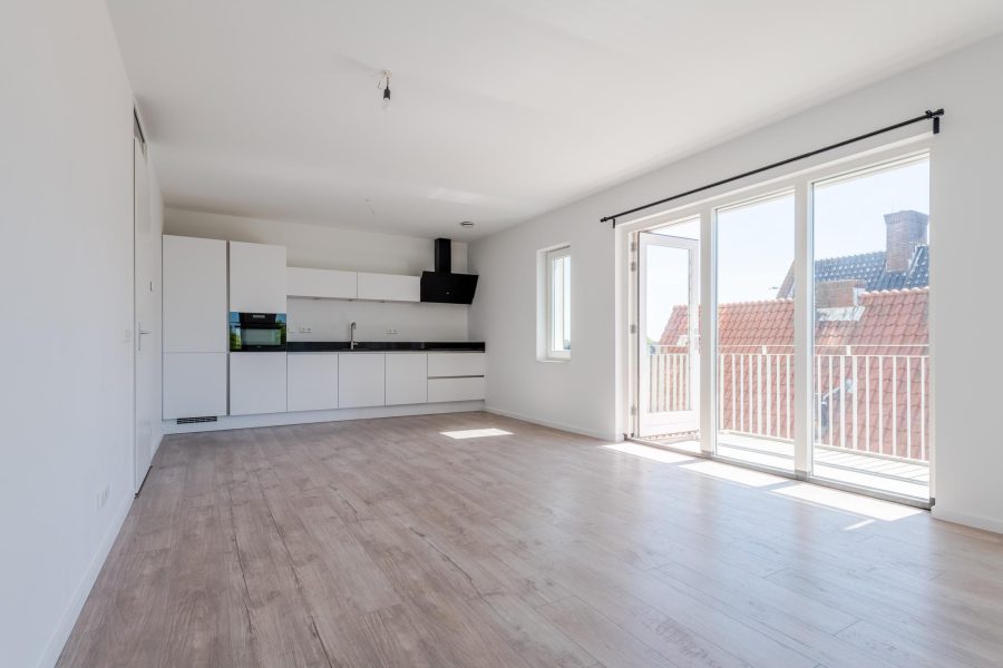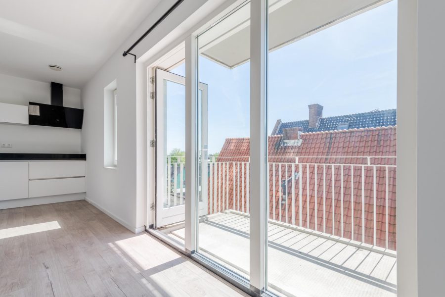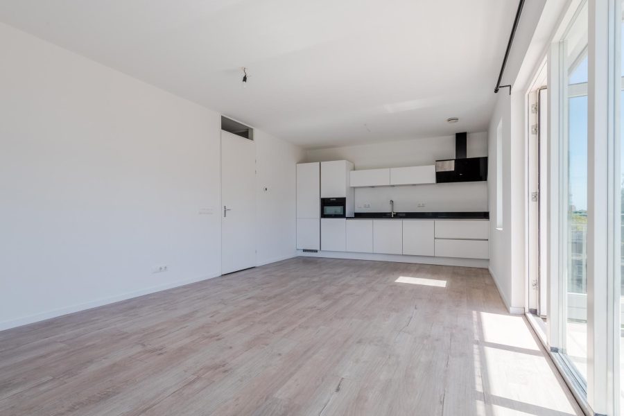 With the lift you reach the 3rd floor and the front door of the apartment. Entrance with cloakroom and immediately to your right you will find three bedrooms. Two bedrooms are at the front and both have French balcony doors, the third bedroom is centrally located on the floor and has two windows. Further down the hallway you will find a storage room. This storage room has a door to the outside of the house. Here you will find the connection for washer and dryer and the technical installation. A little further down the hallway, you will find the separate toilet and bathroom. The bathroom has a washbasin with mirror and a walk-in shower. At the end of the hallway, you will find the spacious bright living room with open kitchen. The straight kitchen has white fronts and is equipped with built-in appliances. You cook electric here. The bright living room has five windows and a sliding door to a balcony with unobstructed views. Here you can create a nice lounge area and relax with a drink in the summer months. The entire apartment has a beautiful PVC floor with underfloor heating underneath and the walls and ceilings are finished in a sleek and neutral style.
