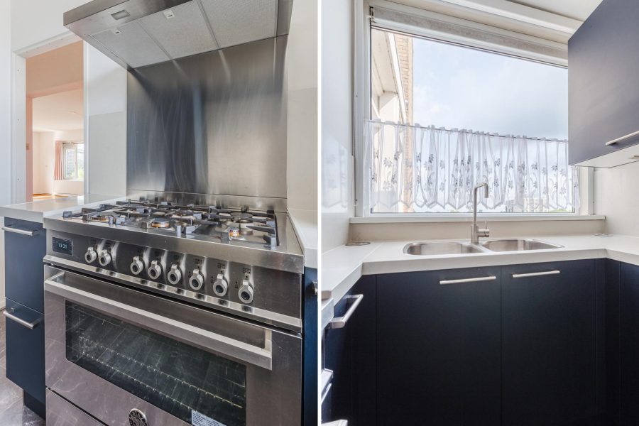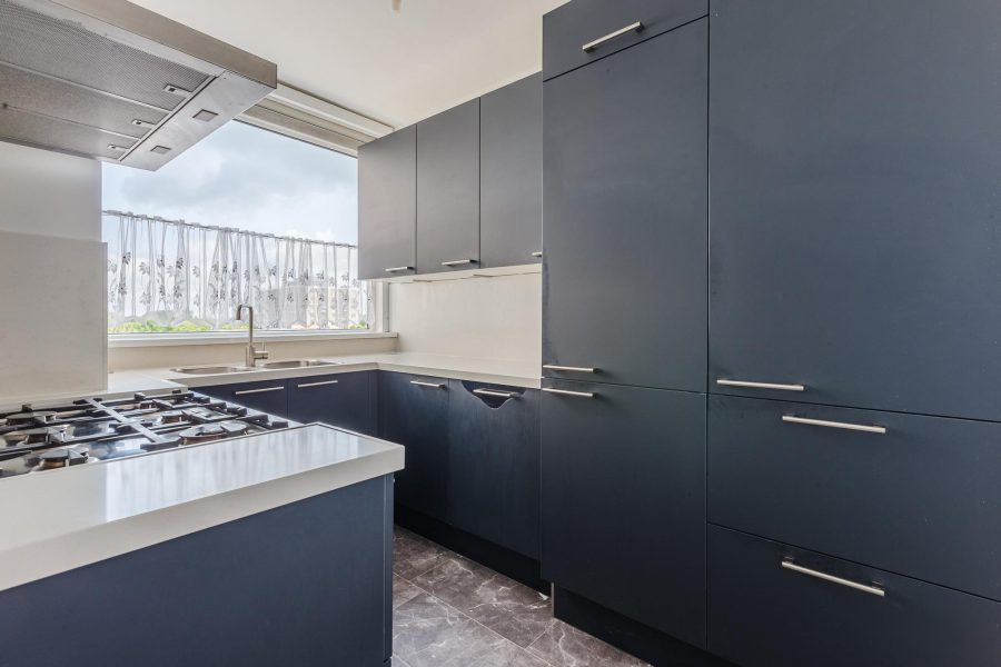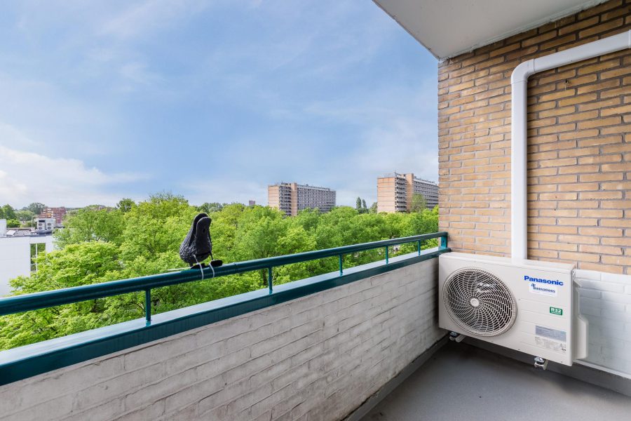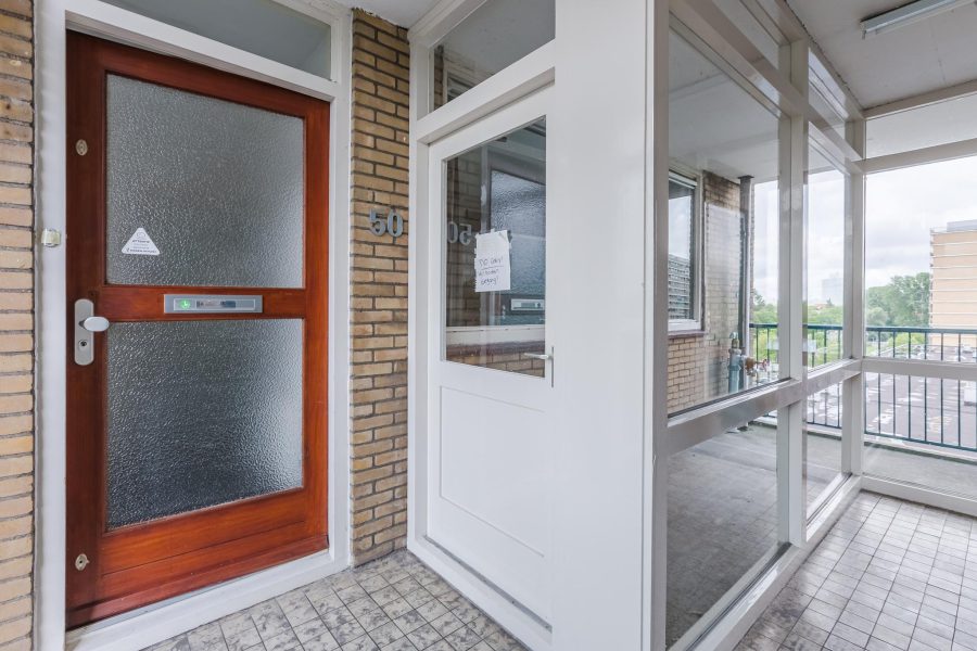 Met de lift bereiken we de galerij op de vijfde verdieping en de voordeur van de woning. Entree met meterkast en garderobe en tochtdeur naar de hal. In de hal tref je direct aan je linkerhand een open doorgang naar de luxe keuken aan. De U-vormige keuken (2018) is voorzien van diverse inbouwapparatuur o.a. een zespits gasfornuis met oven. Verderop in de gang tref je het separate zwevende toilet aan, de badkamer, en aan het eind van de gang een slaapkamer met toegang tot het zonnige balkon. In de lichte badkamer zijn een wastafel met spiegelkast, een designradiator en een inloopdouche met hand- en regendouche te vinden. Ook de aansluiting voor het witgoed tref je hier aan.