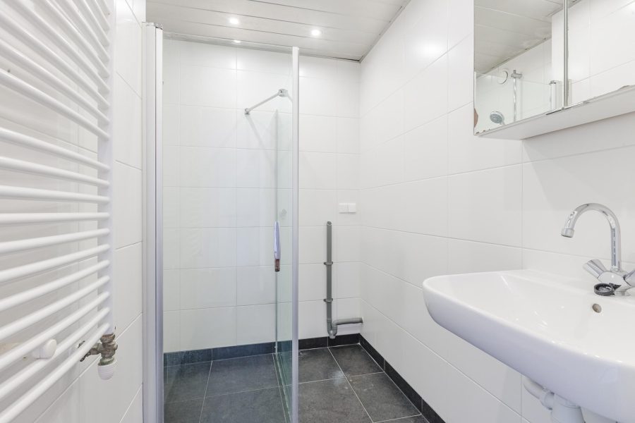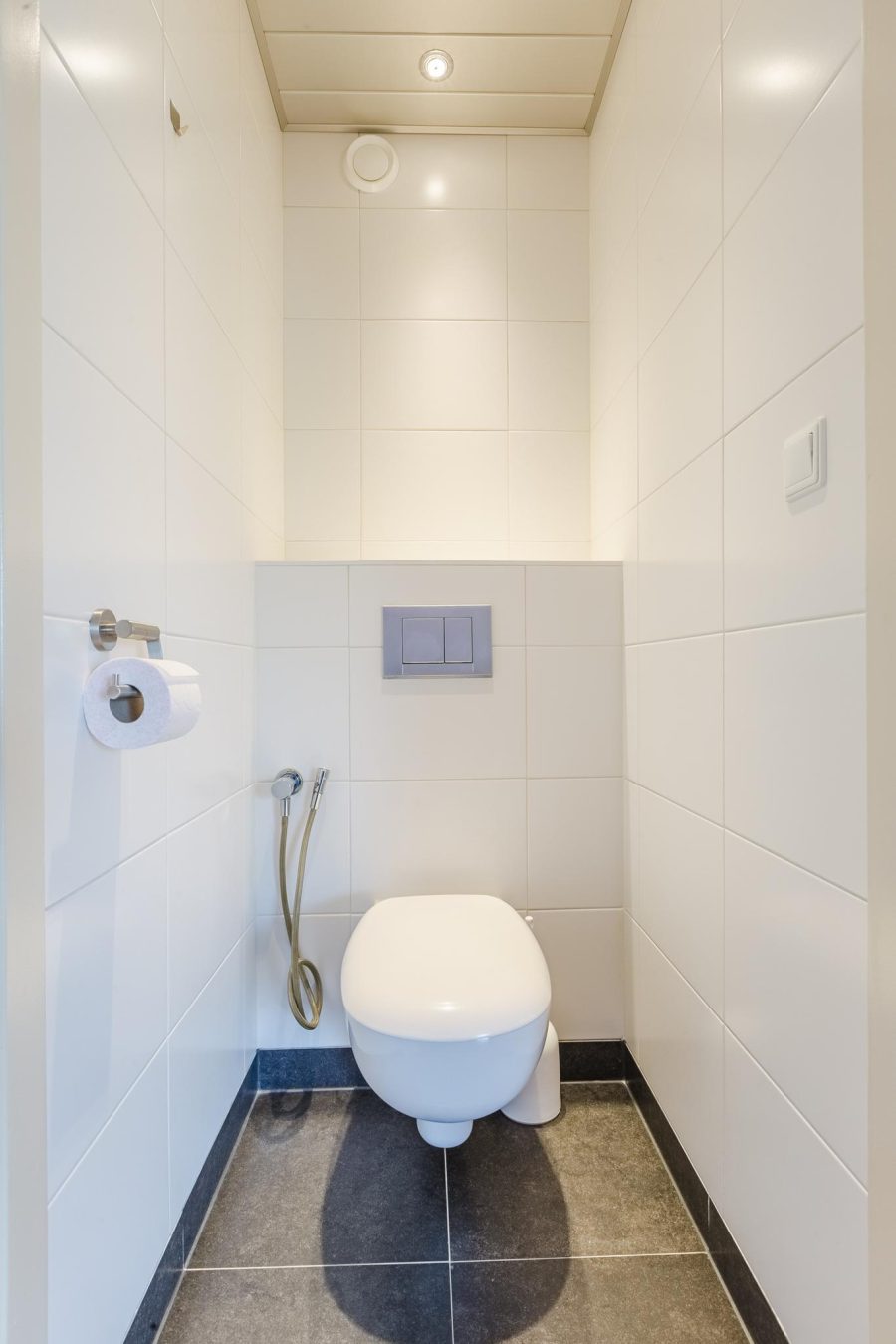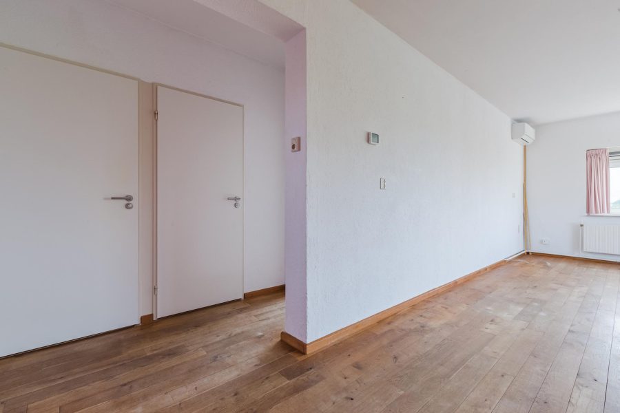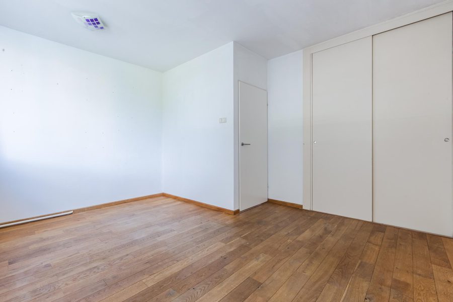 In het gehele appartement ligt een drempelloze houten vloer en de muren en plafonds zijn strak en neutraal afgewerkt.