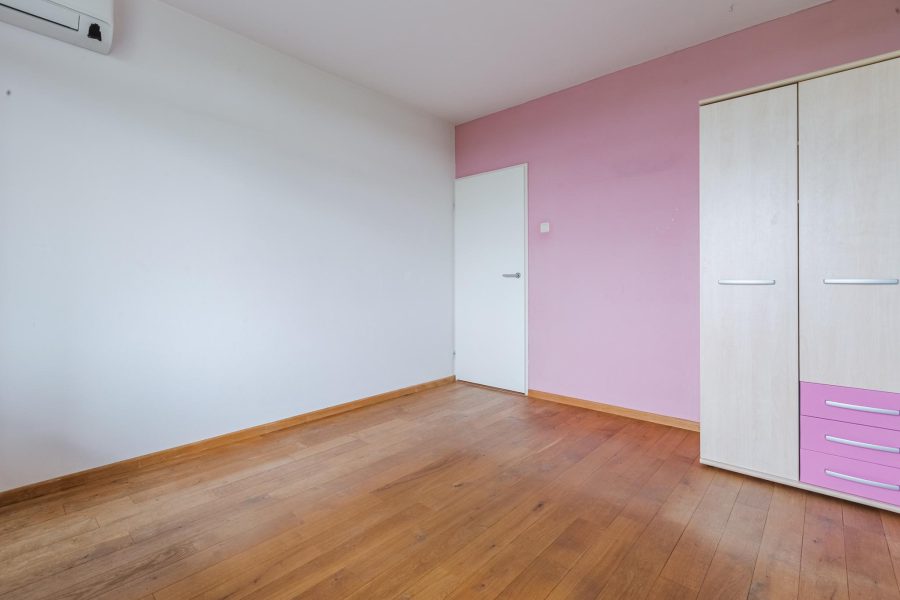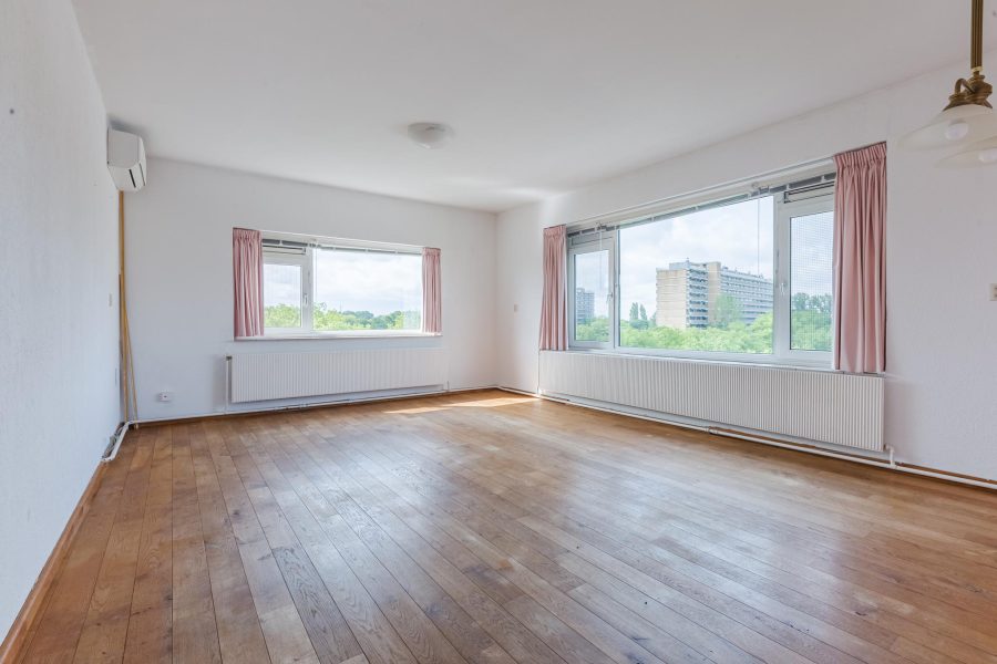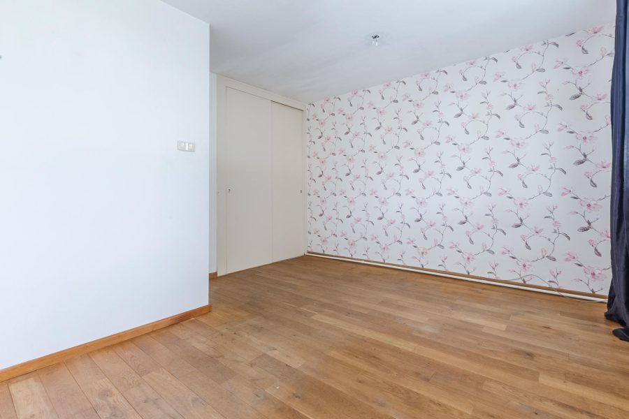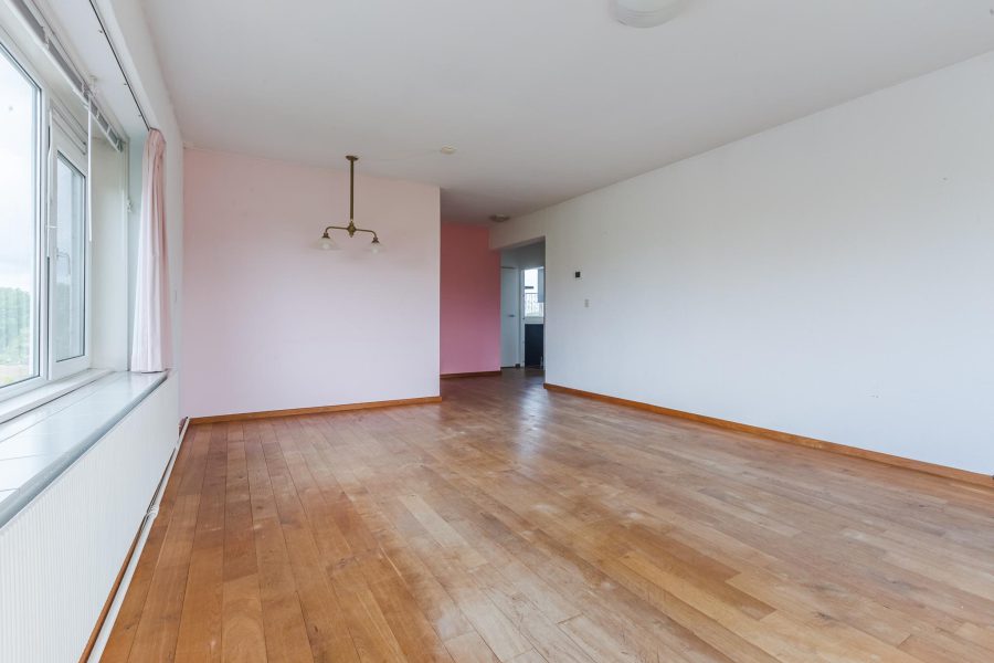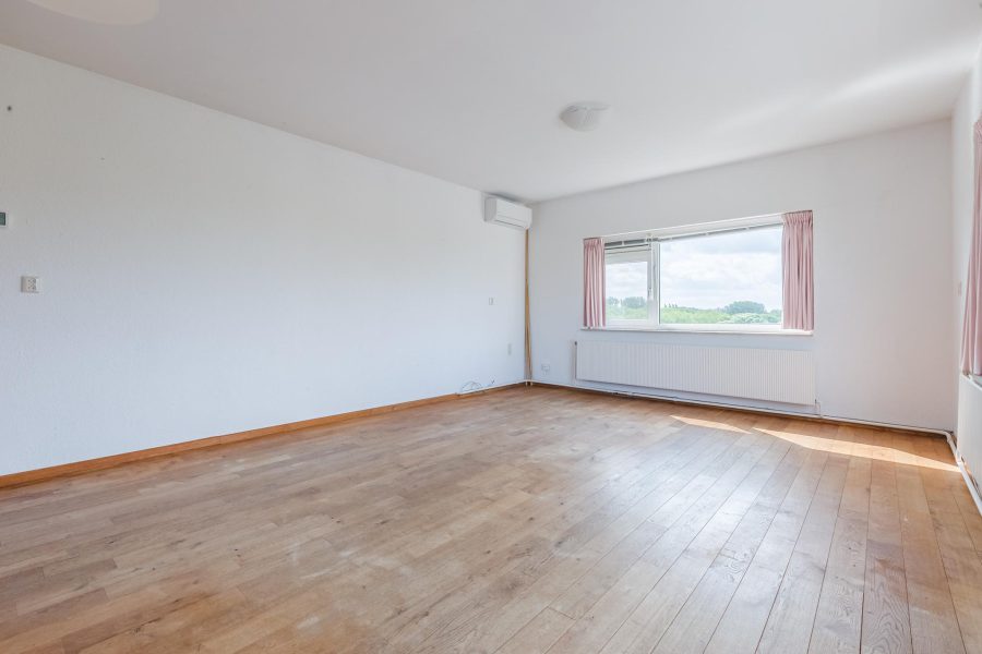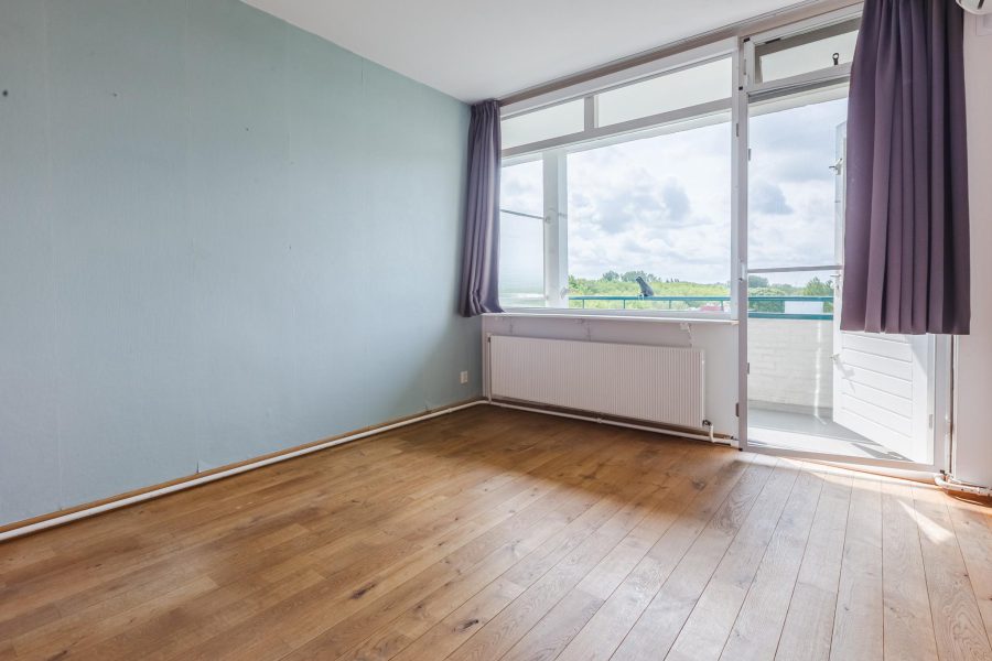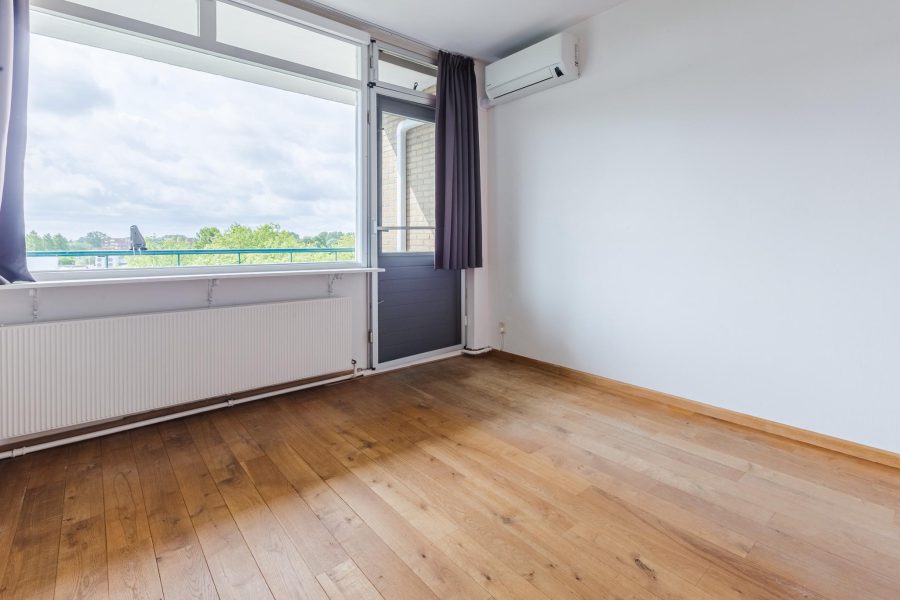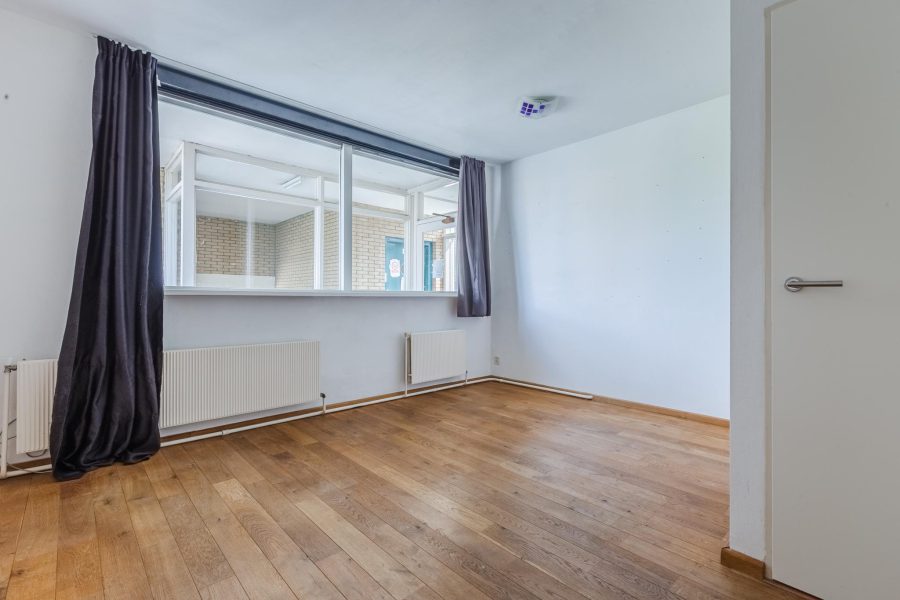 Aan je linkerhand in de hal is de open doorgang naar de lichte woonkamer. De woonkamer heeft aan de voorzijde en in de zijmuur een brede raampartij. Je hebt hier een prachtige lichtinval en een vrij uitzicht over de omgeving. Achterin de woonkamer tref je een vaste kast aan en de toegang tot de ruime tweede slaapkamer. Hier is plaats genoeg voor een tweepersoonsbed en een werkplek. Deze slaapkamer is voorzien van een vaste kast.