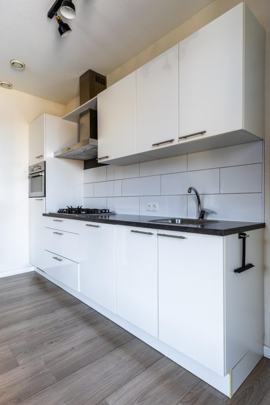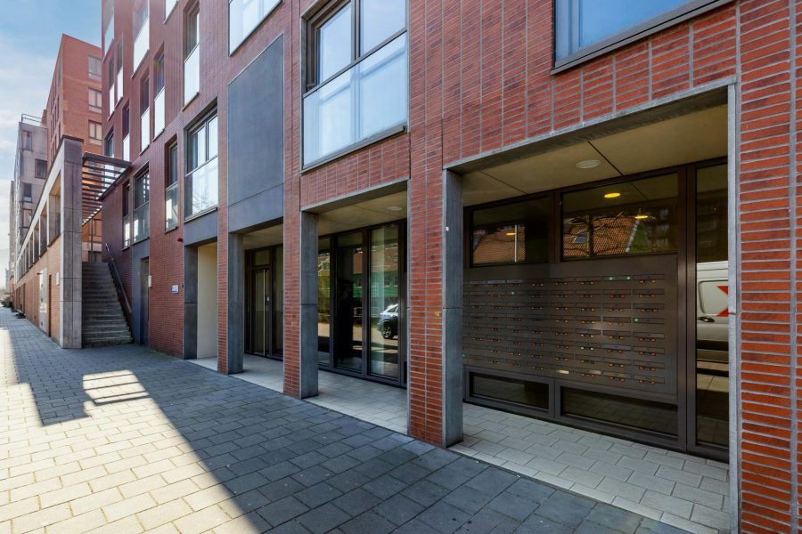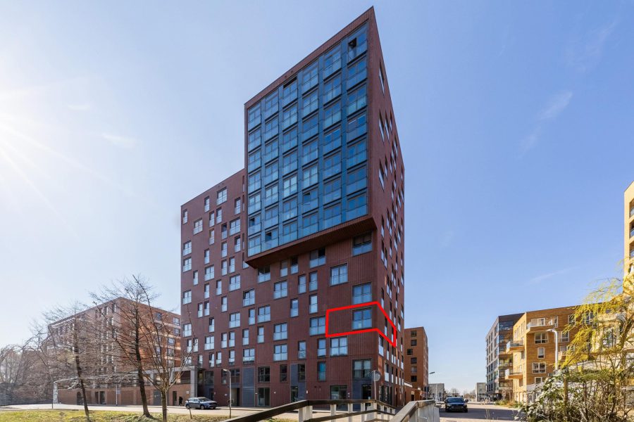 Met de lift bereik je de voordeur van de woning. Entree met garderobe en direct aan je rechterhand tref je de badkamer aan. De badkamer is voorzien van een badmeubel met wastafel en spiegel, een zwevend toilet en een inloopdouche. Deze hal staat in open verbinding met de gang. In de gang is een bergkast met de aansluiting voor de wasmachine te vinden, een meterkast met de technische installatie en de open toegang tot de woonkamer met open keuken. De woonkamer heeft twee hoge raampartijen met naar binnen draaiende deuren. De rechte keuken heeft witte fronten en is voorzien van inbouwapparatuur. De slaapkamer heeft eveneens een hoge raampartij. Er is ruimte genoeg voor een 2-persoonsbed en een brede kledingkast (Ikea, blijft achter). In de woning ligt een drempelloze laminaatvloer en de muren en plafonds zijn strak en neutraal afgewerkt.