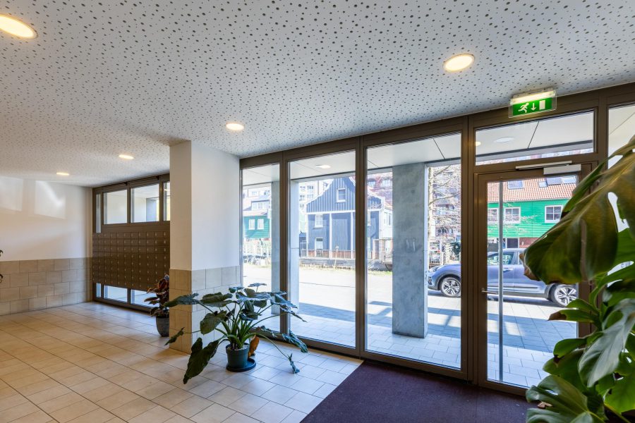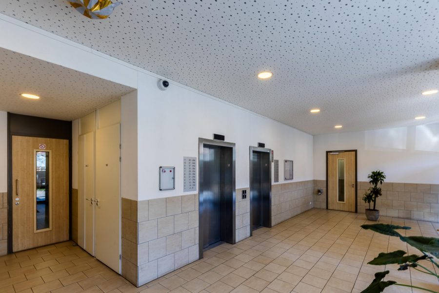 Gesloten entree met bel en intercom. Gemeenschappelijke hal met trappenhuis en liften.