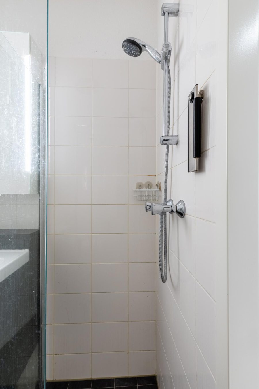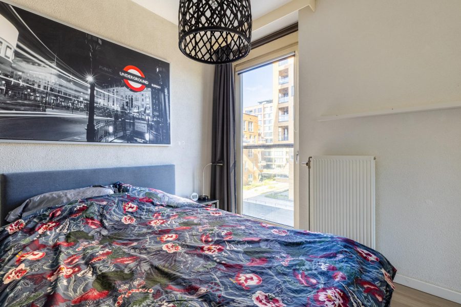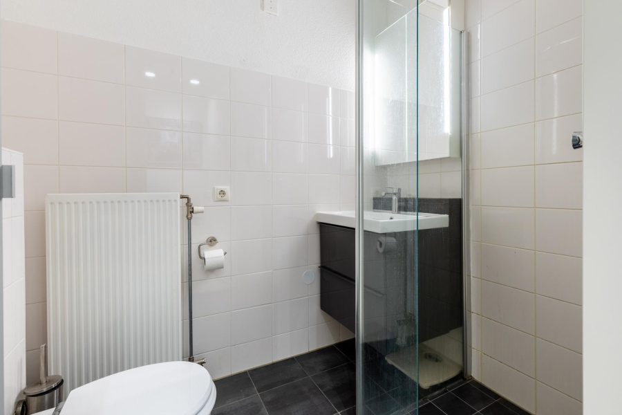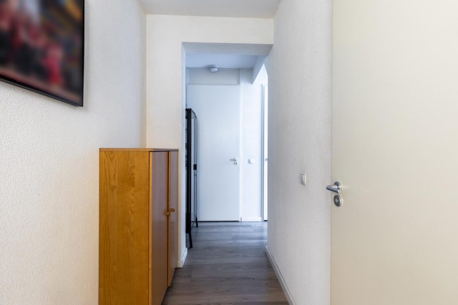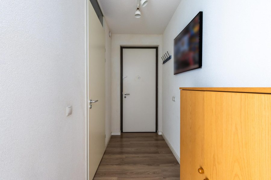 With the lift you reach the front door of the apartment. Entrance with cloakroom and immediately to your right you will find the bathroom. The bathroom has a vanity unit with sink and mirror, a floating toilet and a walk-in shower. This hallway is open to the corridor. In the hallway you will find a storage closet with the connection for the washing machine, a meter closet with the technical installation and open access to the living room with open kitchen. The living room has two high windows with inward-swinging door. The straight kitchen has white fronts and is equipped with built-in appliances. The bedroom also has a high window. There is enough space for a double bed and a wide wardrobe (Ikea, stays behind). The apartment has barrier-free laminate flooring and the walls and ceilings are finished sleek and neutral.