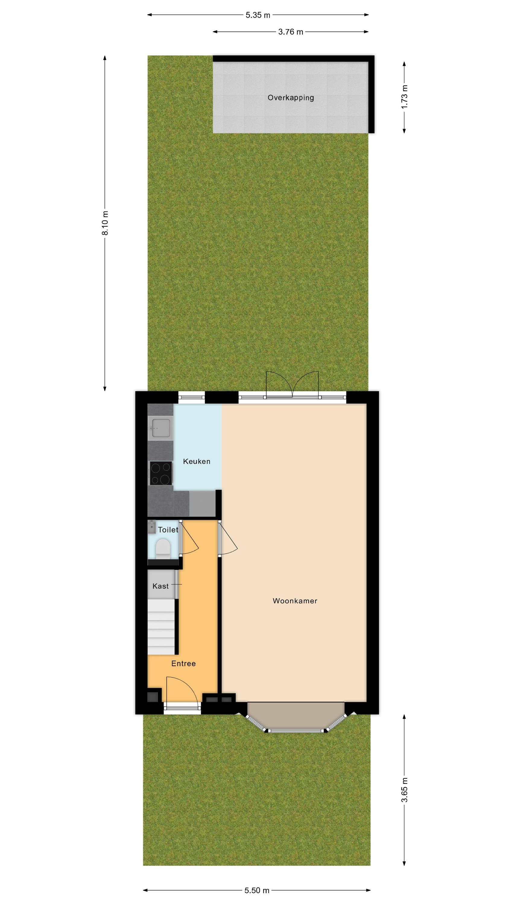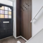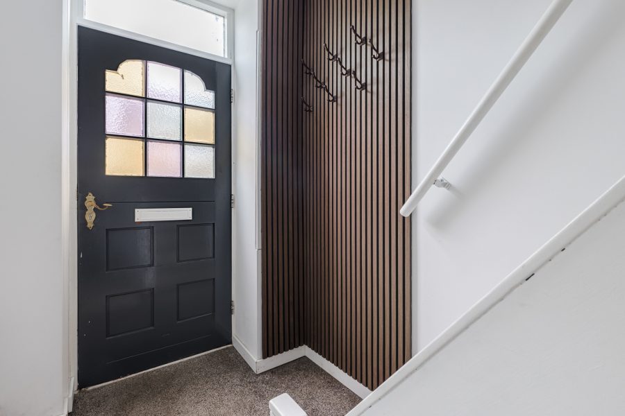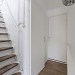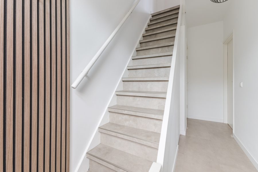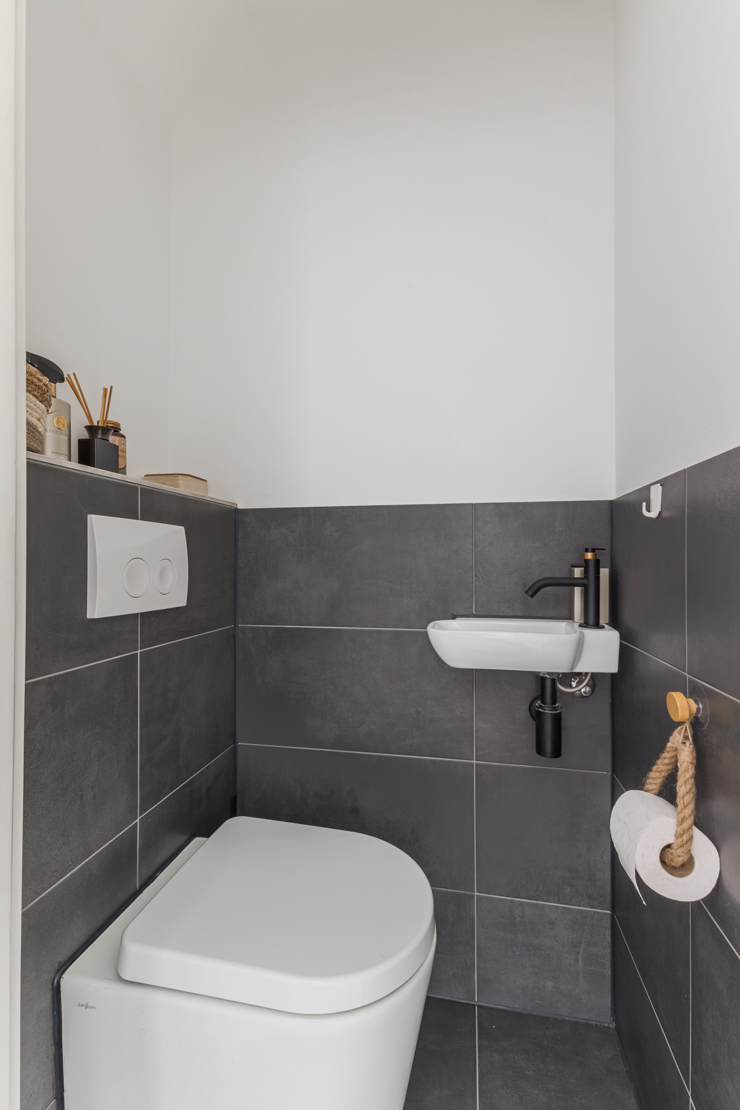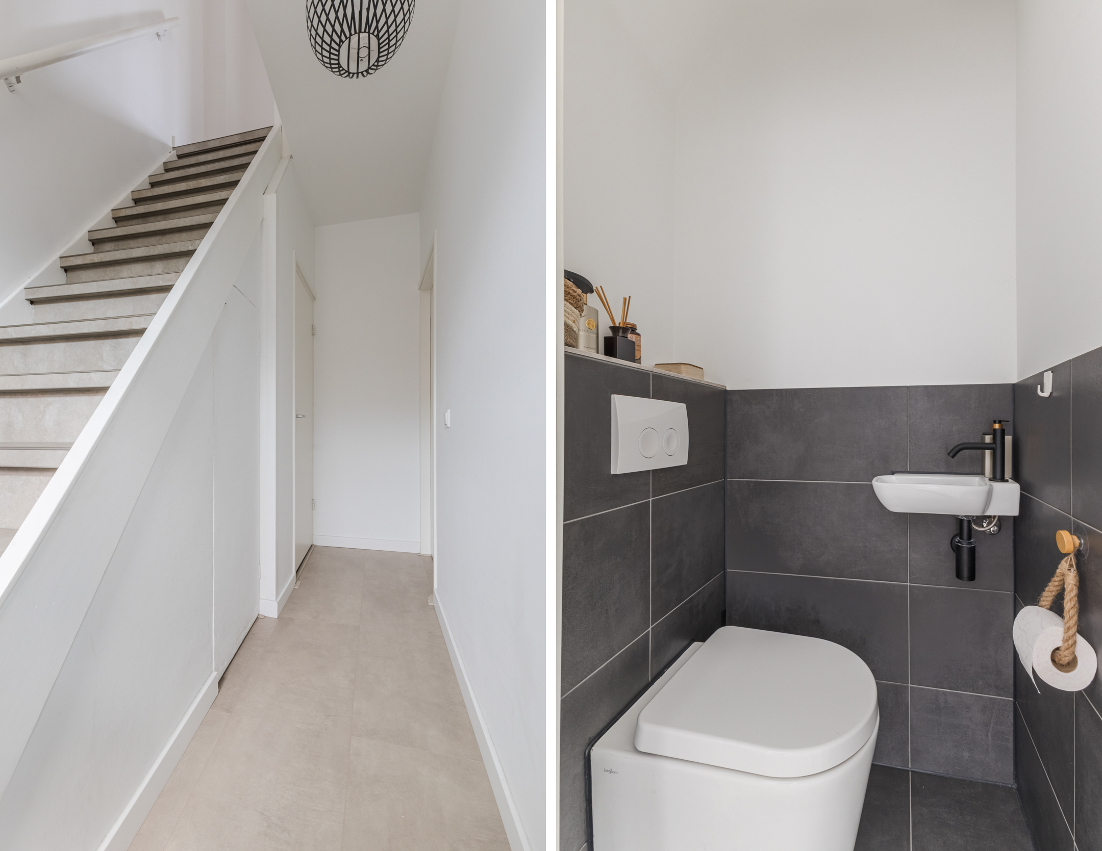 Via de ruime, betegelde voortuin bereik je de voordeur van deze fijne tussenwoning. Achter de voordeur bevindt zich de entreehal, die strak is afgewerkt en deels is voorzien van wandpanelen. Vanuit hier heb je toegang tot de trap naar de eerste verdieping, een bergkast, een toiletruimte met zwevend toilet en fonteintje, en de woonkamer.